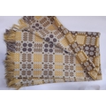 Good quality Welsh blanket with reversible double weave, colours are gold, olive, mink and white, 236x 200cm (excl fringe) Condition report available.
