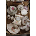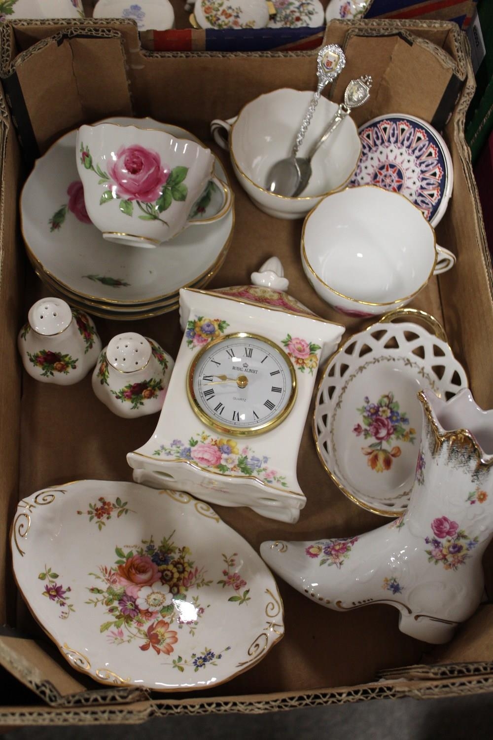 A SMALL TRAY OF ASSORTED CERAMICS TO INCLUDE A ROYAL ALBERT LADY CARLISLE CLOCK, DRESDEN STYLE CUPS AND SAUCERS ETC.