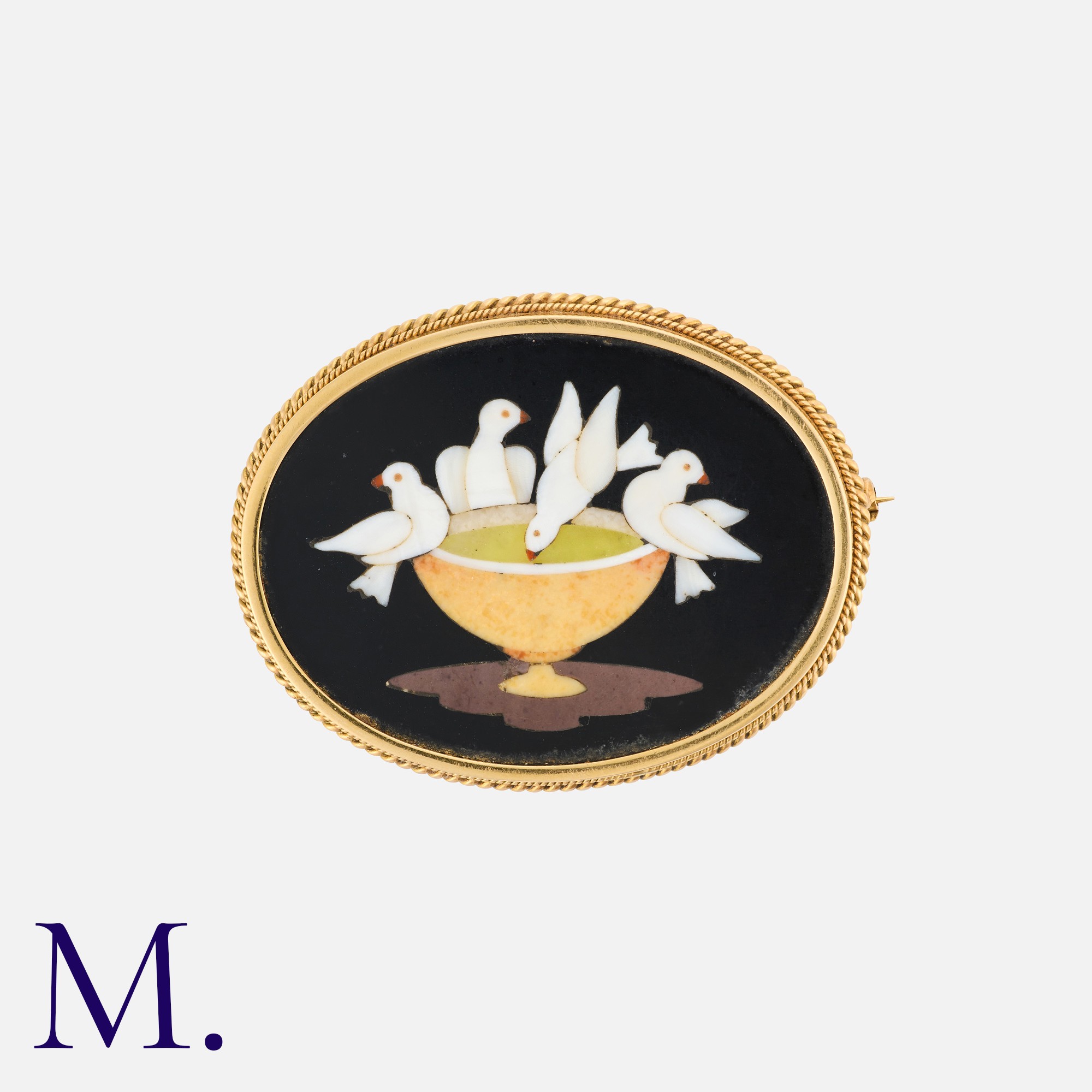 An Pietra Dura Brooch in yellow gold, depicting the doves of Pliny, the gold wirework mount stamped 750 for 18 carat.