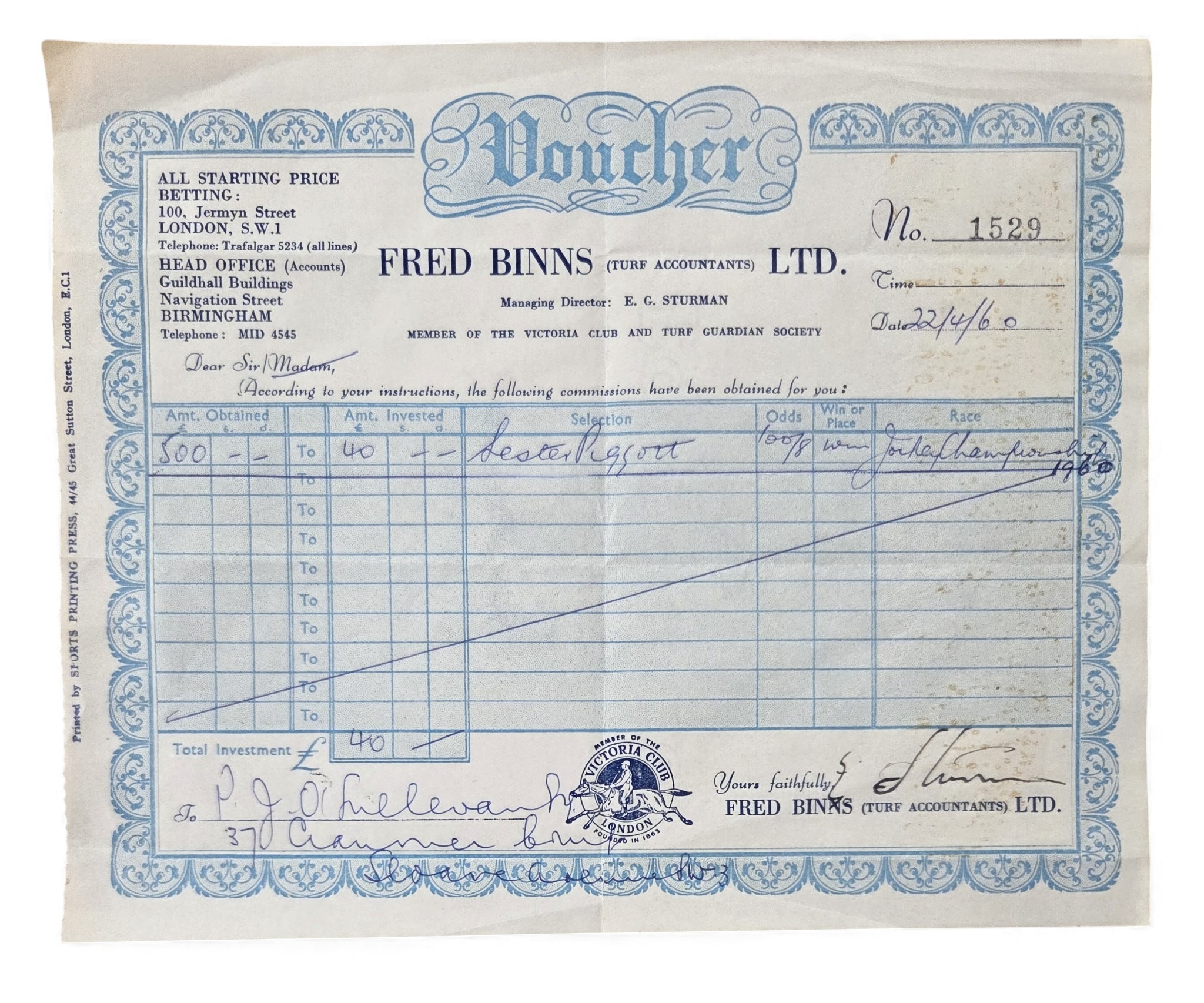 A Fred Binns (Turf Accountant) Ltd Voucher/Betting slip where Peter O'Sullevan places a £40 to win £500 bet on Lester Piggott to be champion jockey along with a photographic print.