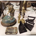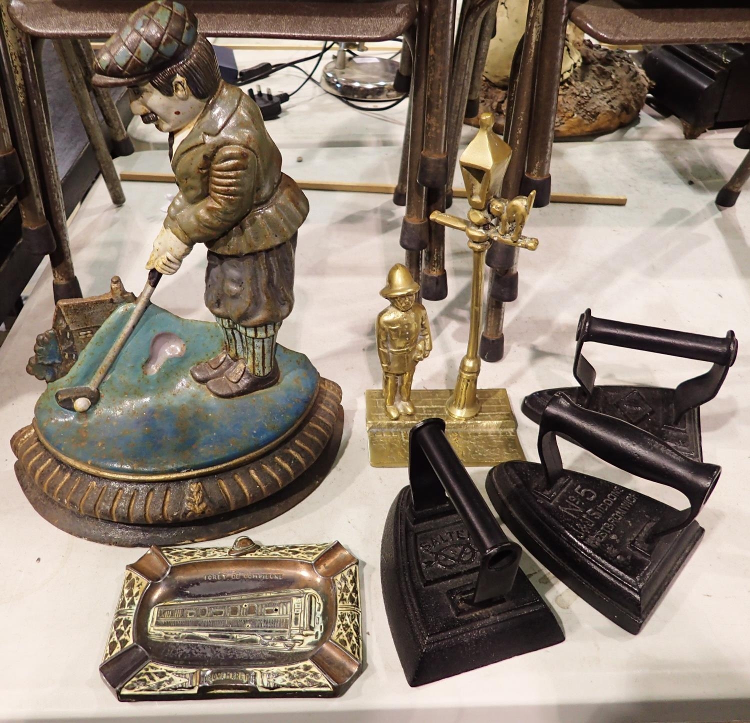 Mixed metalware including irons, brass and a large golfer doorstop. Not available for in-house P&P