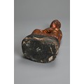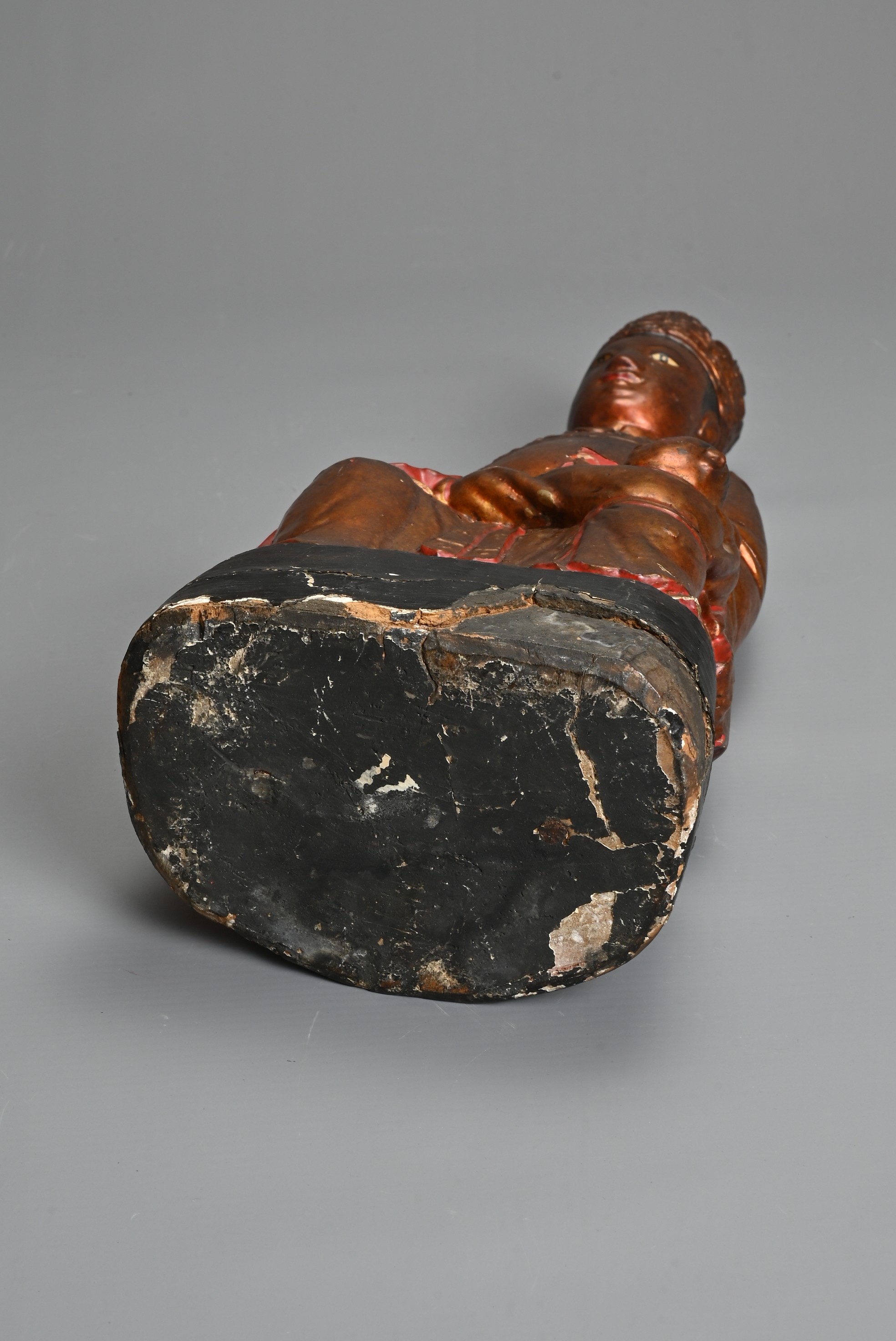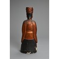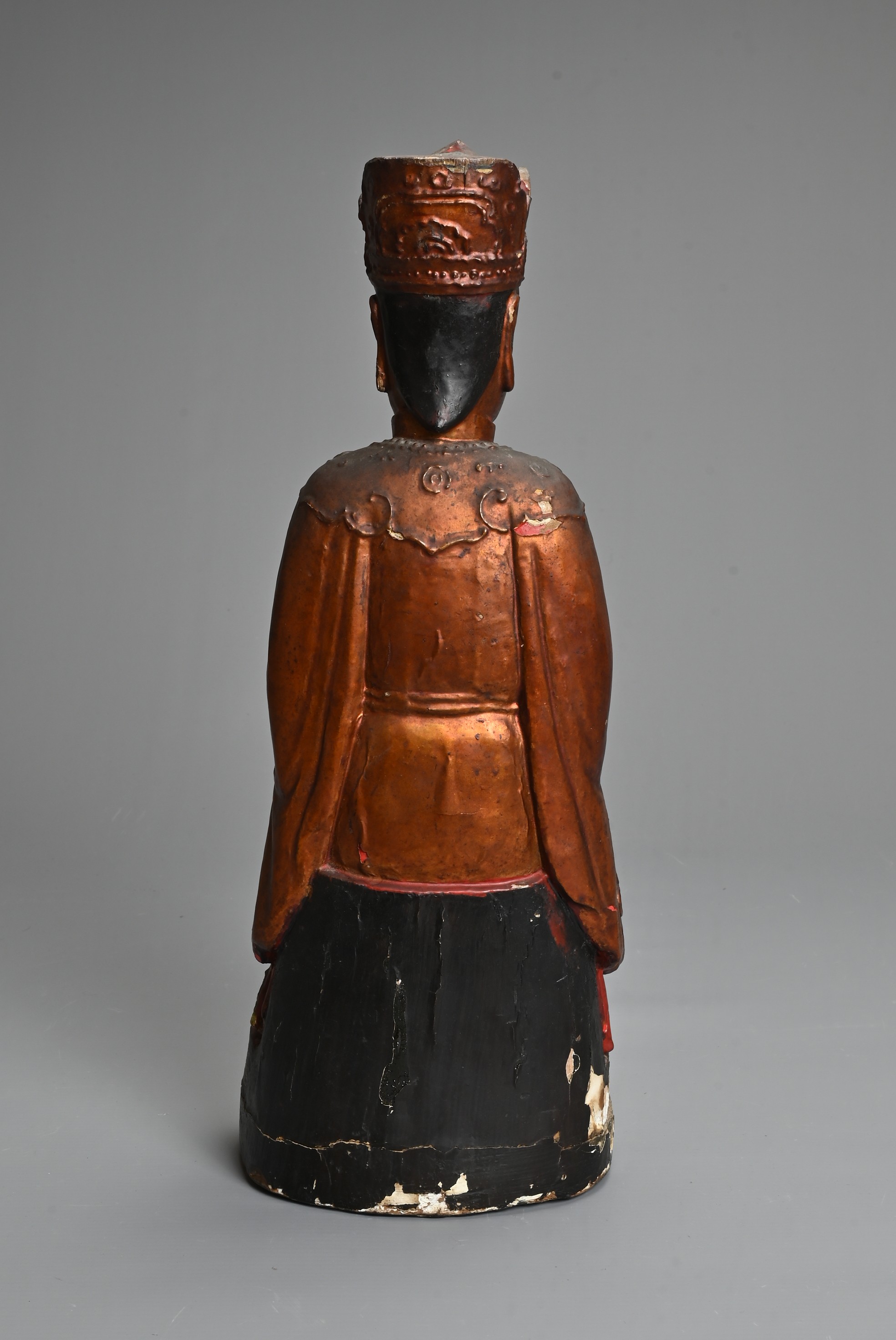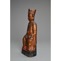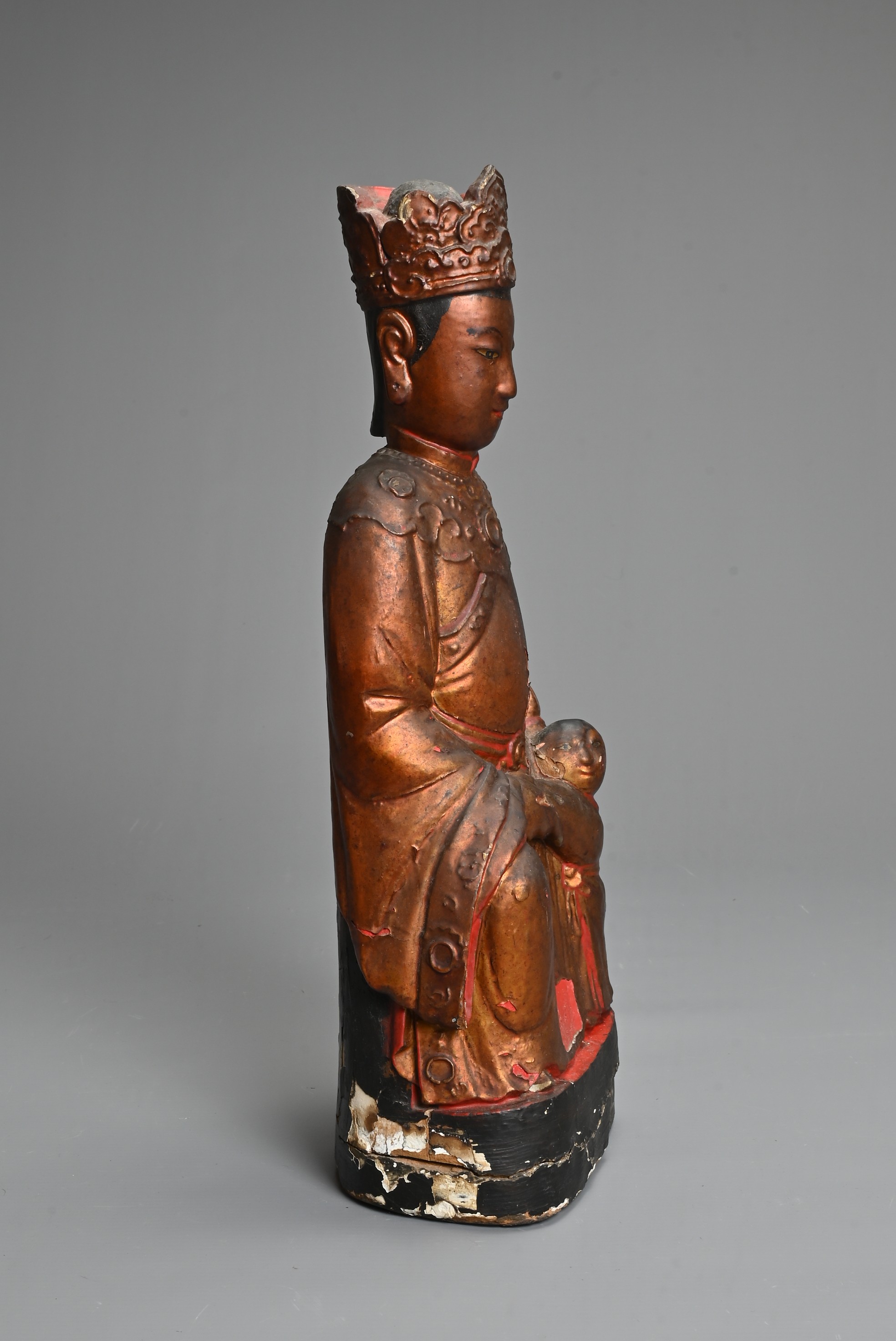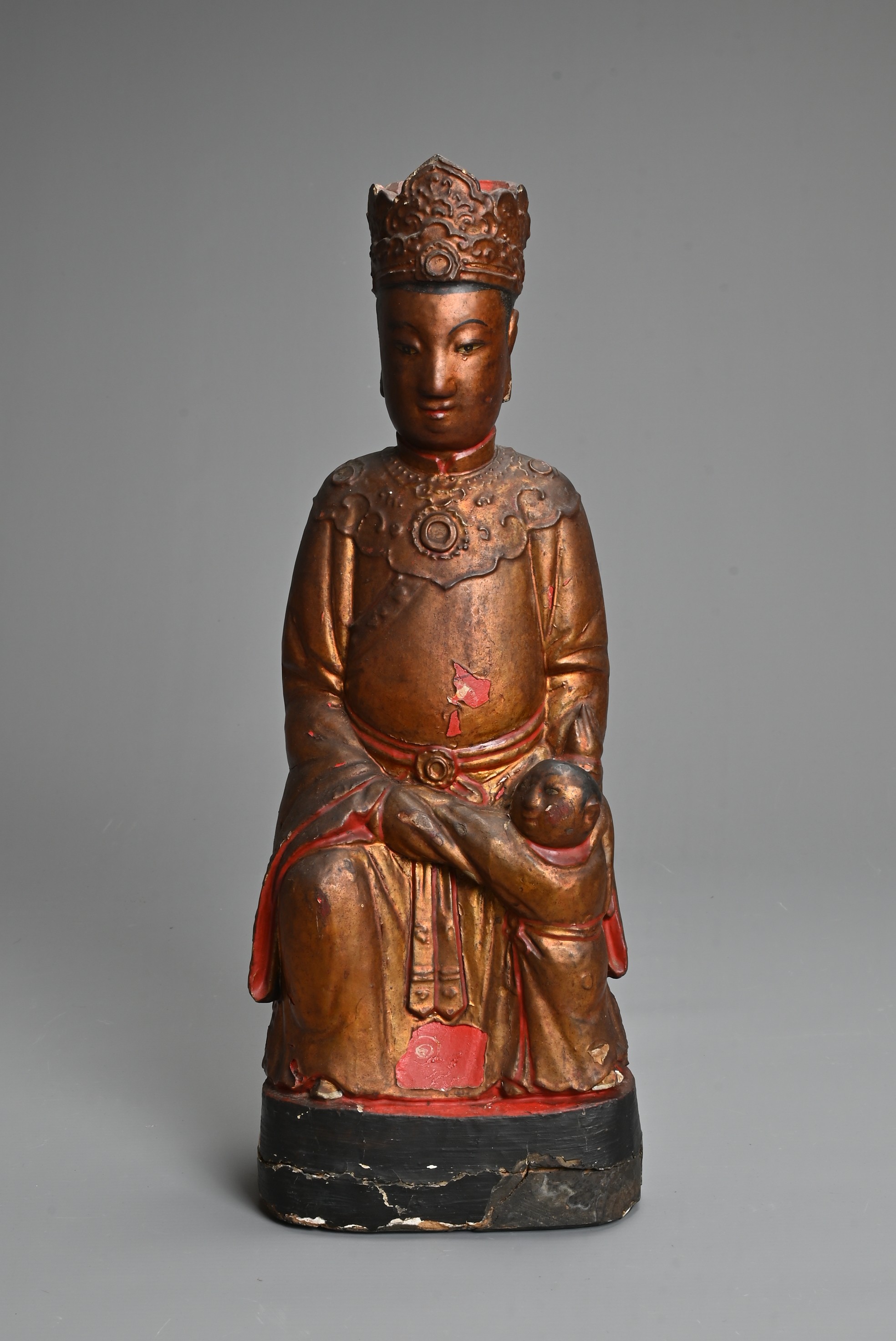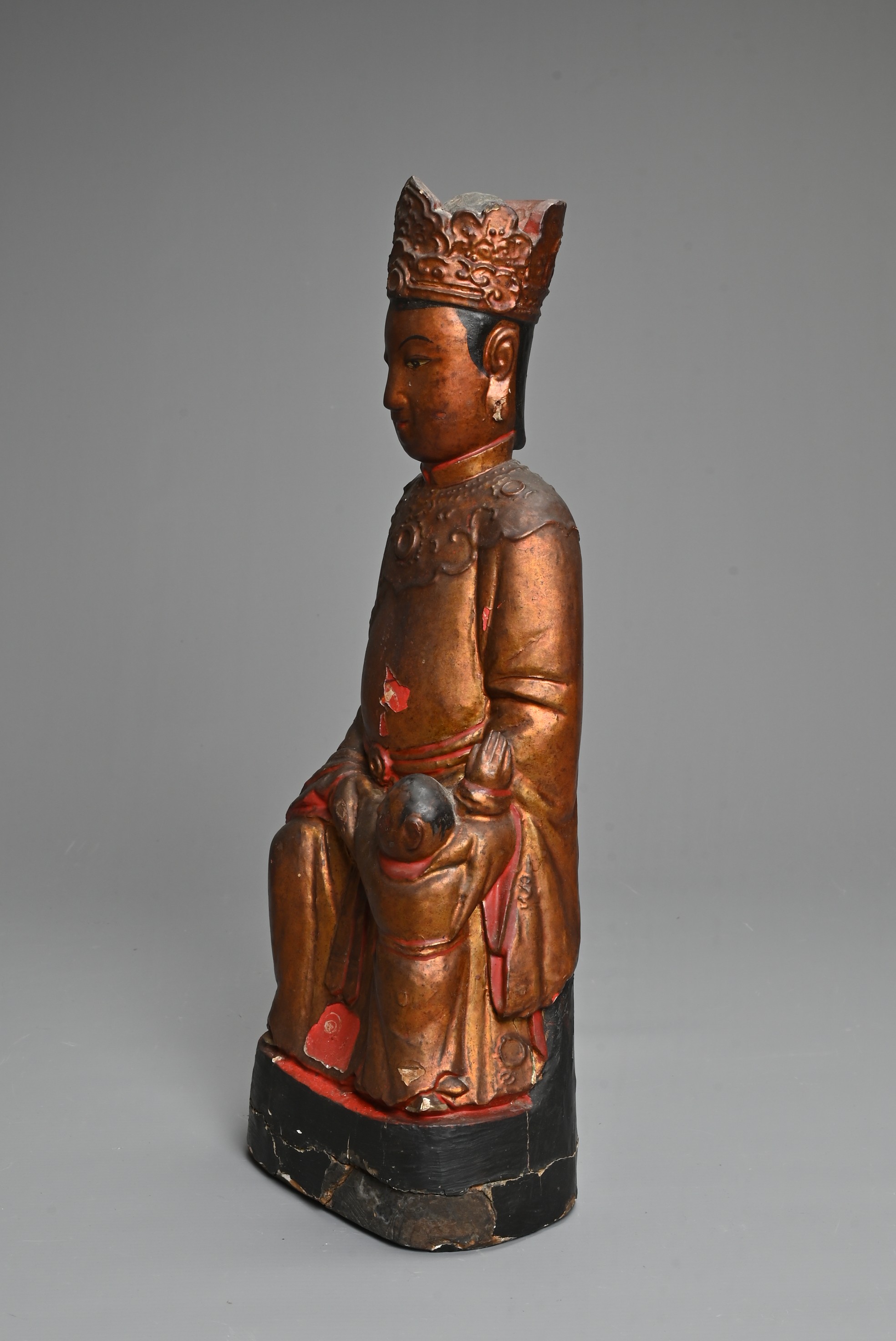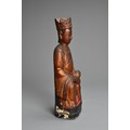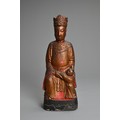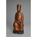 A CHINESE LACQUERED AND GILT WOOD FIGURE, MING DYNASTY. The figure seated dressed in robes with a boy at his left knee. 38cm tall.