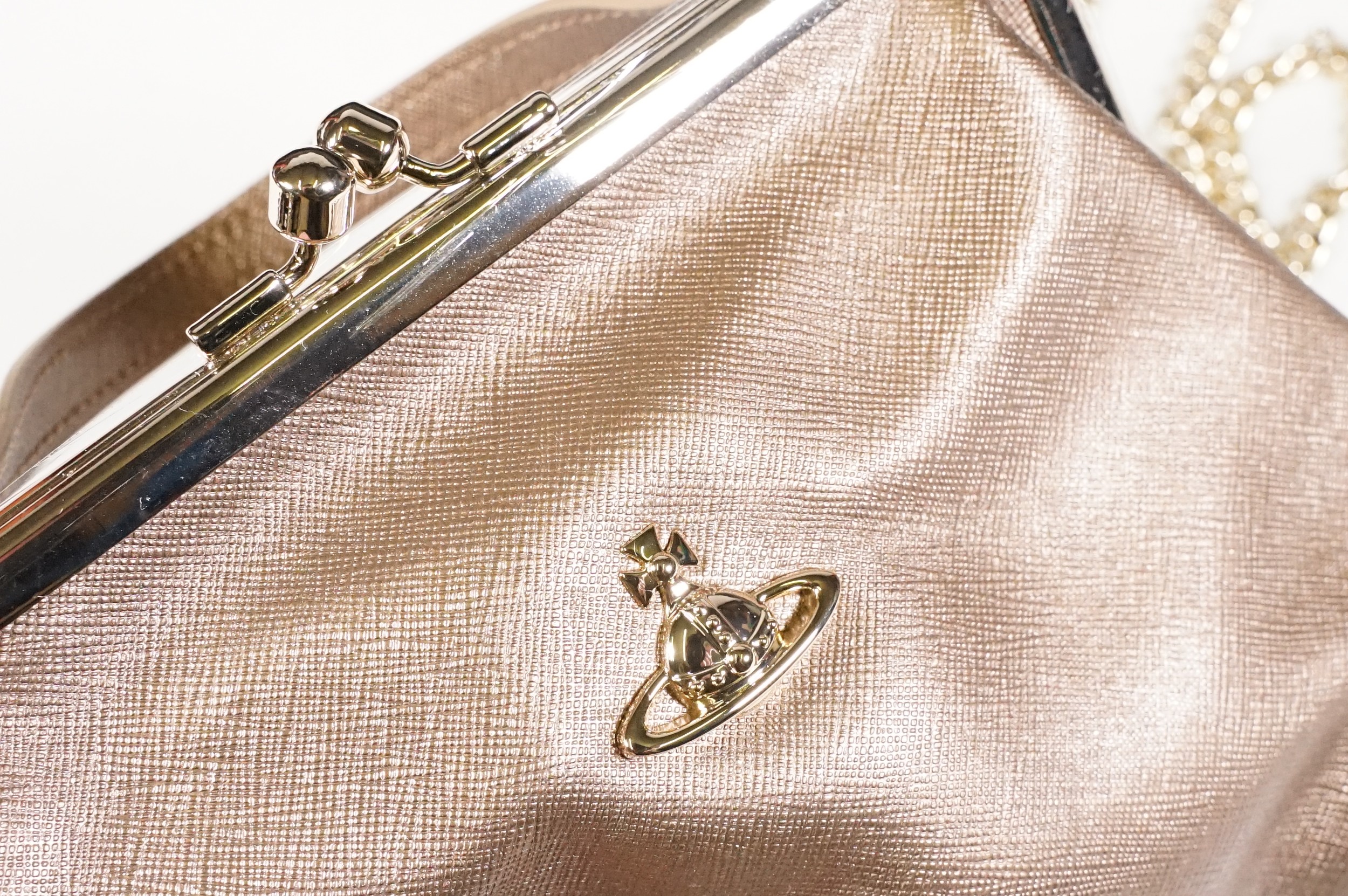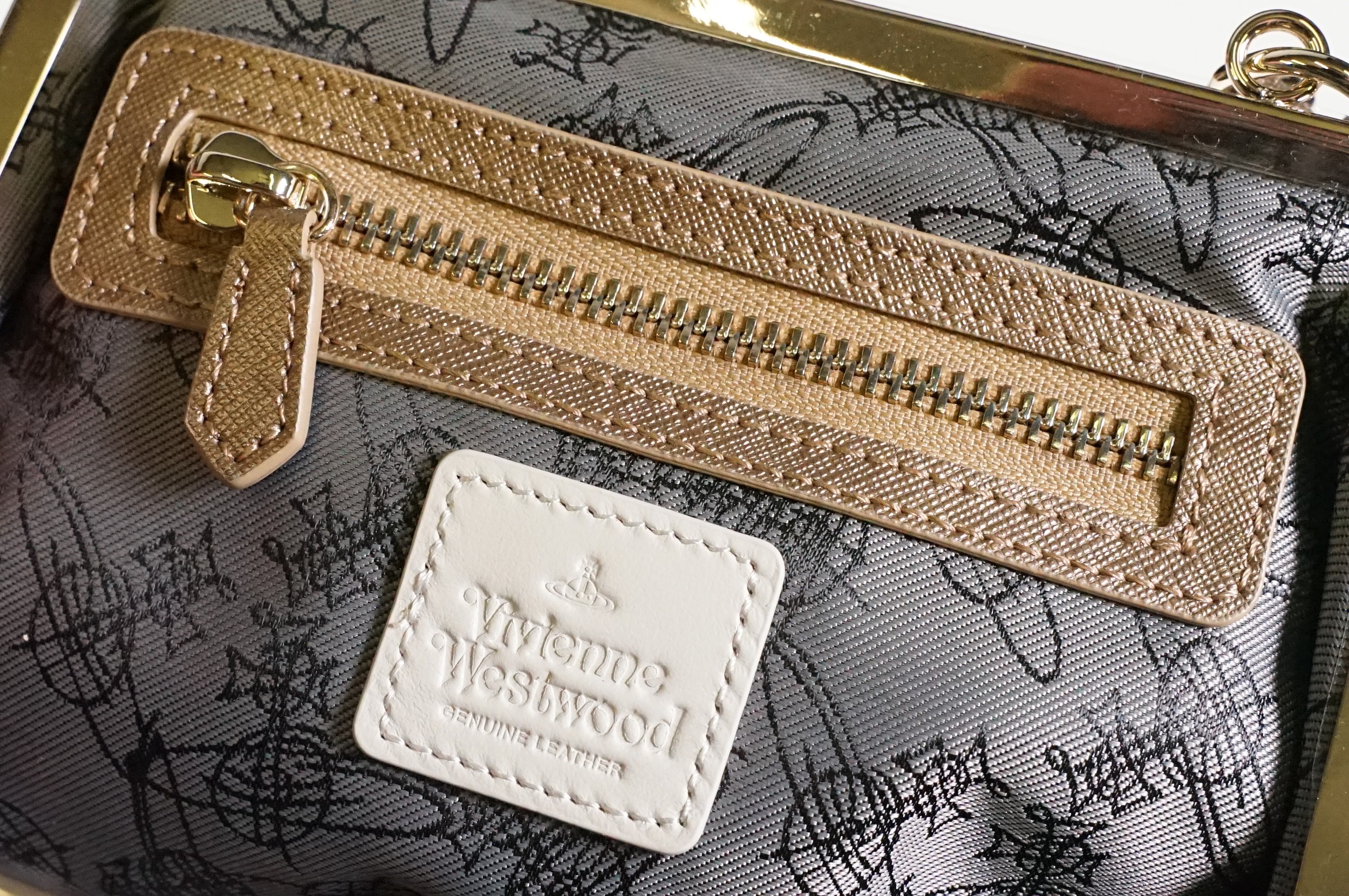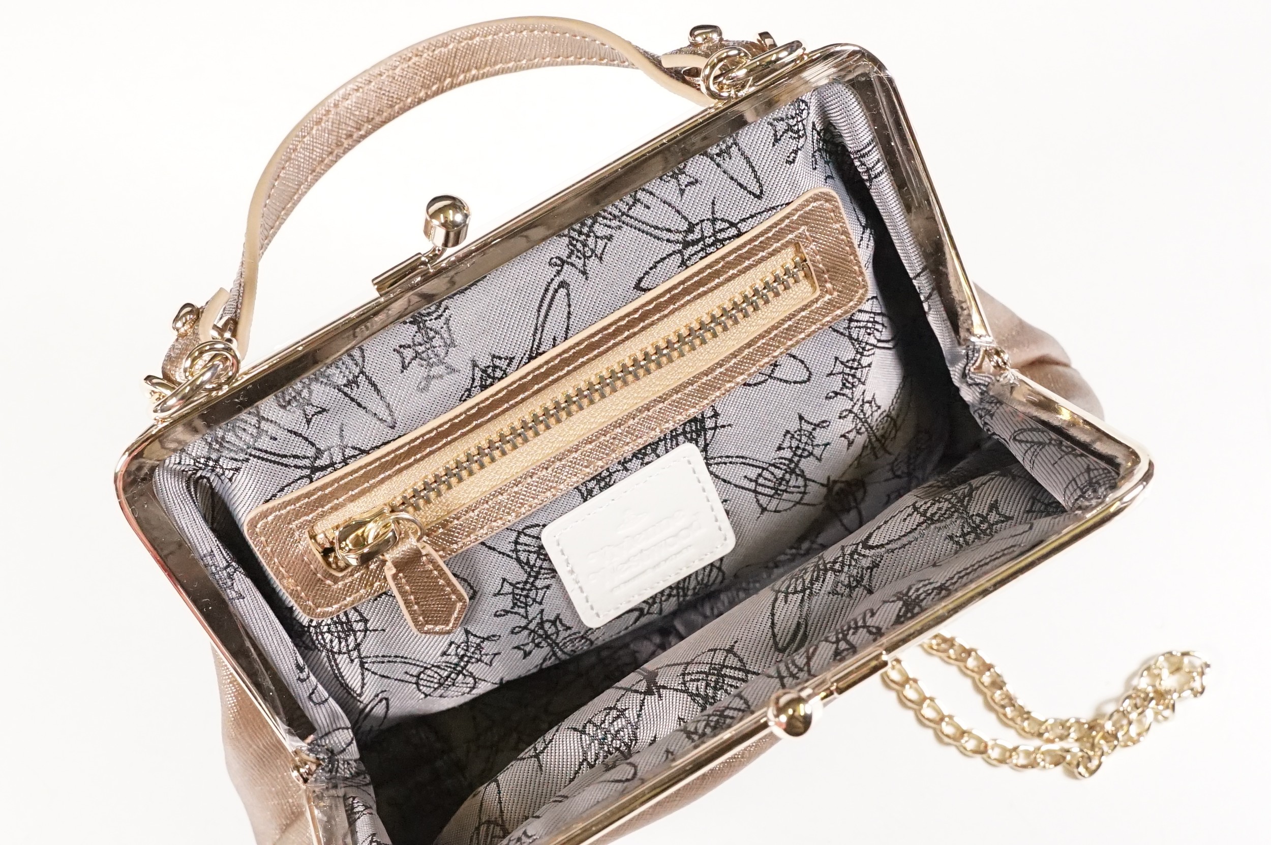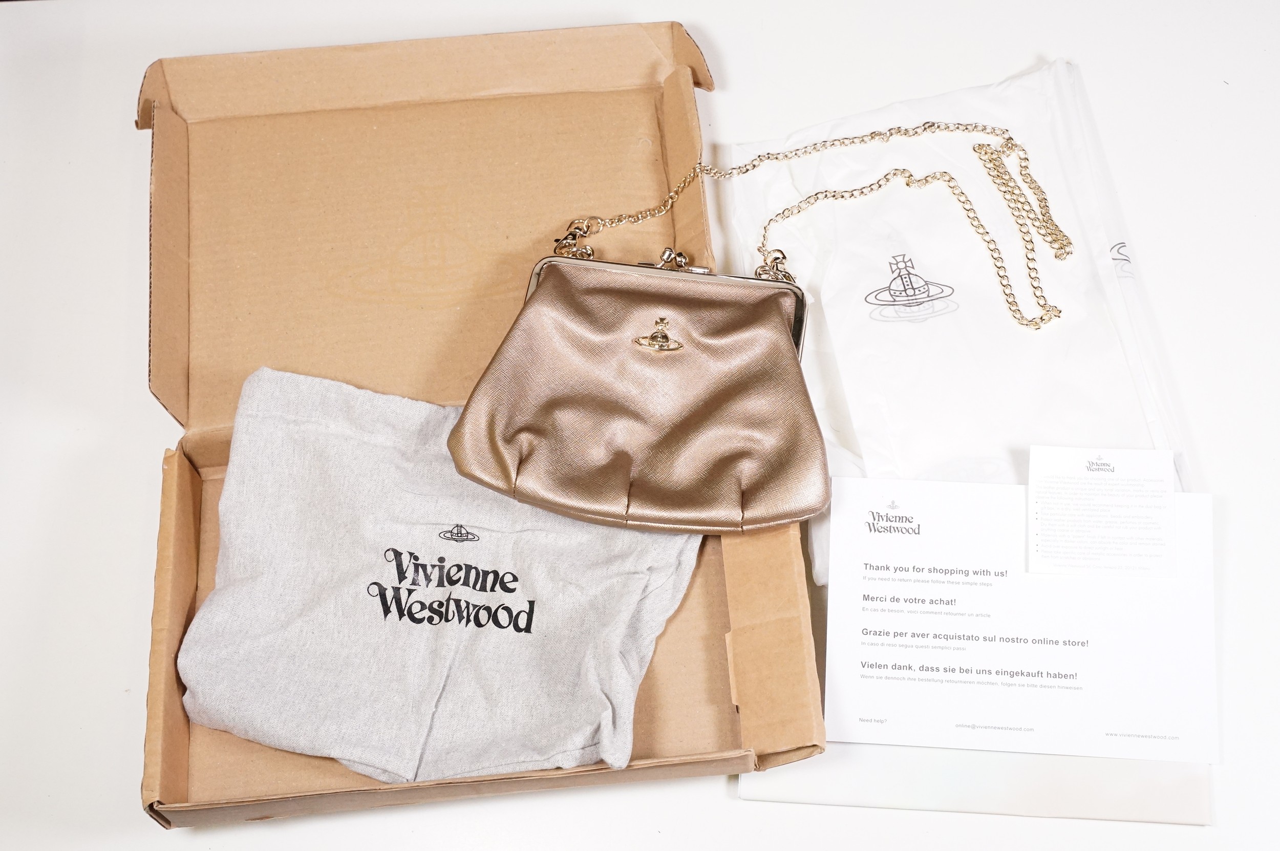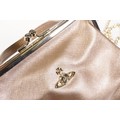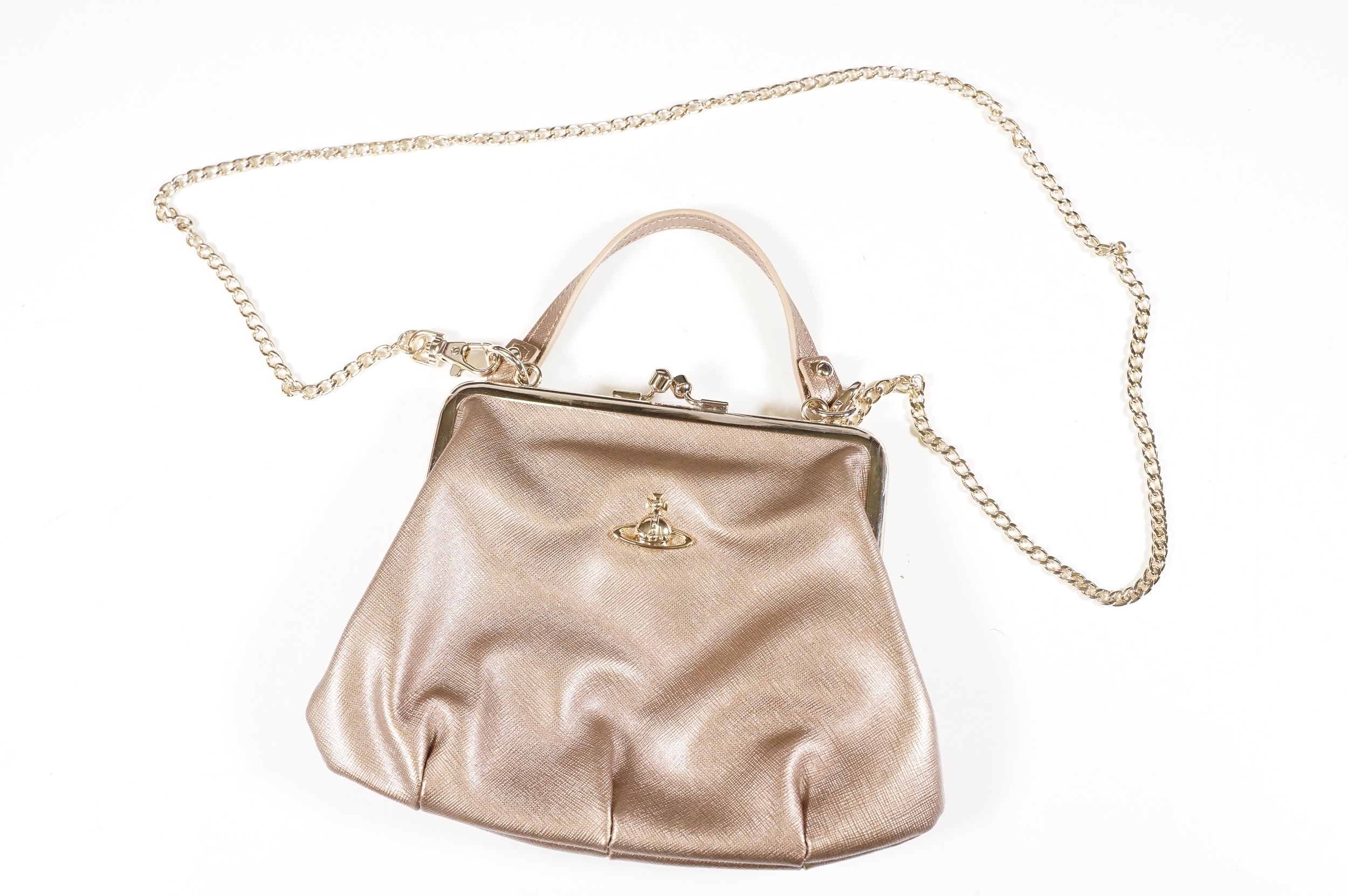 Vivienne Westwood gold metallic 'Victoria' frame logo hand bag/purse with shoulder chain, measures approx - 22cm x 18cm with original dust bag (1)