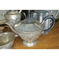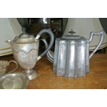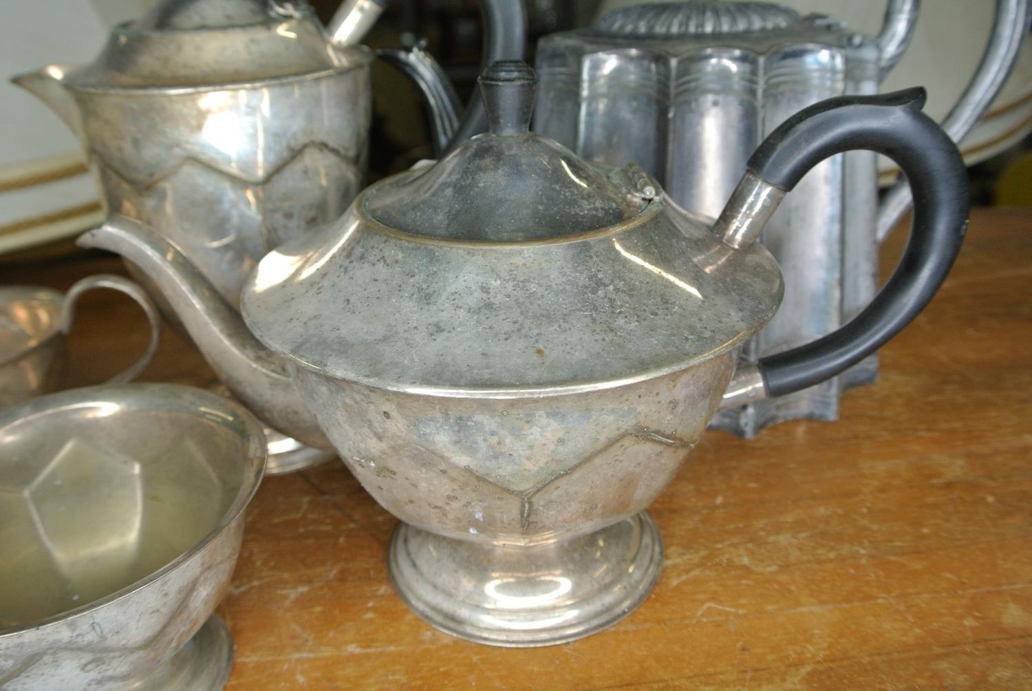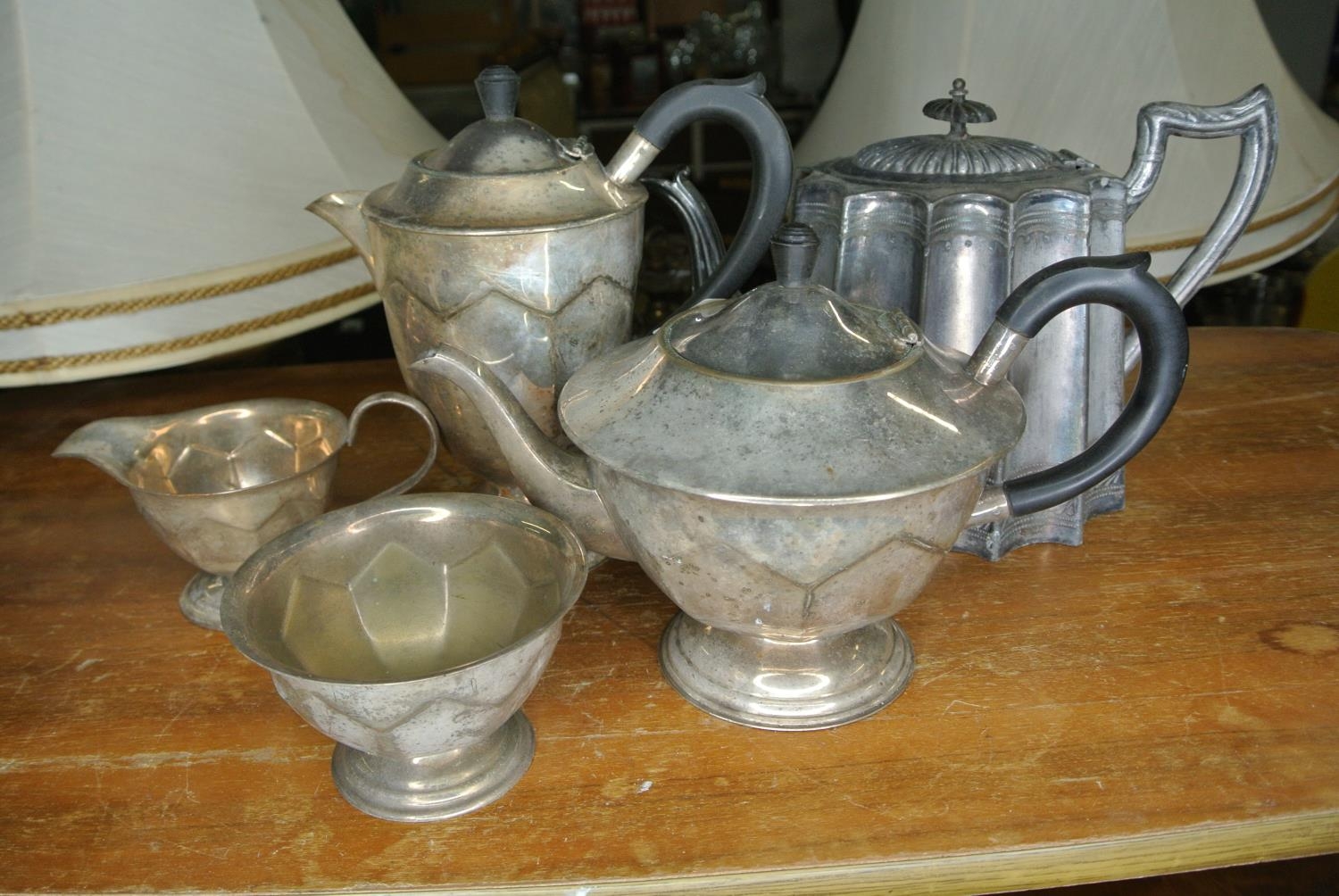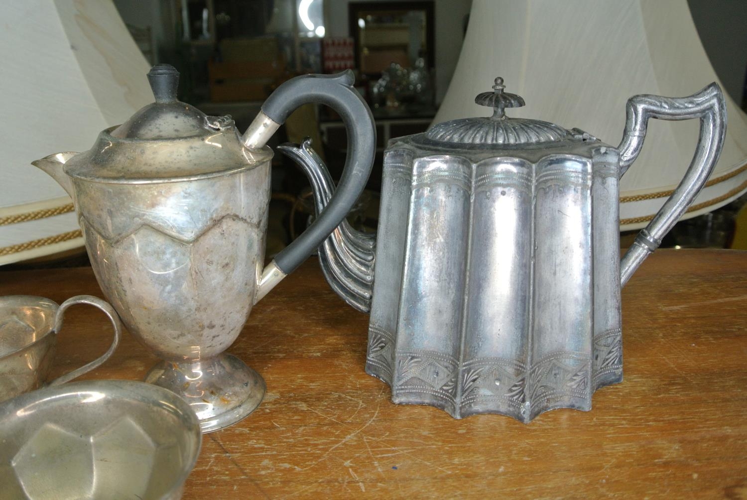 An assortment of silver plate items to include two teapots, a coffee pot, sugar bowl and milk jug.