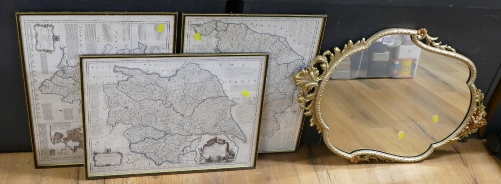 Three framed maps and ornate mirror