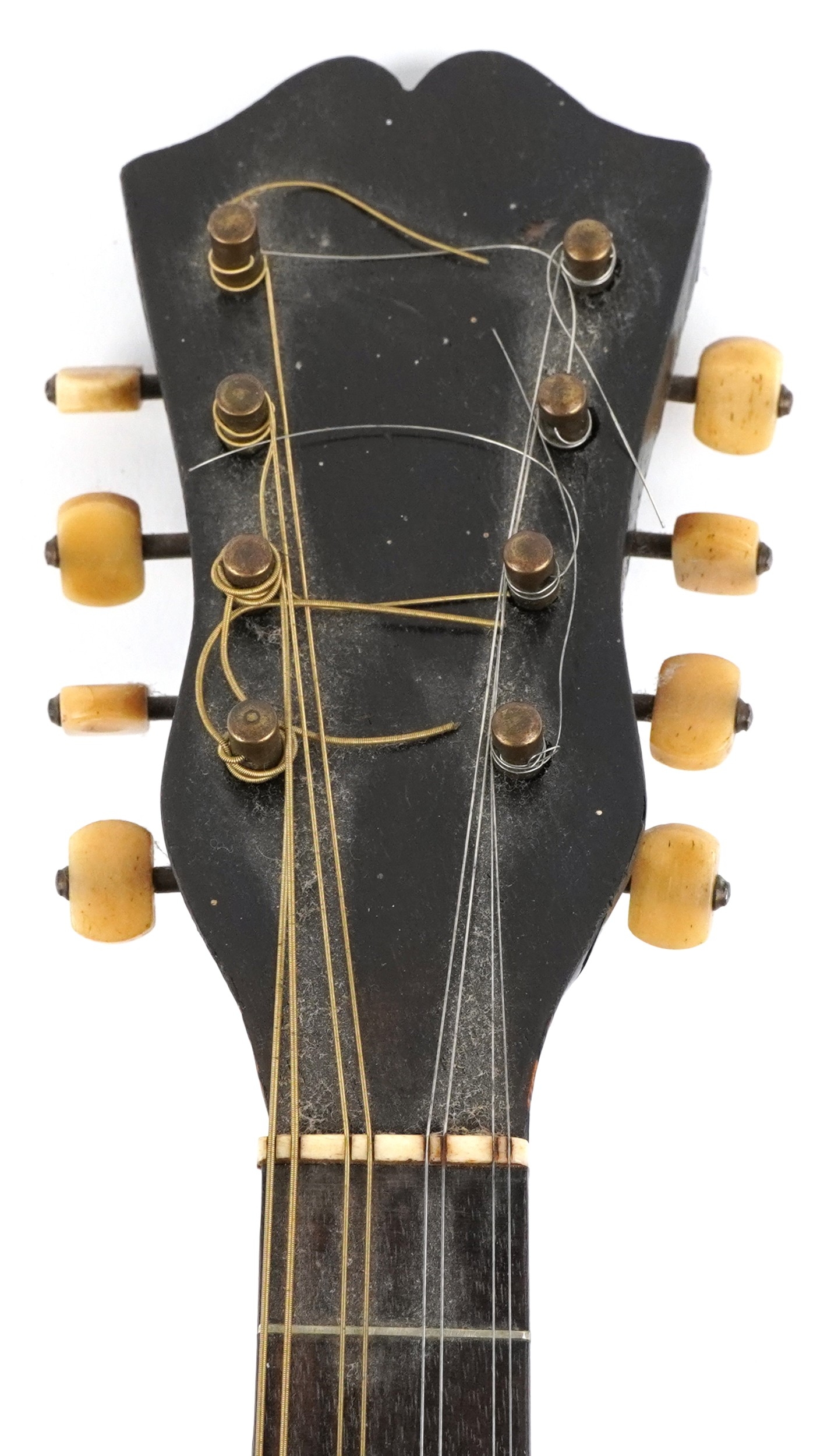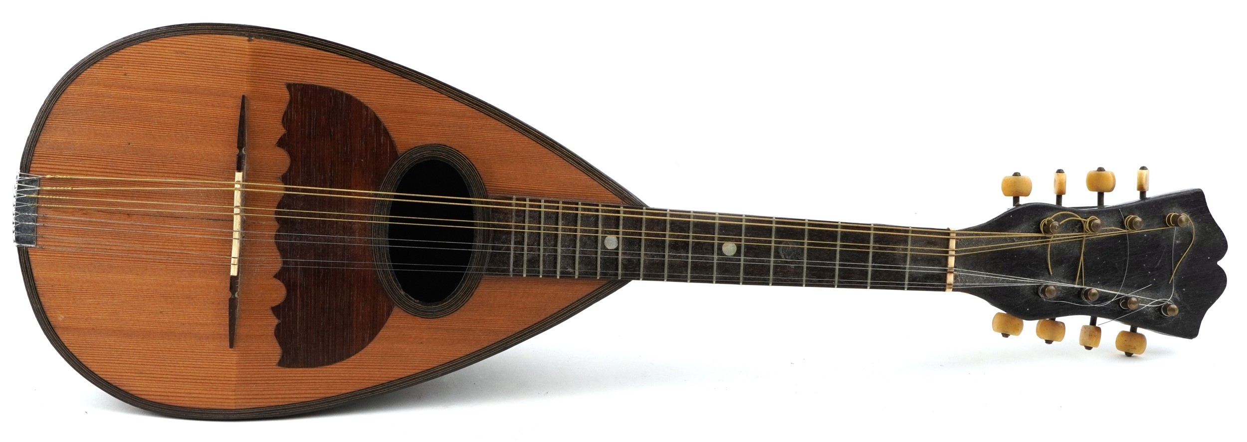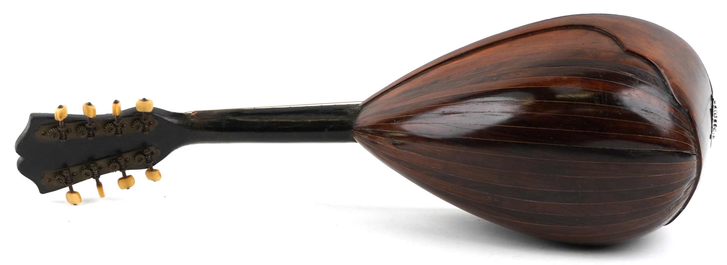 An early 20th century rosewood mandolin with bone tuning handles and mother of pearl fret markers, 61cm in length.