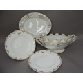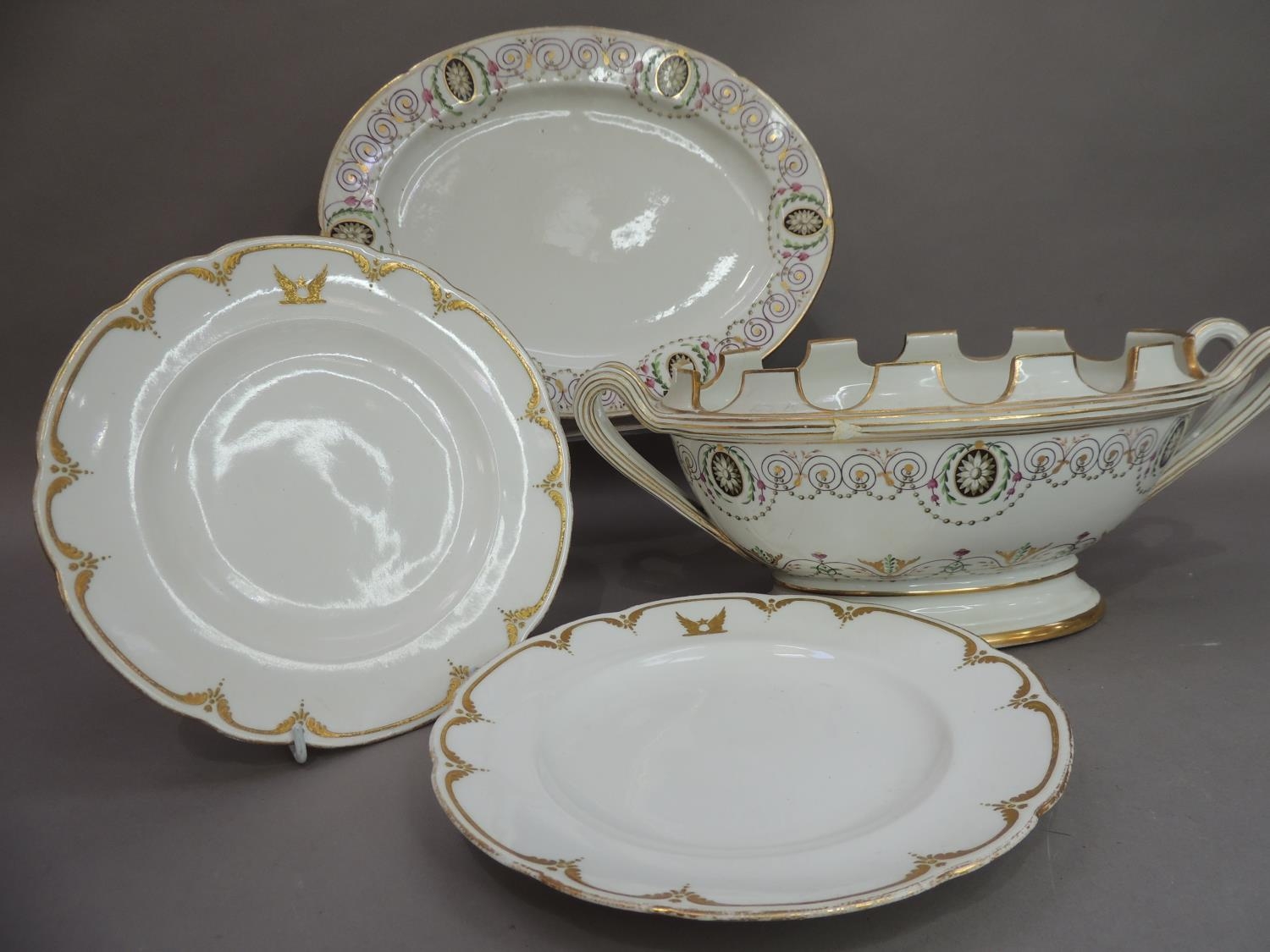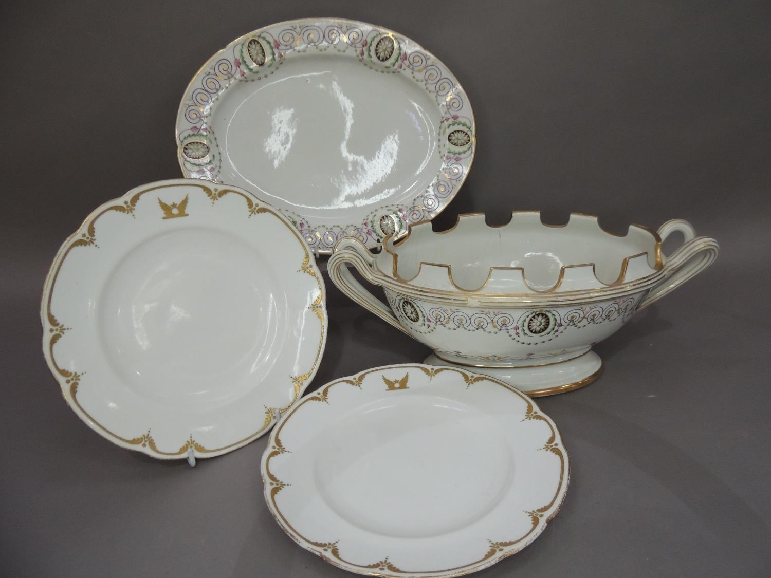 A 19th century porcelain twin handled tureen with crenallated rim raised on an oval foot rim, the body painted with a flower filled cartouche joined by swags of beads and scroll work together with a matching oval stand and a pair of white dessert plates with gilt rim line and border incorporating a crest of a star between a pair of wings (damages)