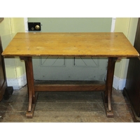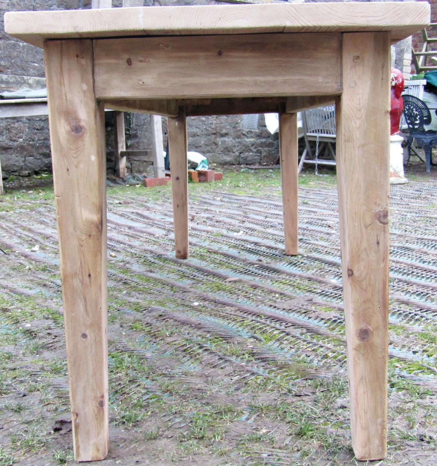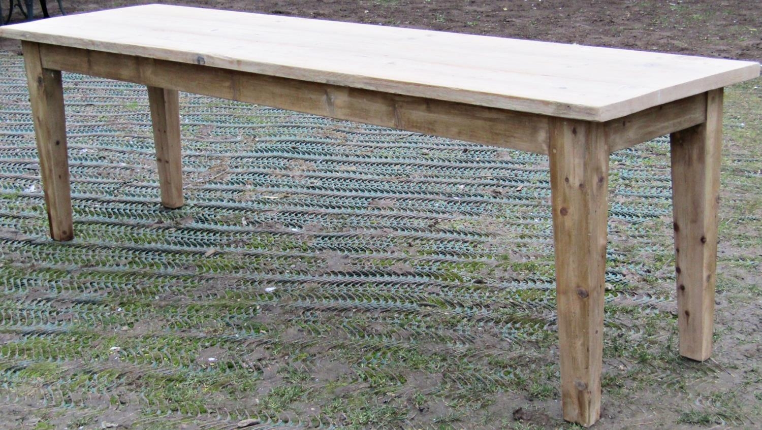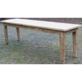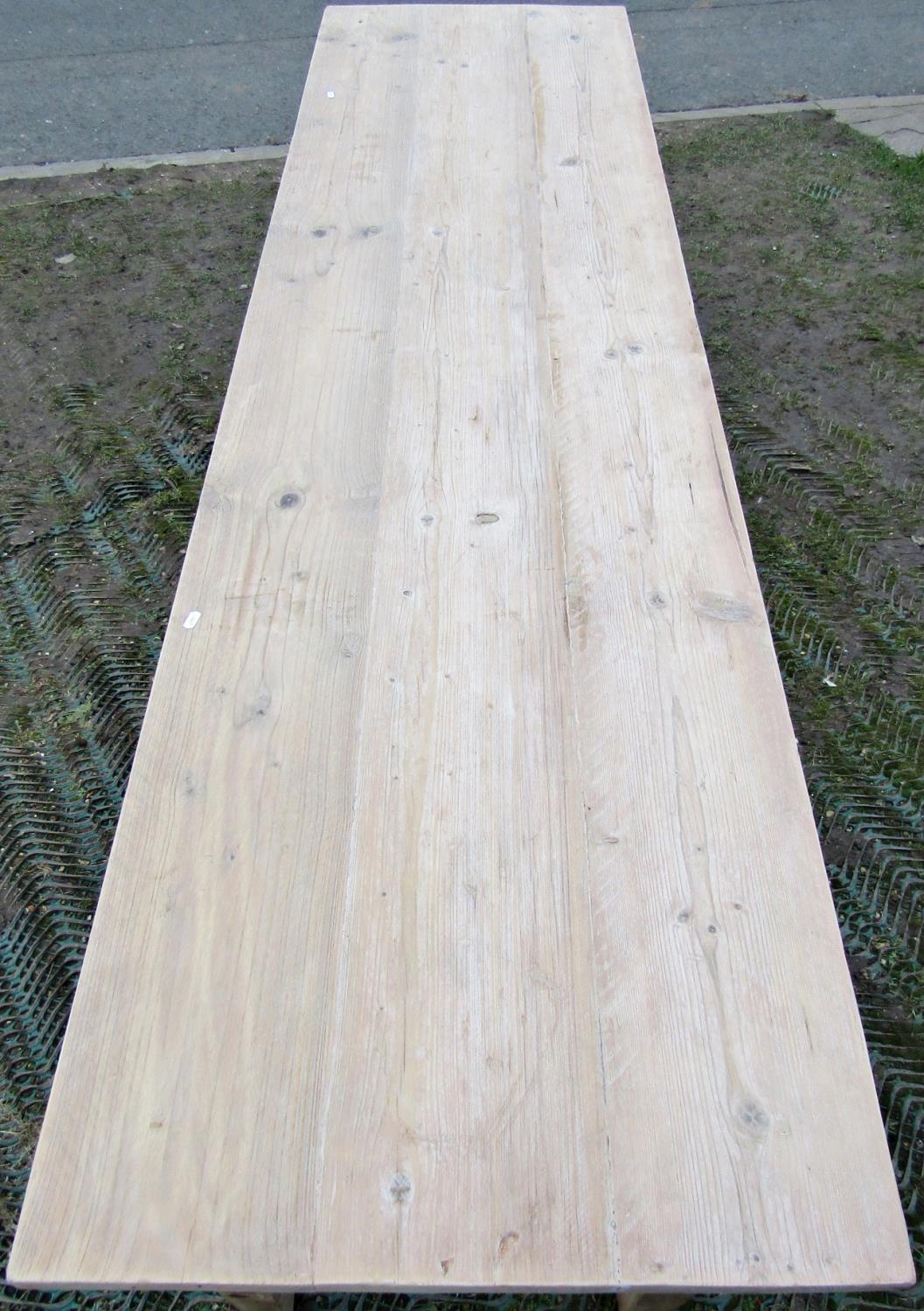 A stripped pine refectory table, the planked top raised on four square tapered supports, to seat eight, 245cm x 65cm
