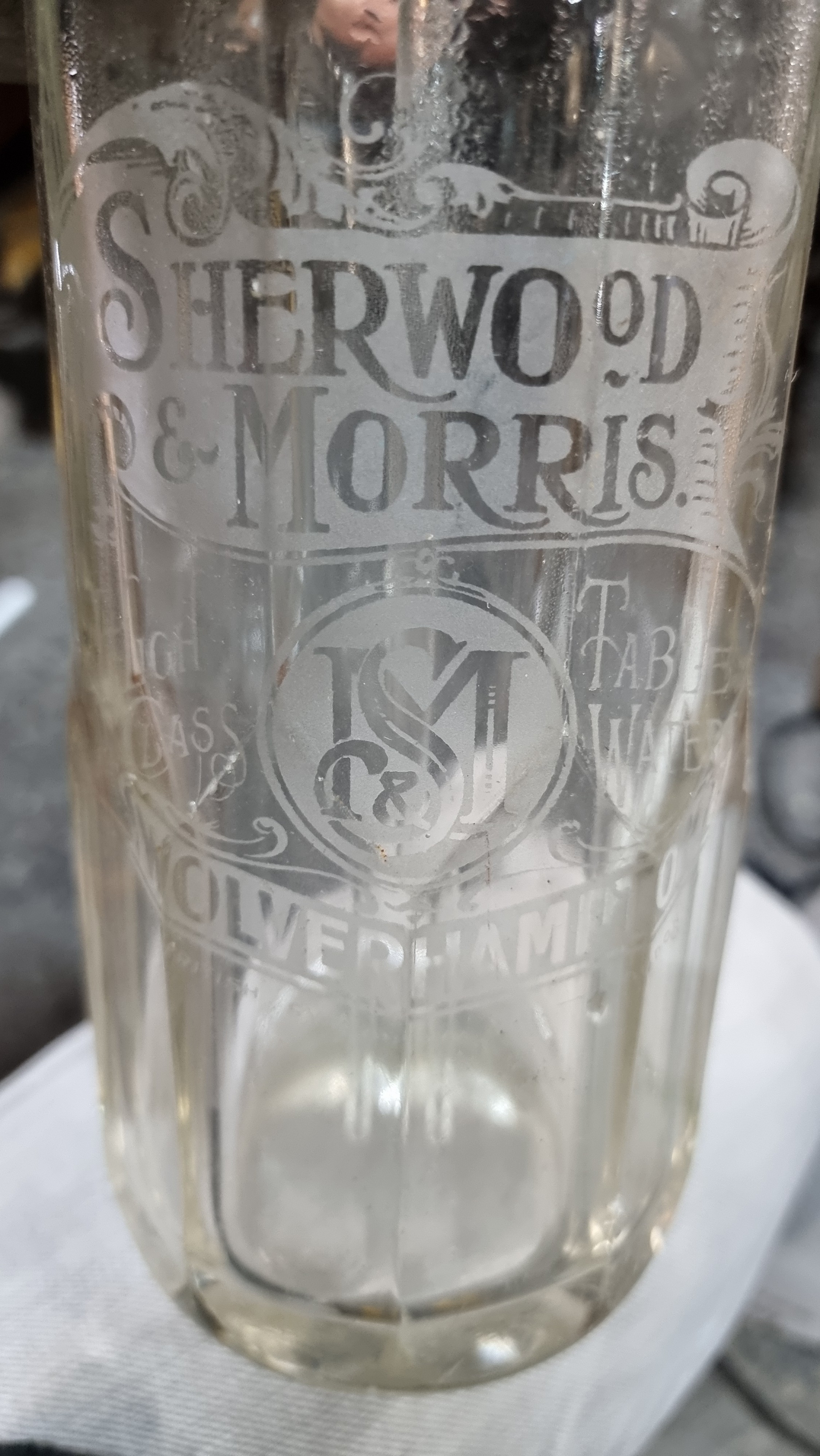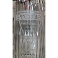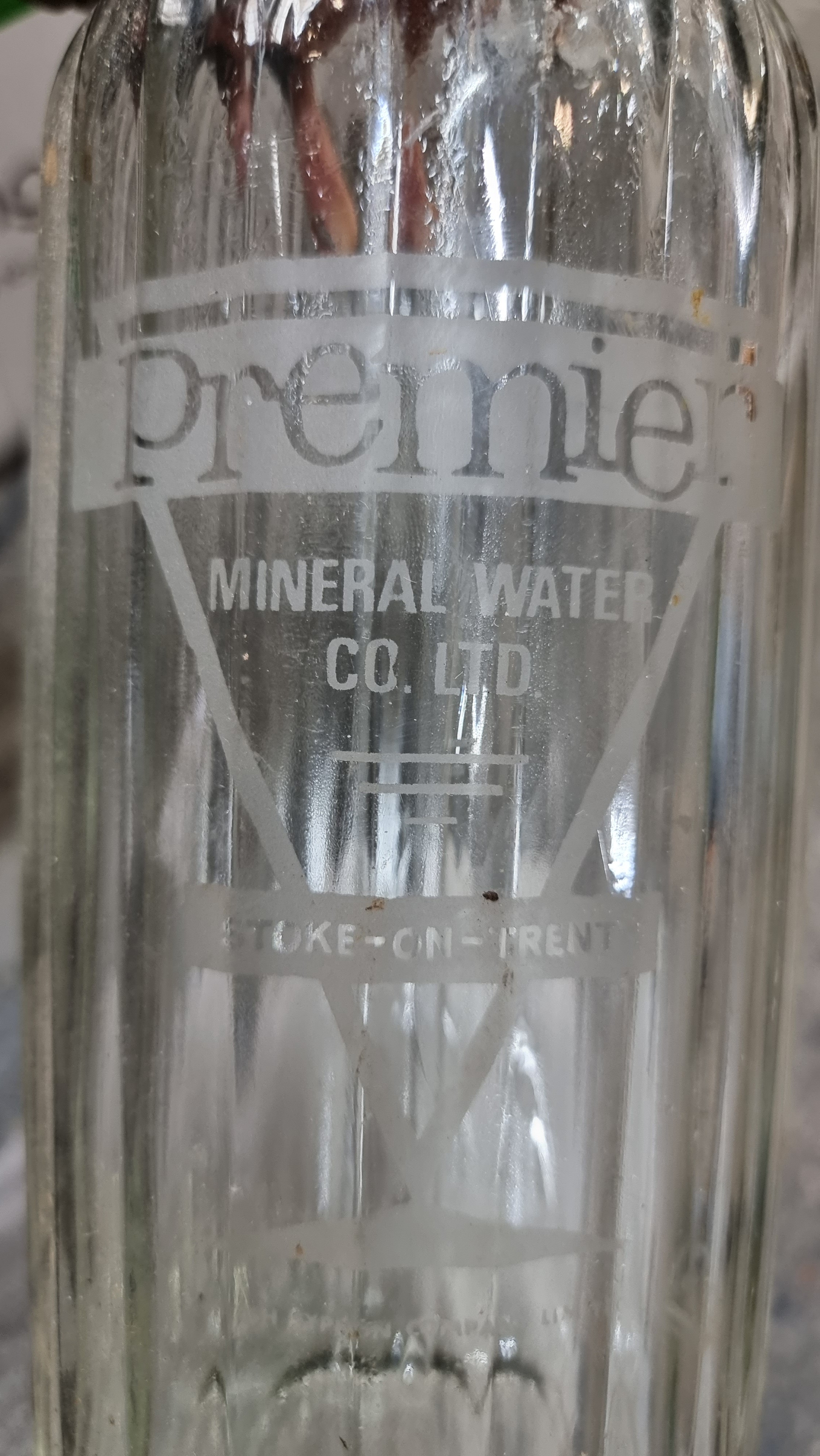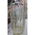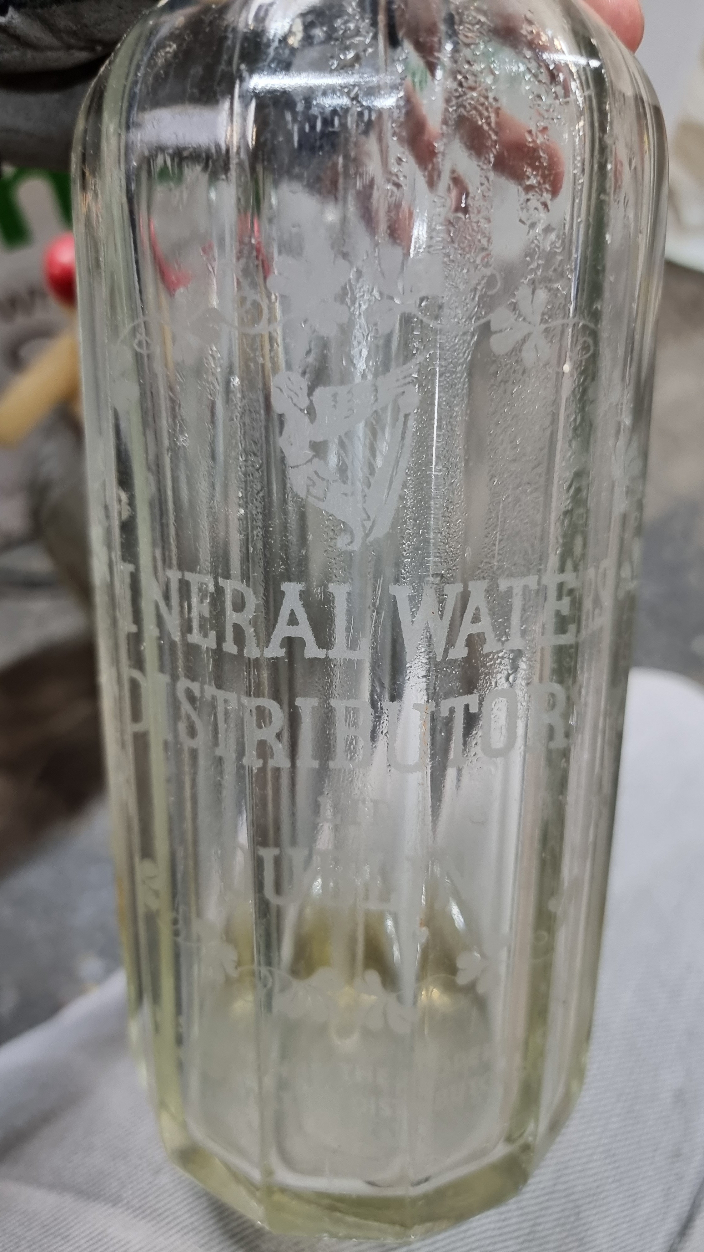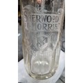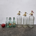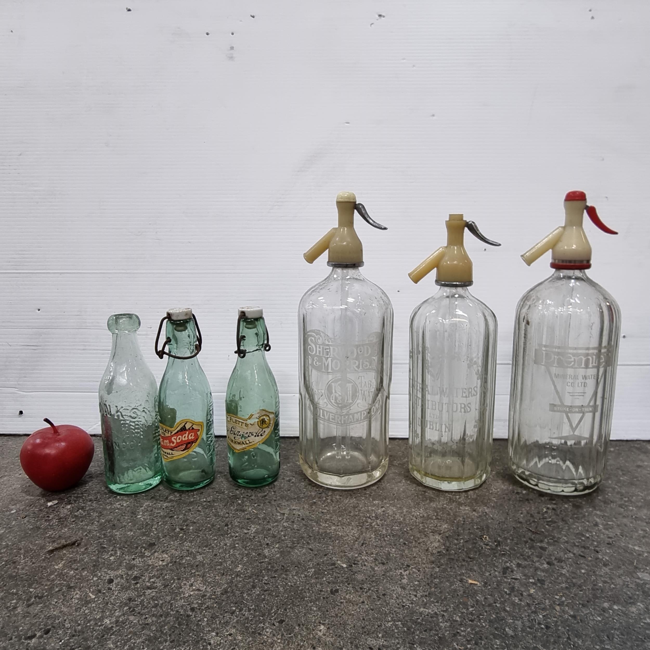 Six vintage glass bottles including 3 soda siphons with etched labels for "Mineral Waters Distributors of Dublin" (flyings harp) , "Sherwood & Morris" and "Premier Mineral Water Co. Ltd.". One of the smaller battles, for Monks, features a charming relief design.
