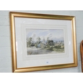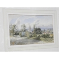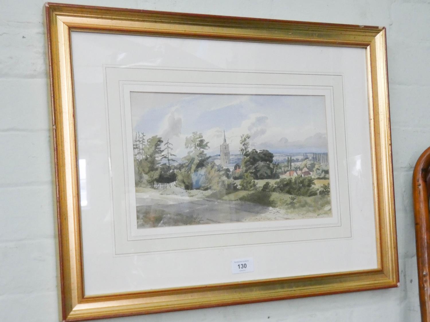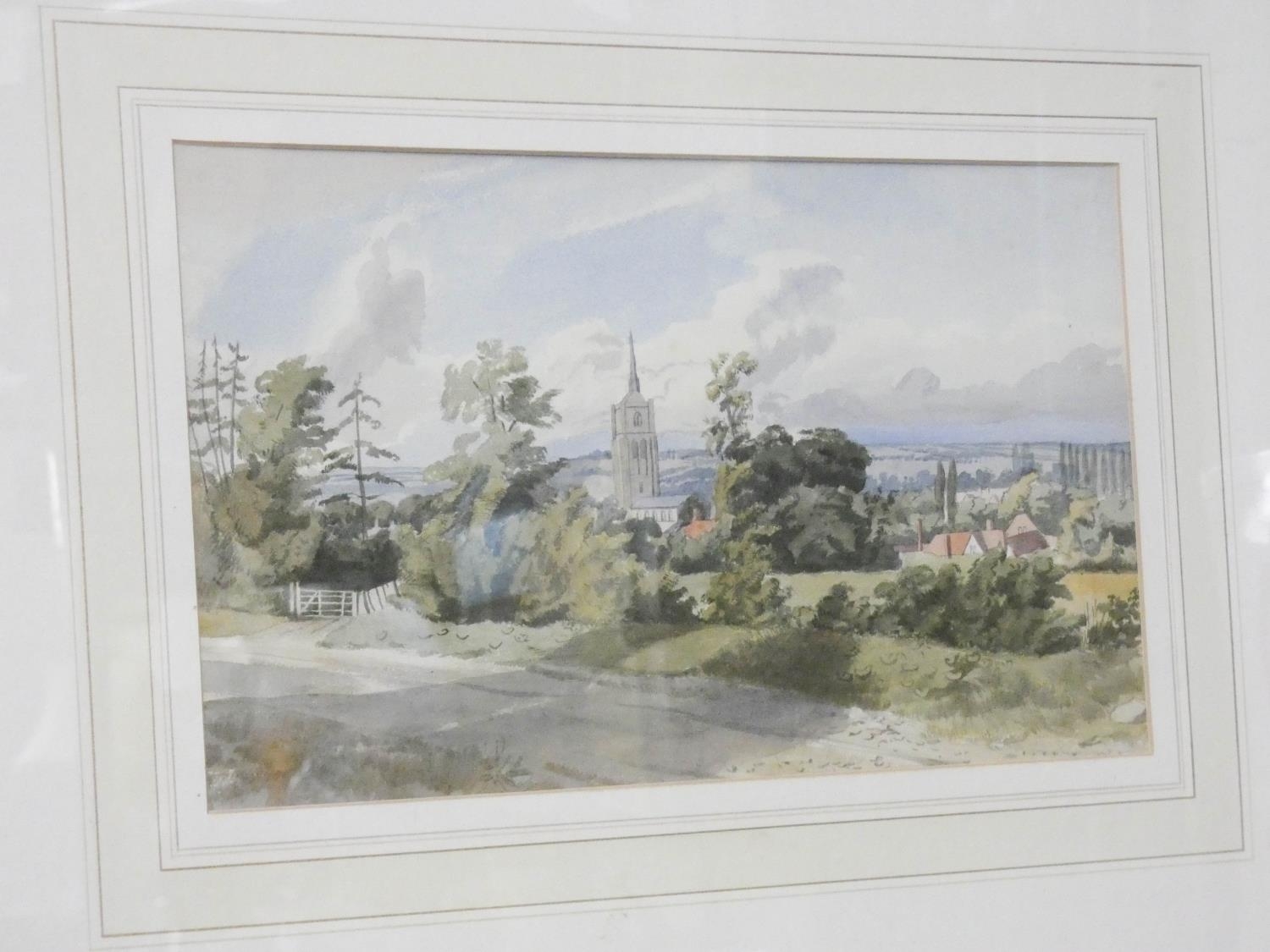 A watercolour of landscape scene with church and a smaller watercolour of farming landscape