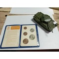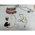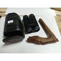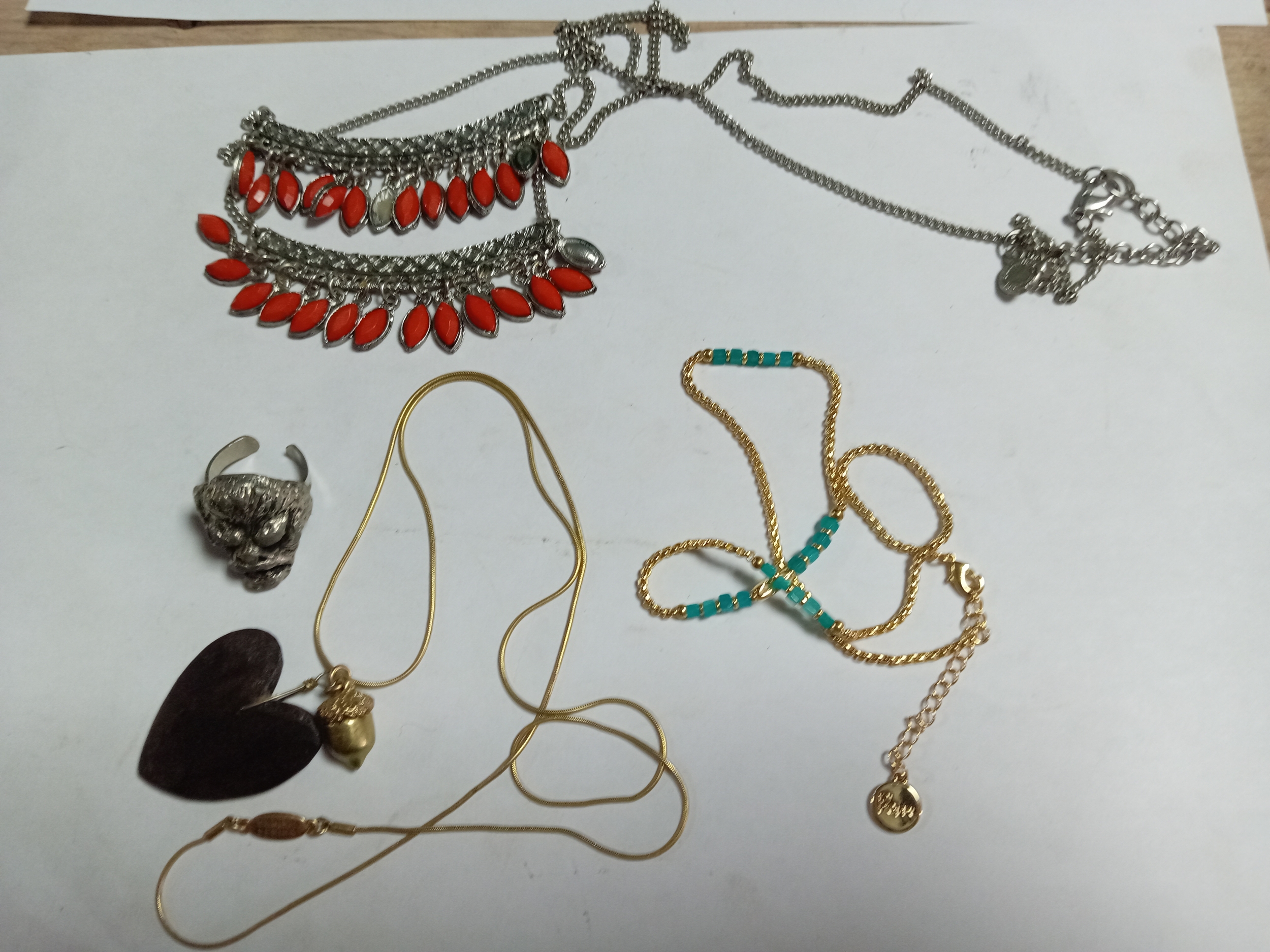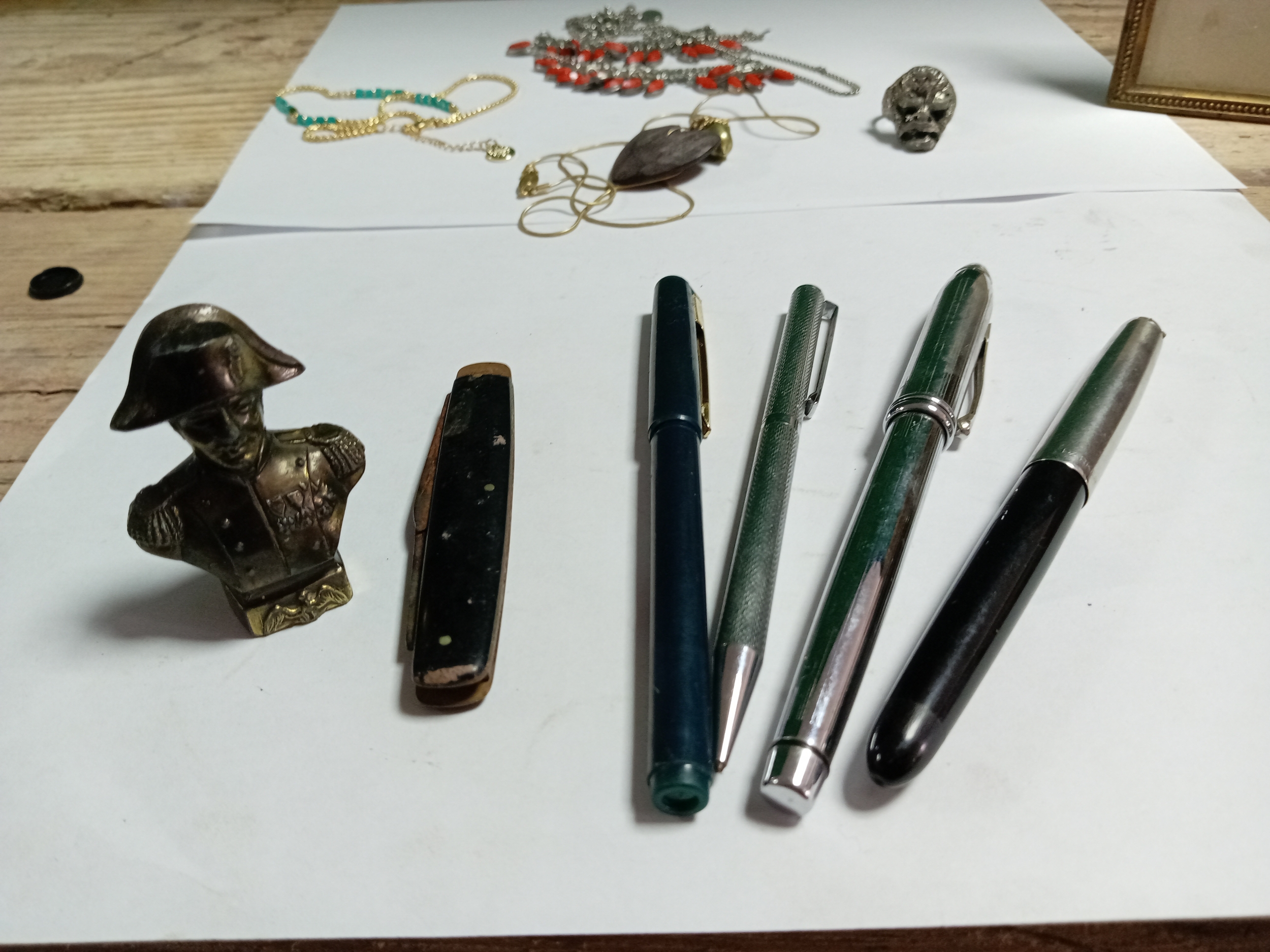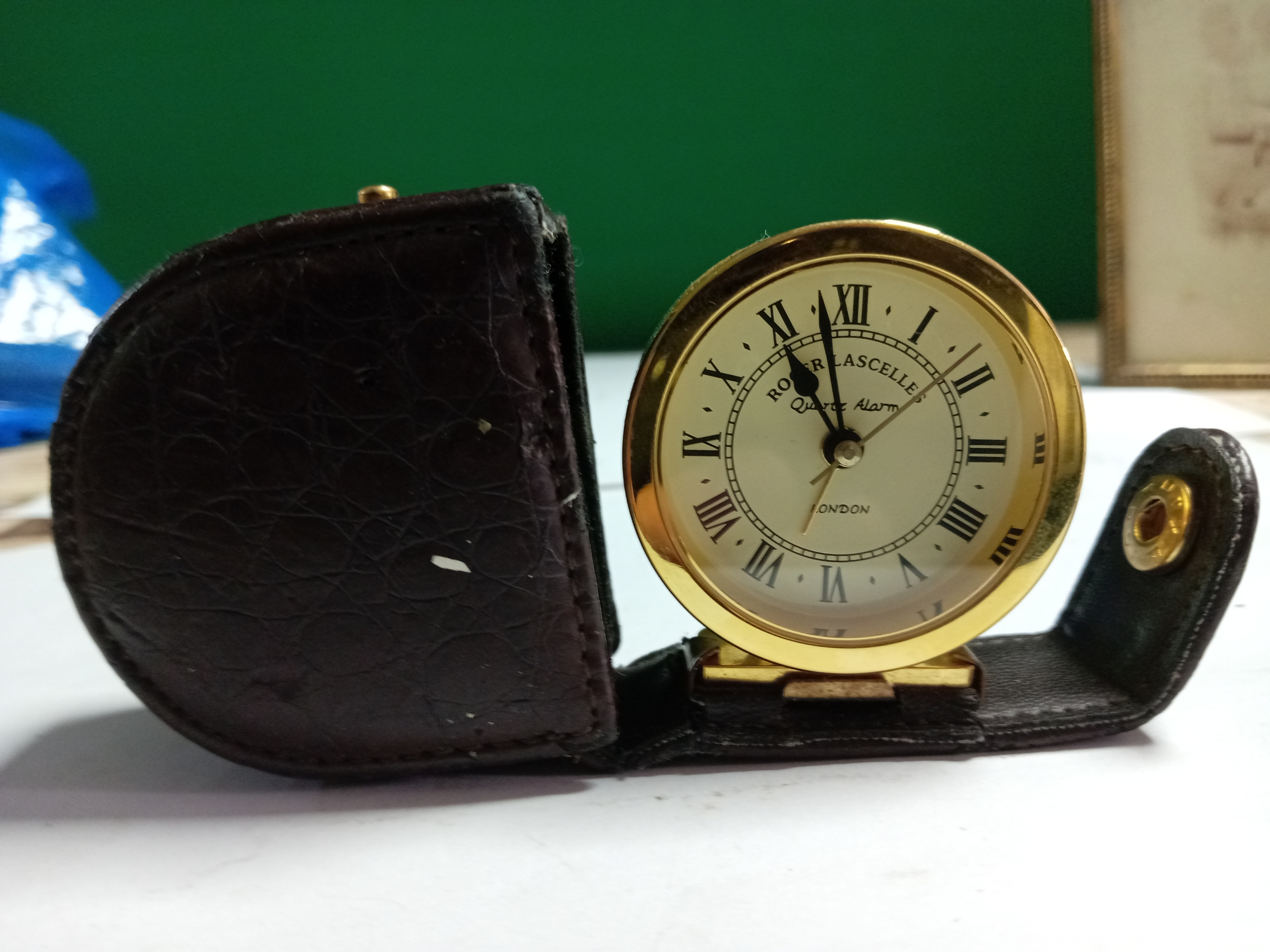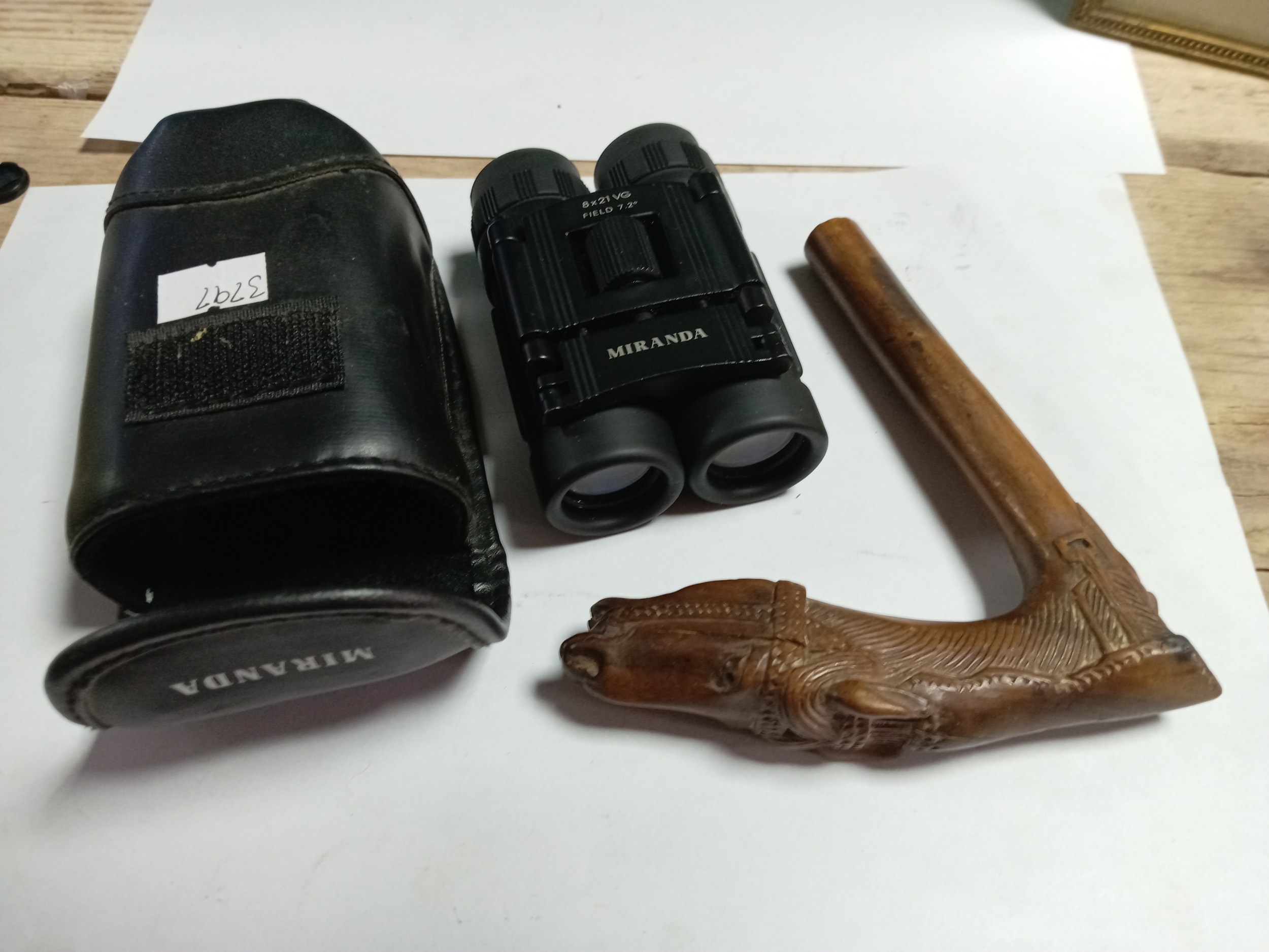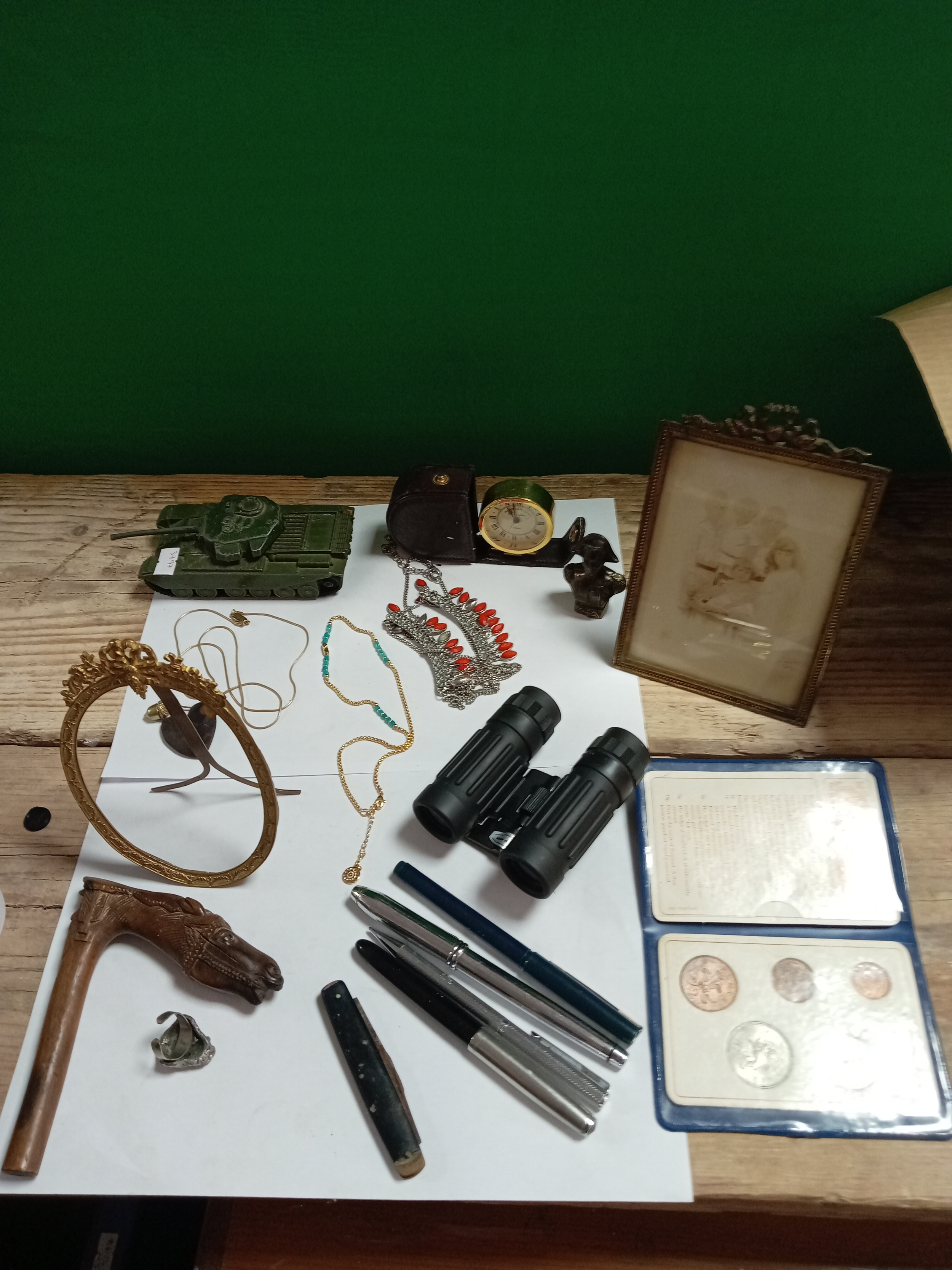A selection of trinkets, jewelry, a single clock, pair of Miranda binoculars, a multi tool pocket knife, two photo frames and a booklet of Britain's first decimal coins