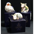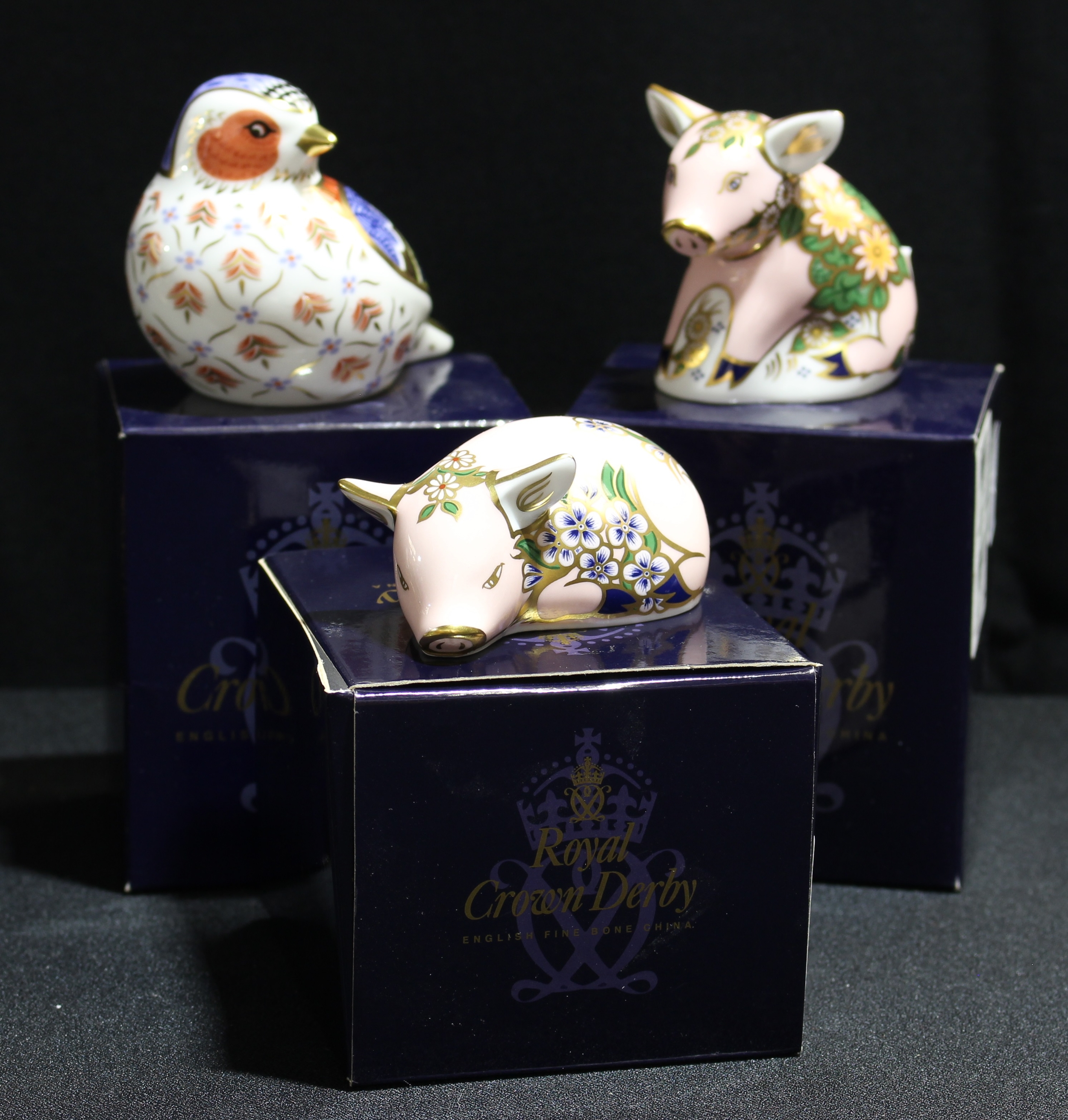 A Royal Crown Derby paperweight, Chelford Chaffinch, Sinclairs exclusive limited edition, signed, gold stopper, certificate, boxed; others, Pickworth Piglet, Sinclairs exclusive, gold stopper, certificate, boxed; Plumstead Piglet, gold stopper, certificate, boxed (3)