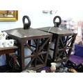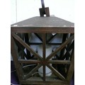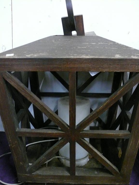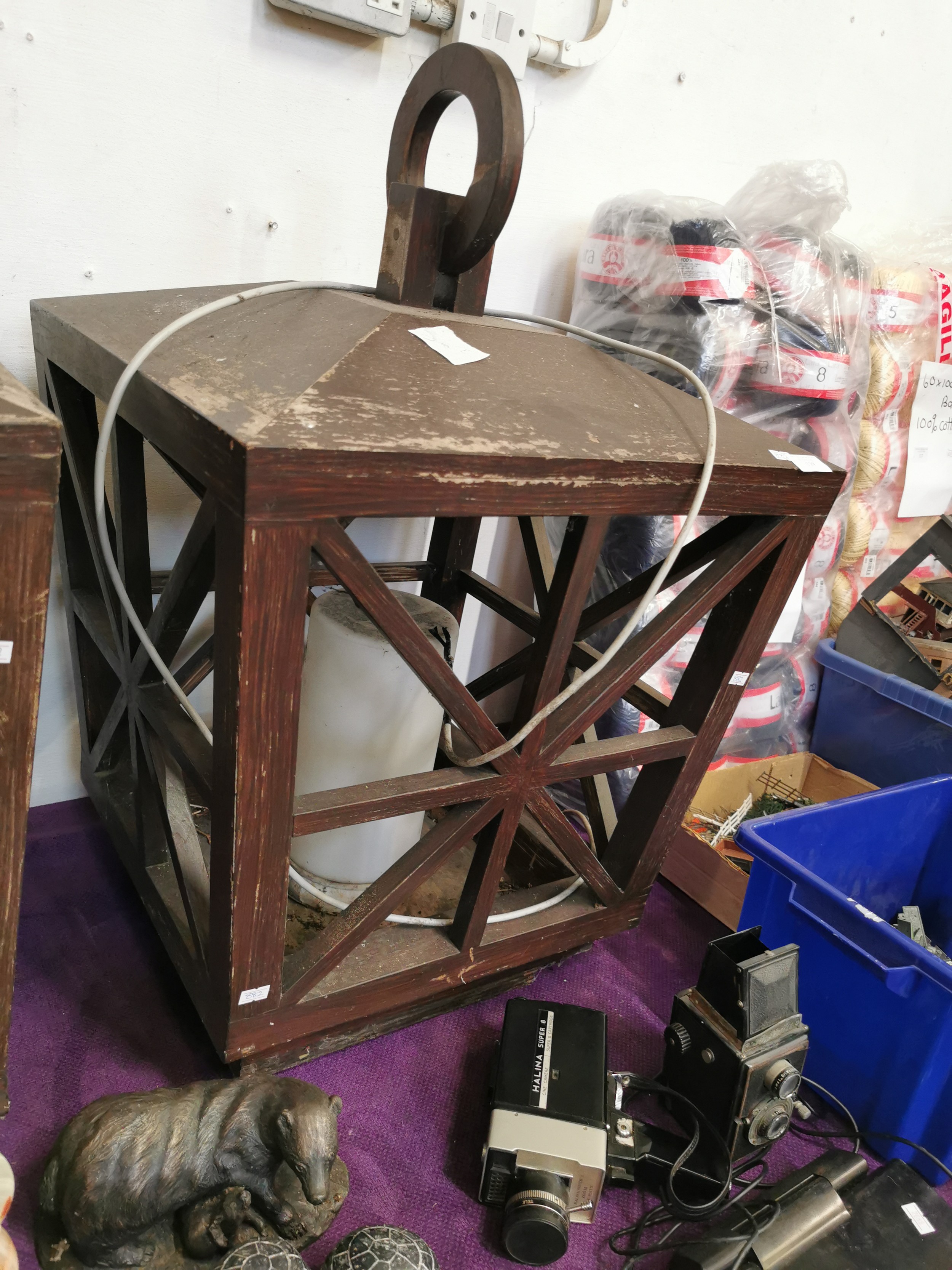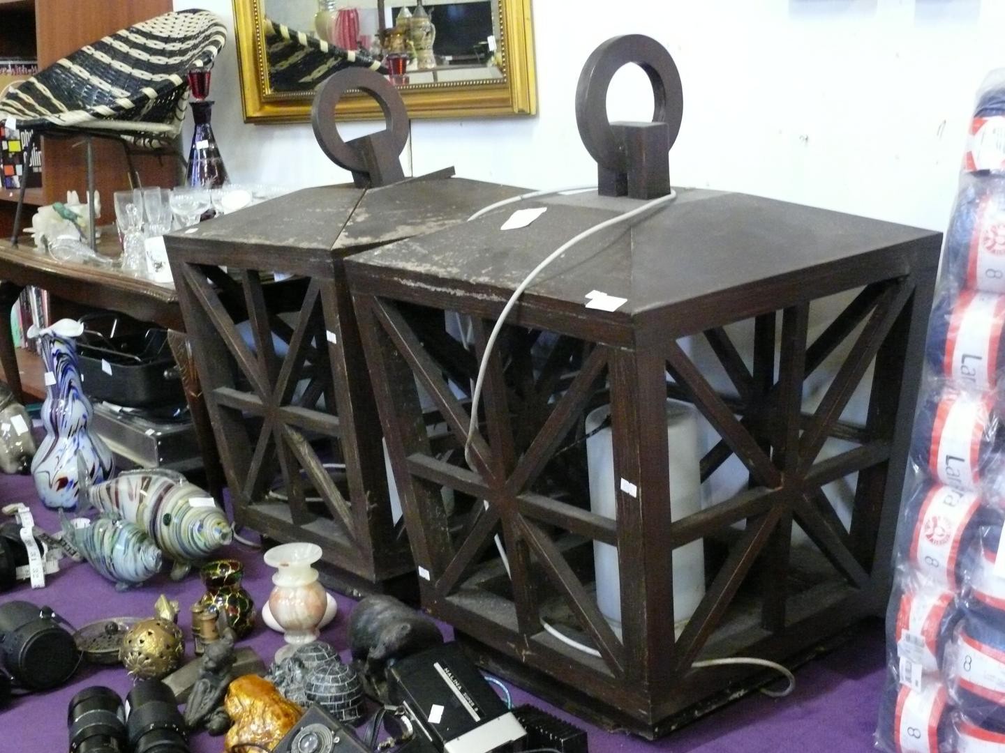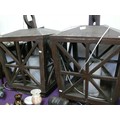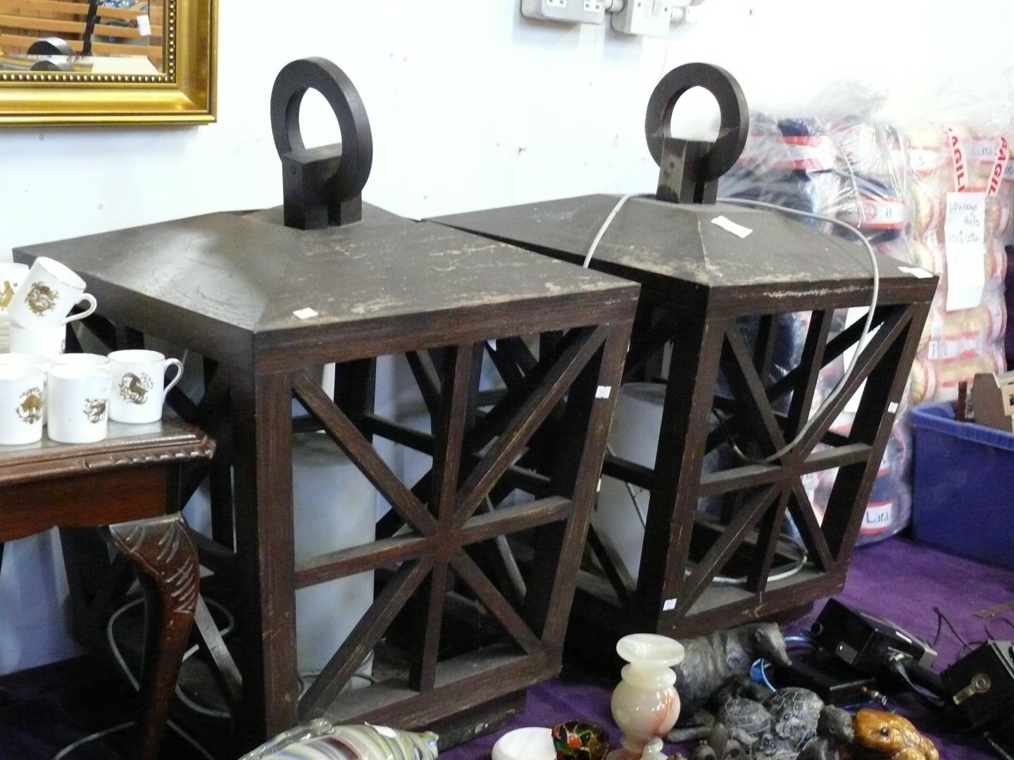 PAIR OF STUNNING HUGE WOODEN LANTERNS FOR OUTDOOR USE WITH ELECTRIC CABLING, APPROX 32"HIGH X 20" WIDE