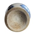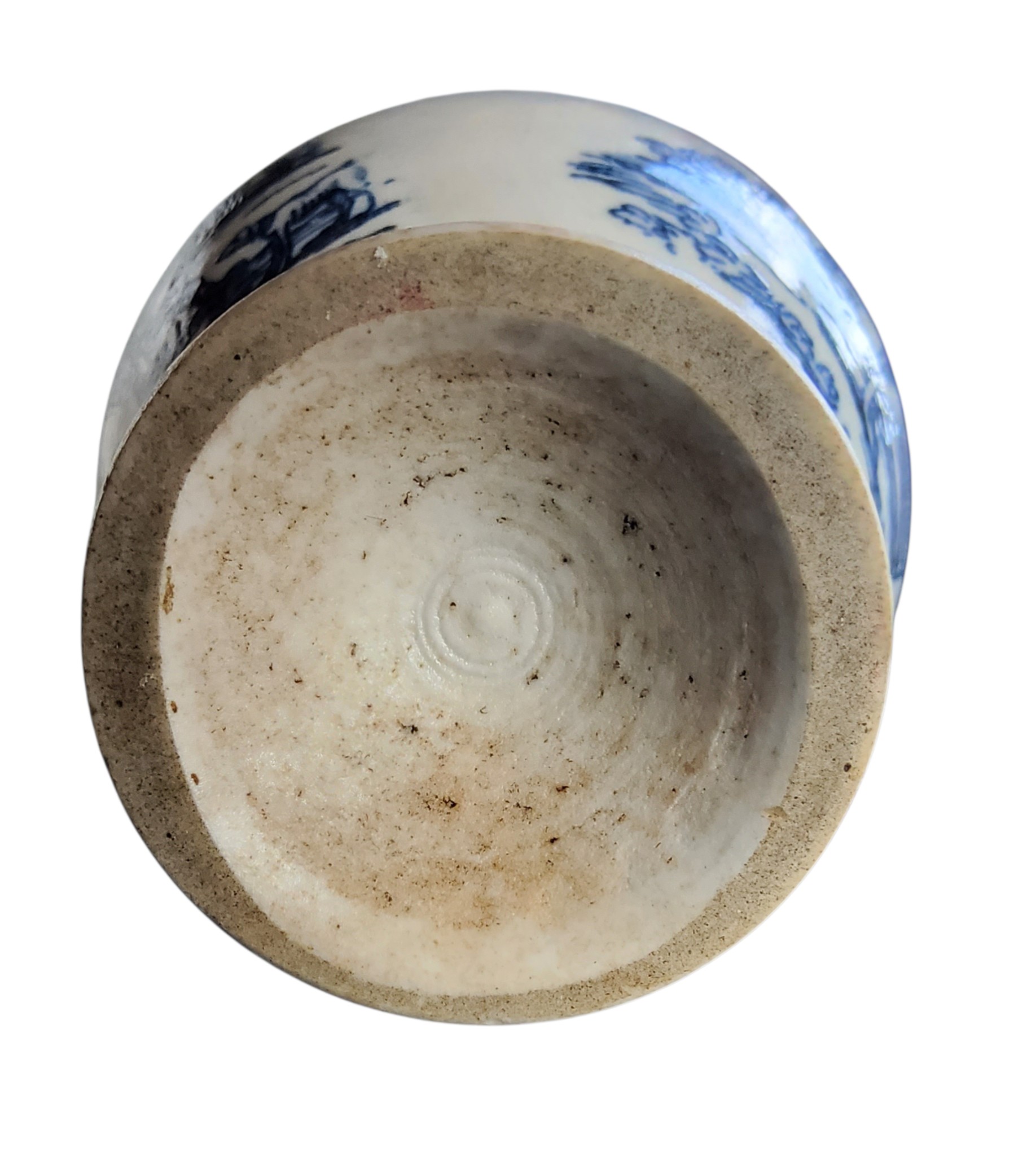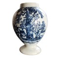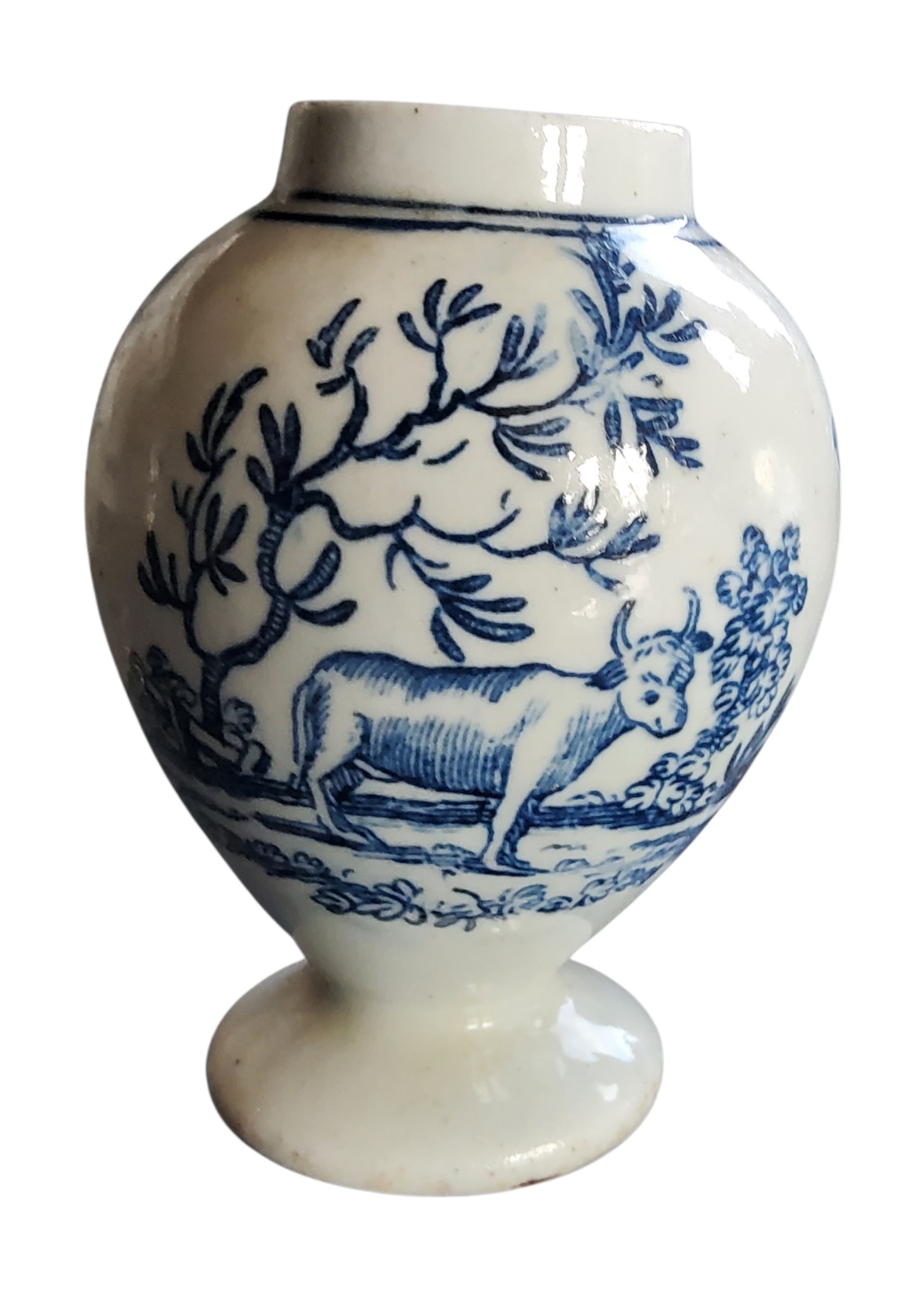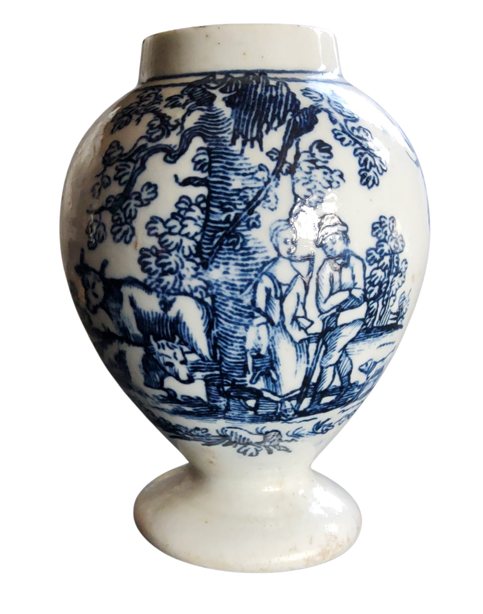 A Liverpool ovoid tea canister, printed in underglaze blue with a milkmaid, companion and cattle, the verso with horned cow, within blue line borders, 9cm high, c.1765