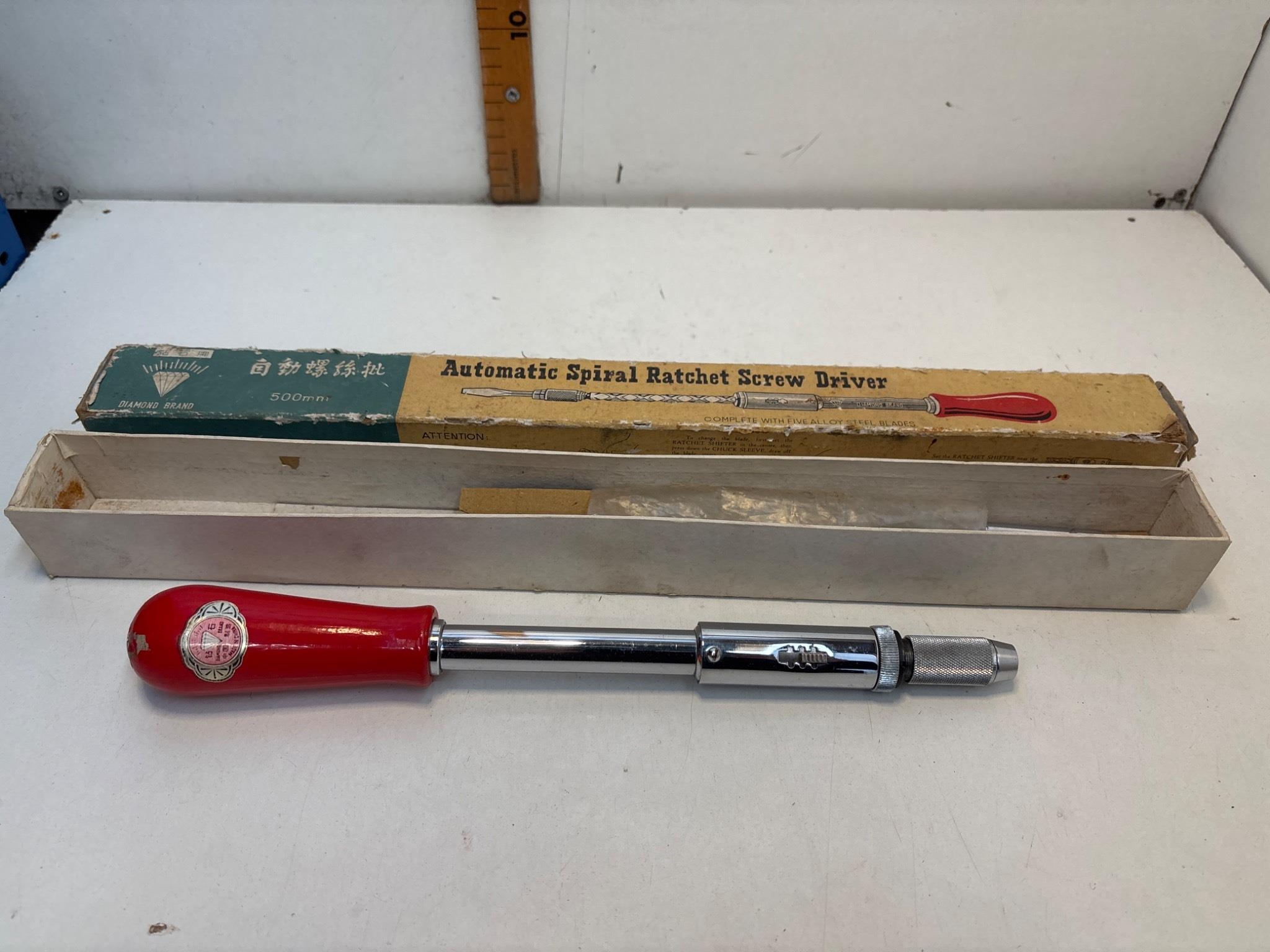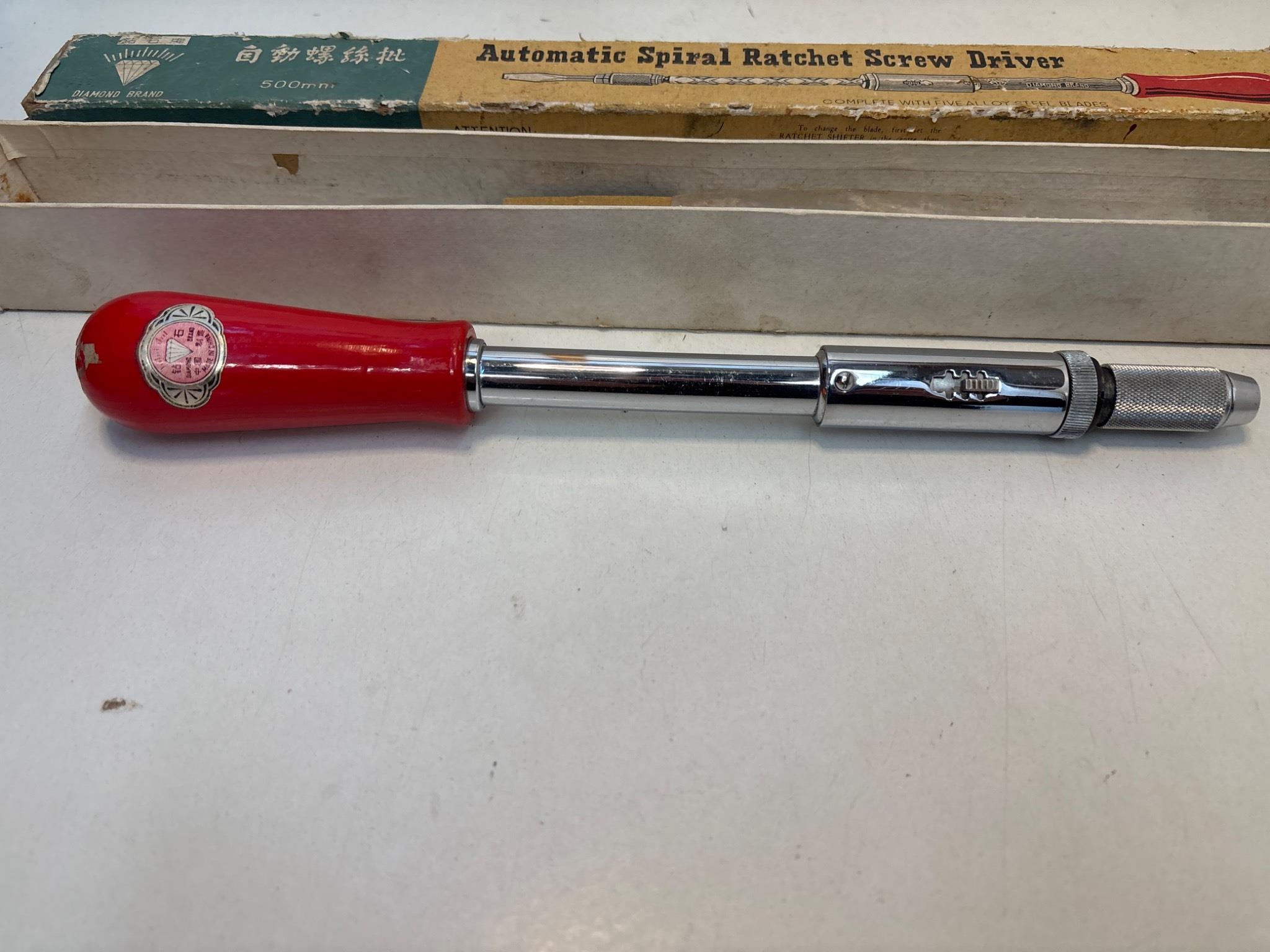 Automatic spiral ratchet screwdriver with red handle and original box.
