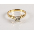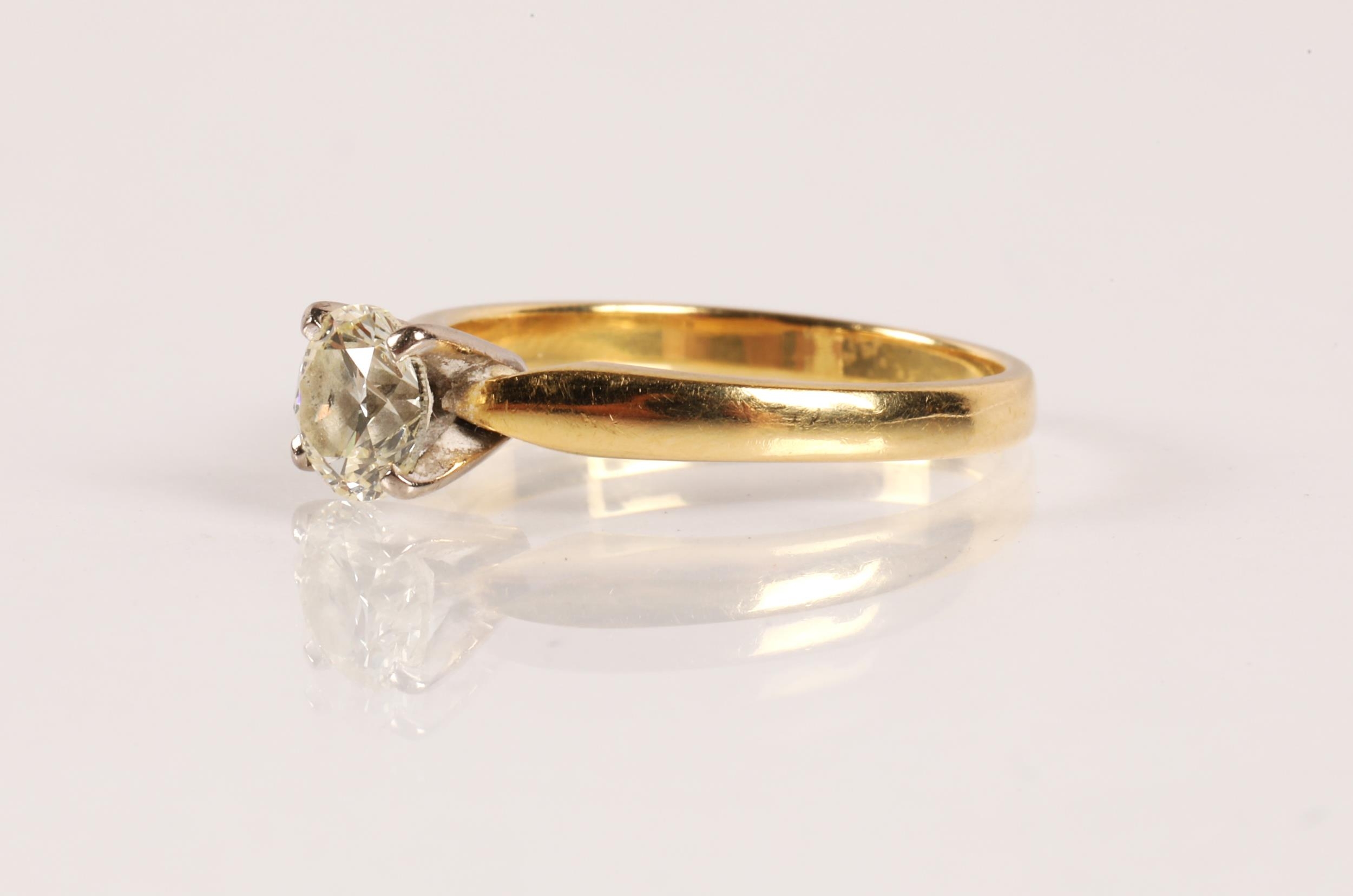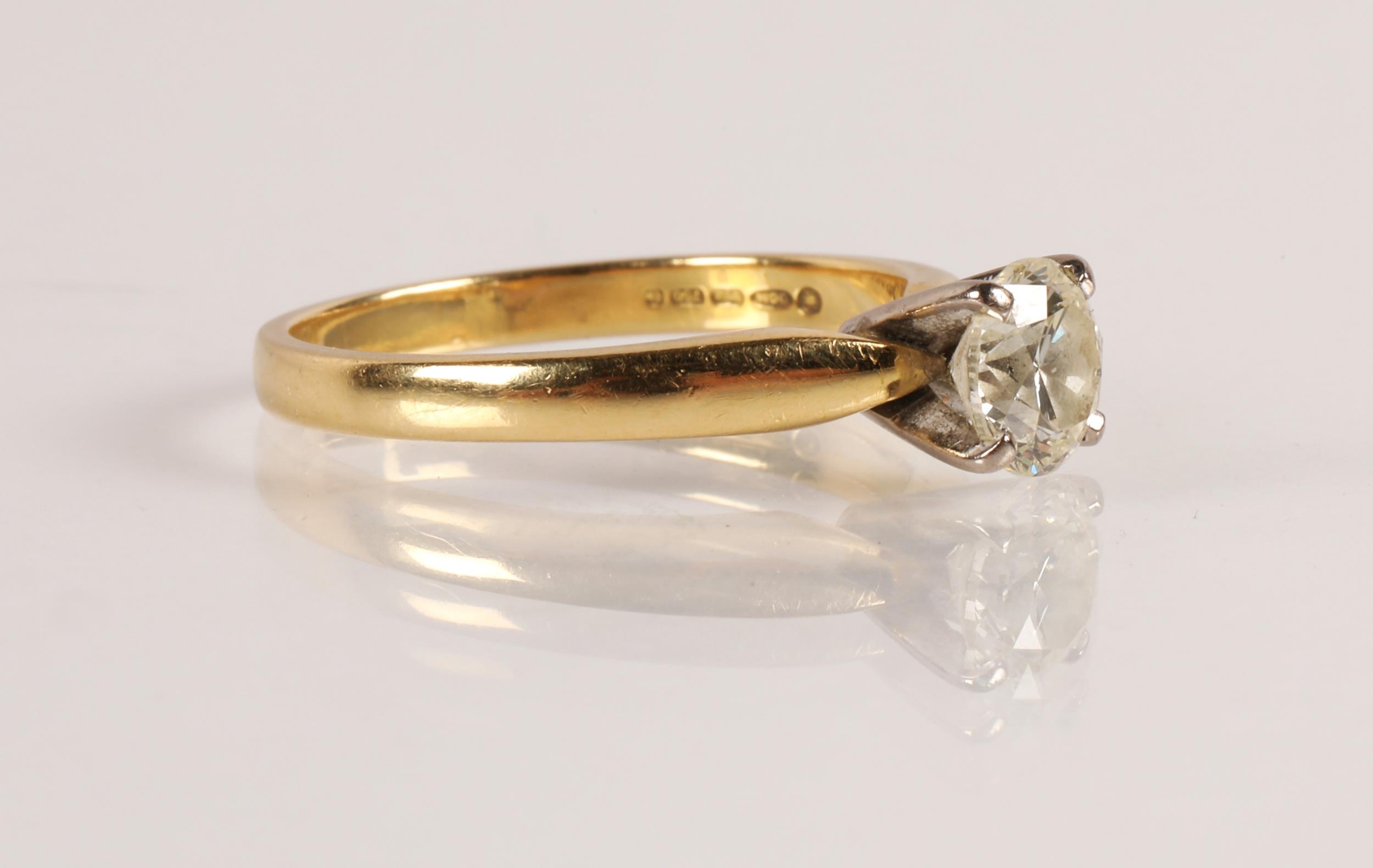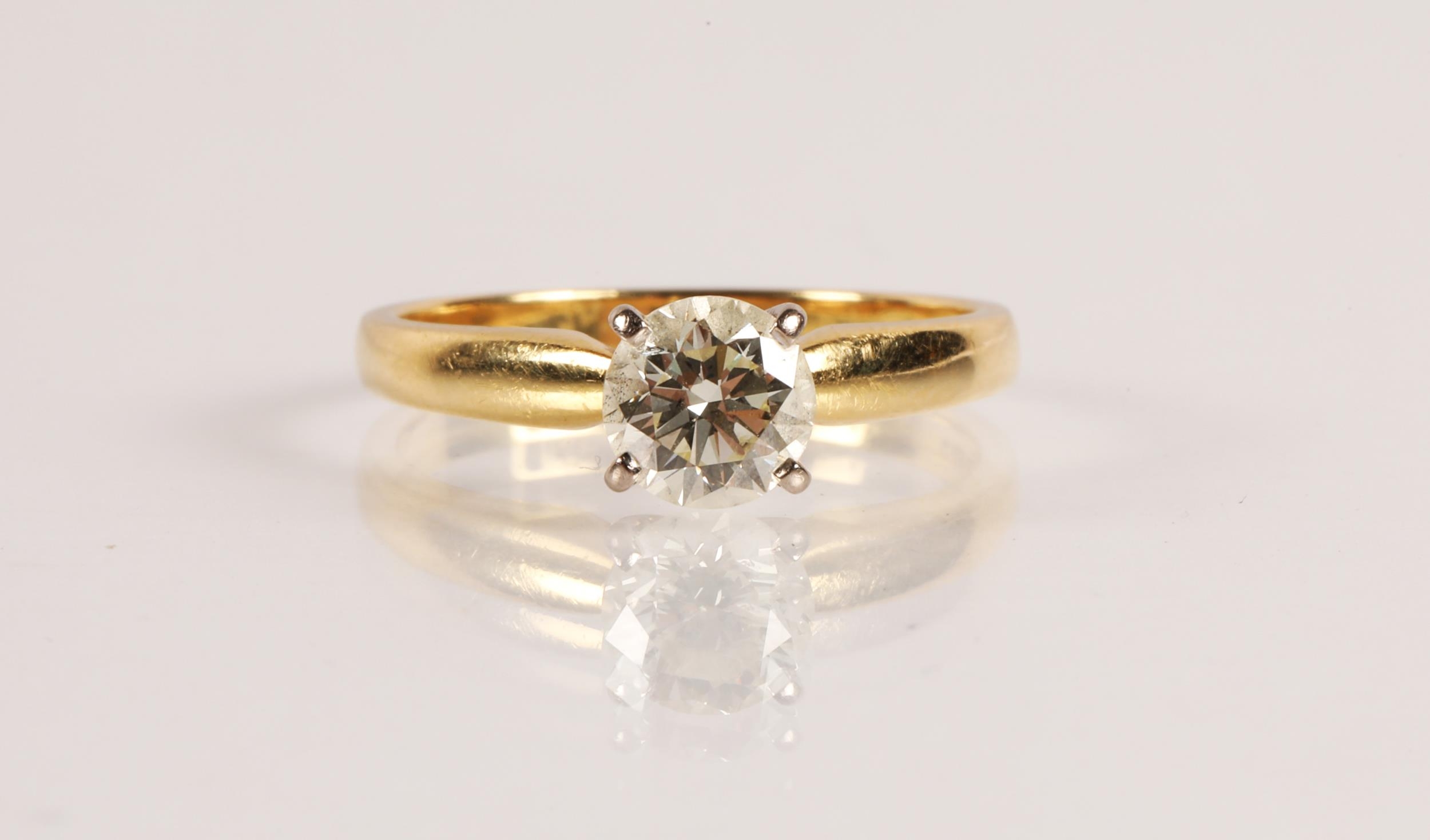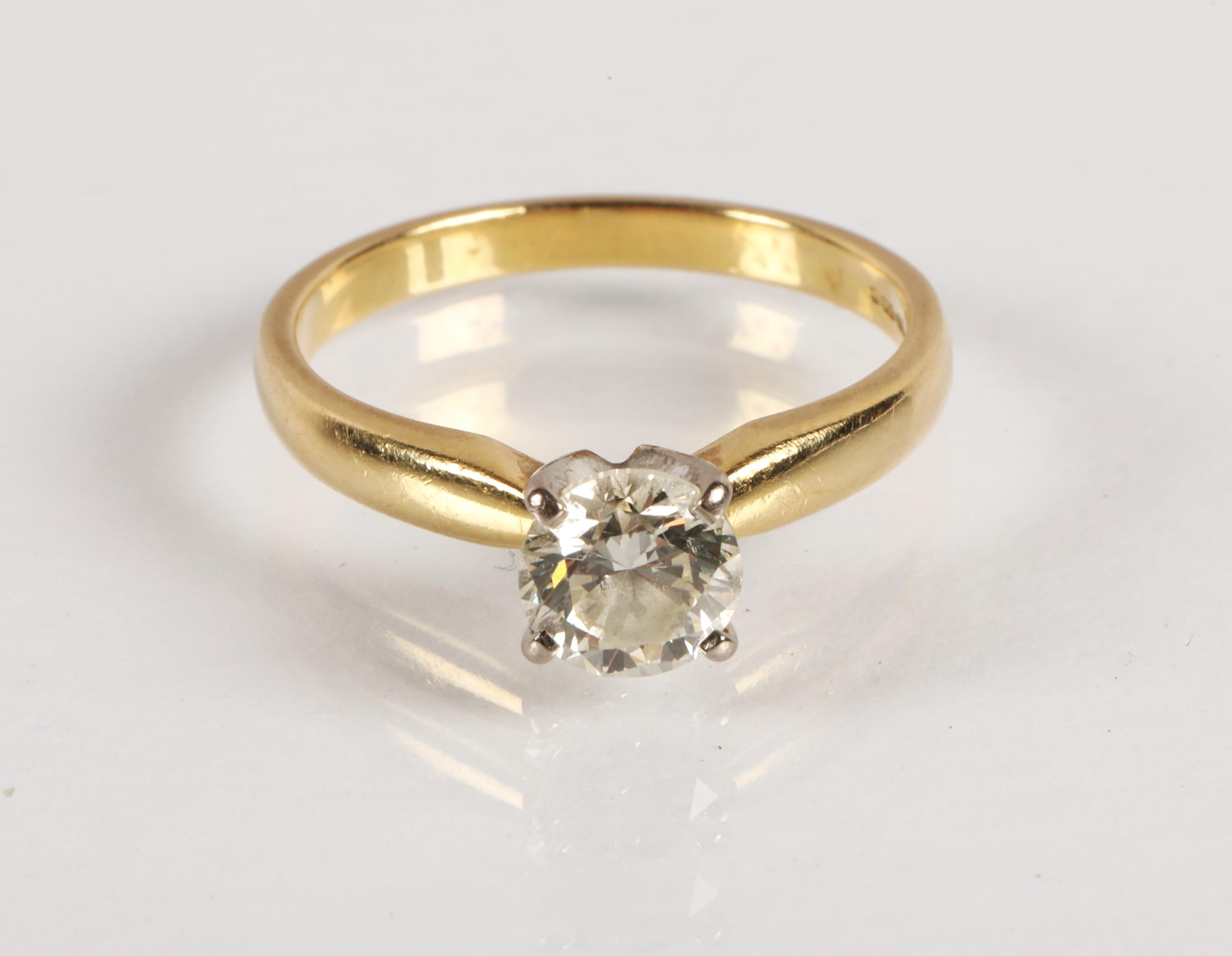 Ladies 18ct yellow gold diamond solitaire ring, one carat brilliant cut diamond on an 18ct yellow gold shank, ring size O/P