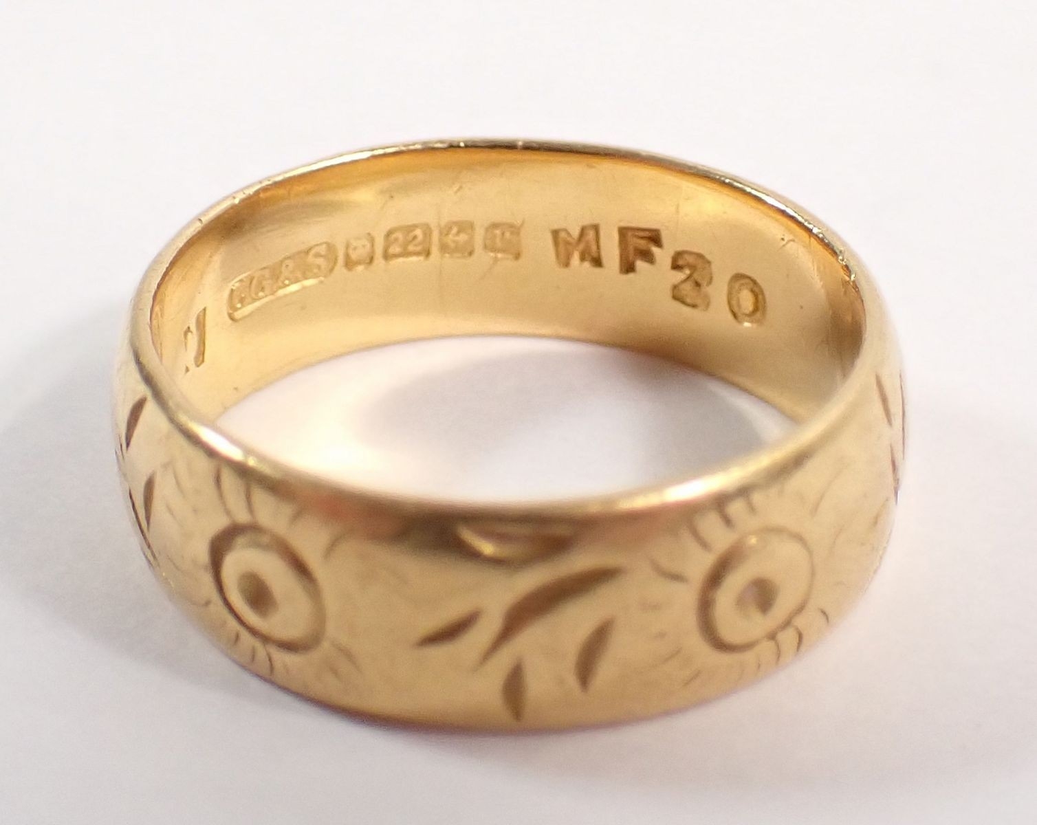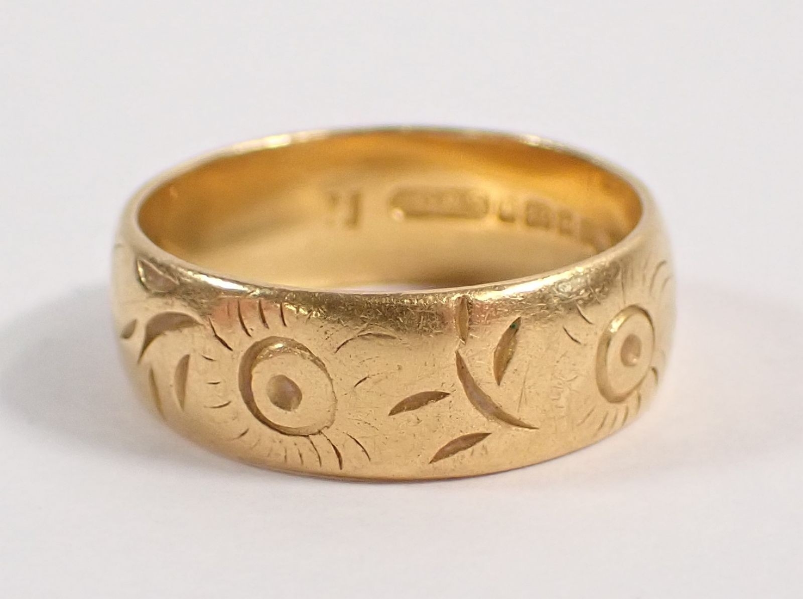 A 22 carat gold wedding band with engraved decoration, 6mm wide, size M, 6.4g