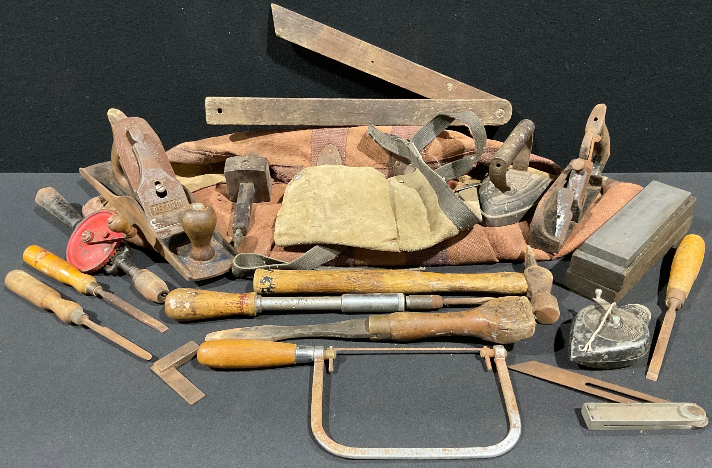 Tools - a carpenters bag and contents, including Stanley planes, No. 5 1/2 and no. 78, hand drill, etc