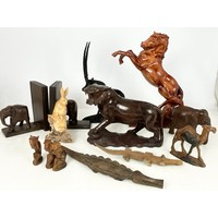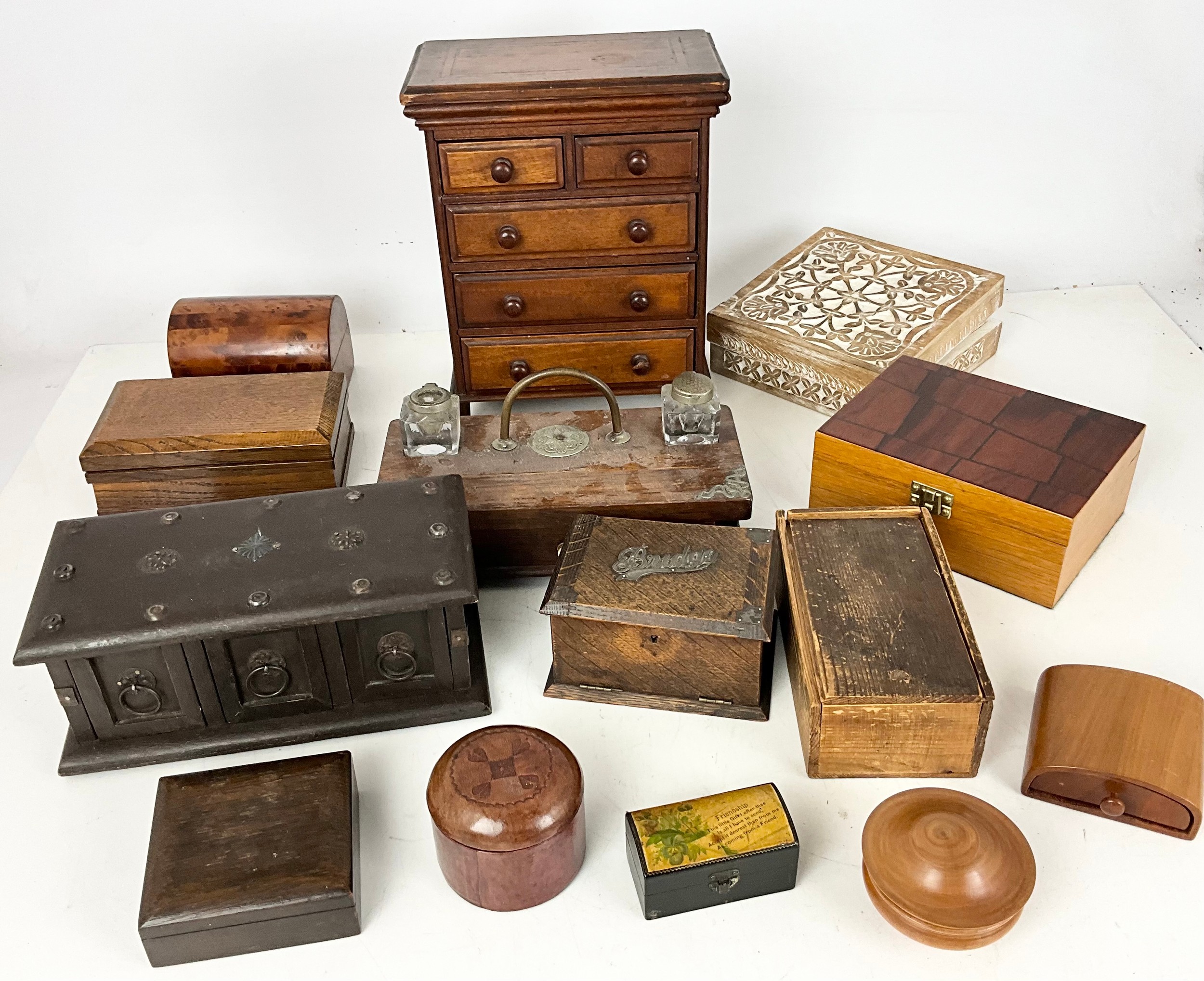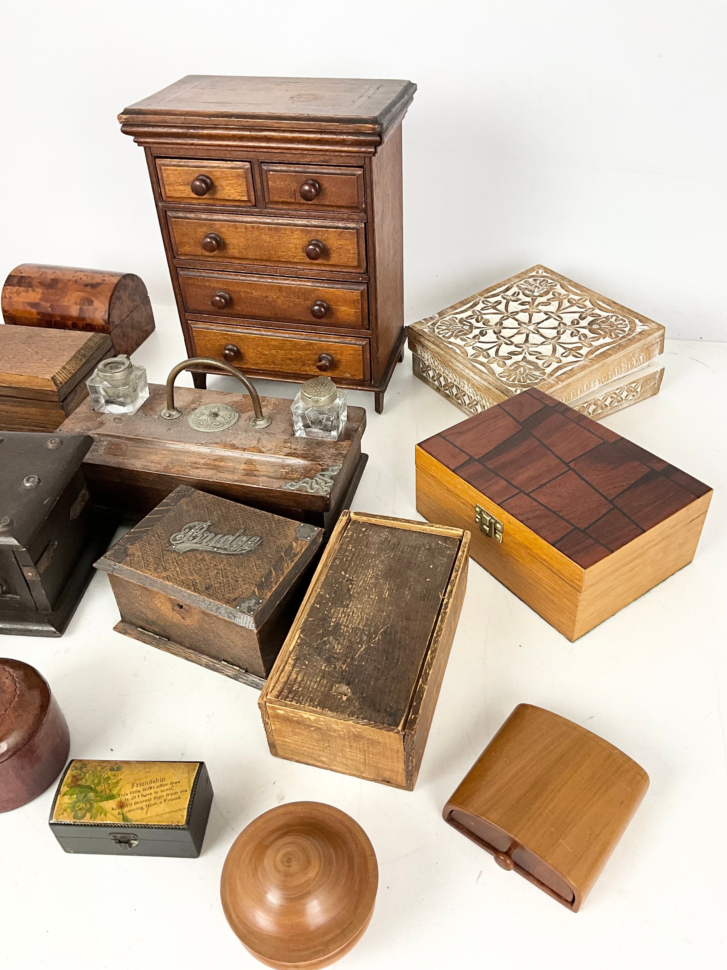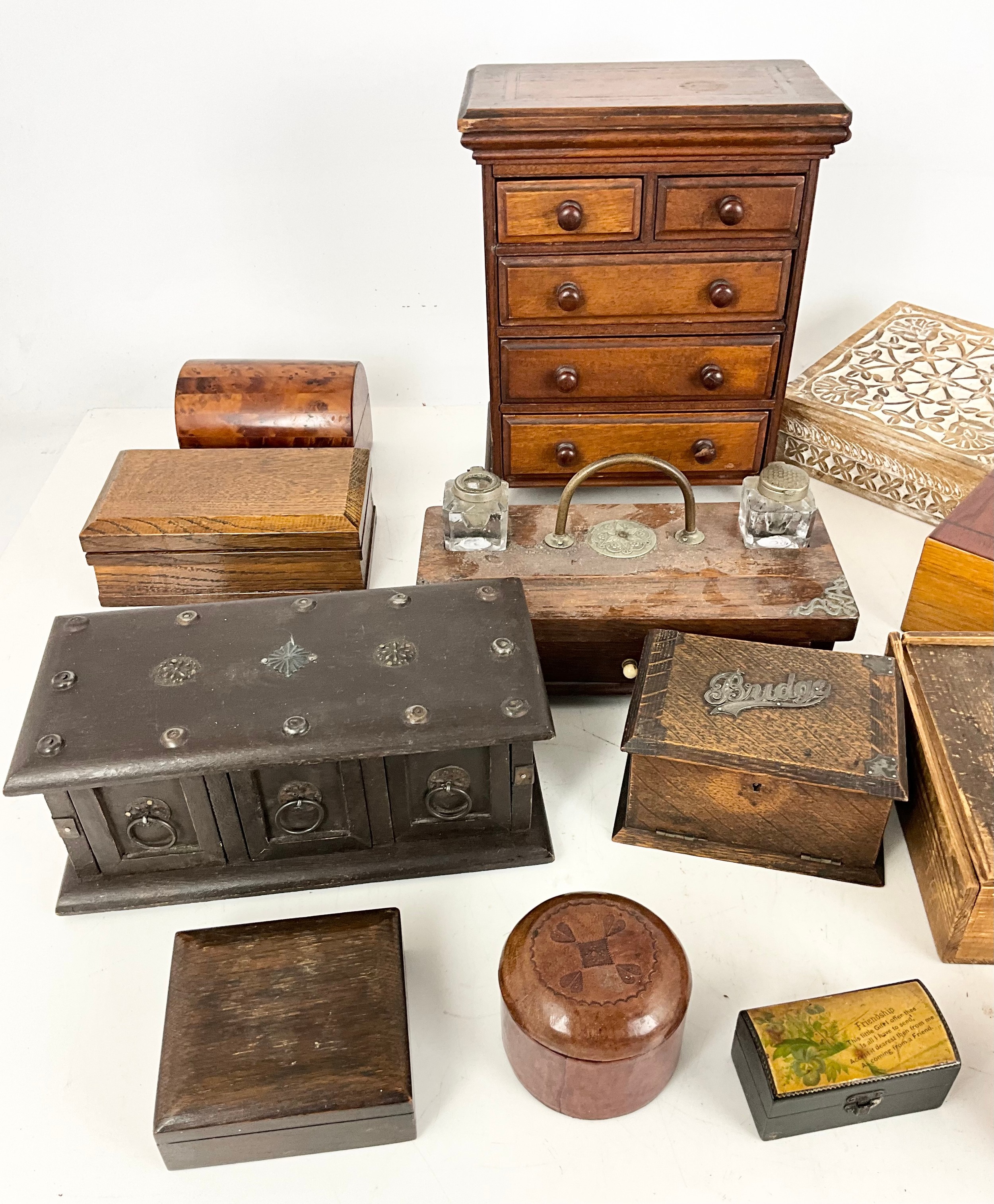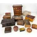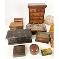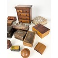 COLLECTION OF TREEN INCLUDING APPRENTICE CHEST OF 2 OVER 3 DRAWERS 29cm TALL, BRIDGE CARD BOX WITH SILVER MOUNTS, DESK STAND, BOXES ETC