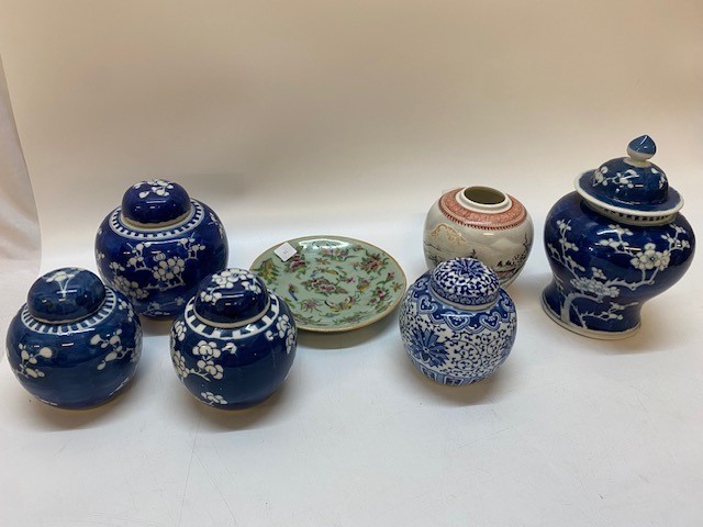 A Cantonese dish with celadon glaze - 7in. wide, a Chinese ginger jar painted winter landscape, a prunus pattern vase and cover - 8 1/2in. high, three other prunus pattern jars and covers and one other