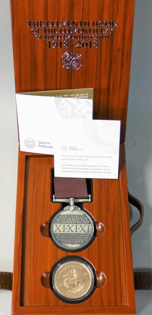 South Africa Mint, a gold proof Krugerrand, 2018, limited edition, 32/200 commemorating the anniversary of the signing of the Armistice of WWI, together with a silver medallion, certificate, case.