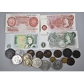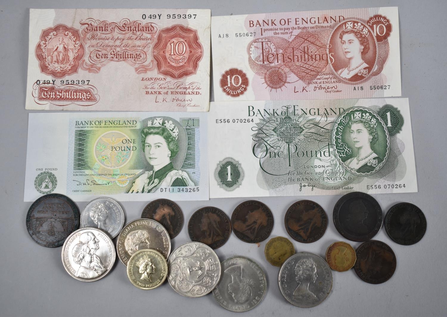 A Collection of Pound and Ten Shilling Notes, Coins and Crowns, Iron Bridge Medallion etc