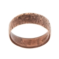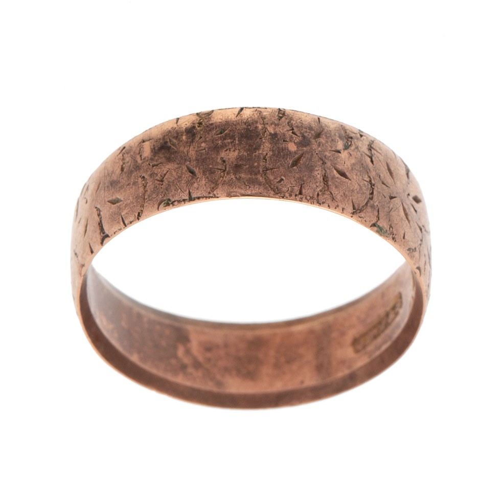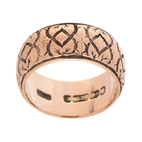 9ct rose gold wedding band with chased clover leaf decoration, ring size P, 3.3g.