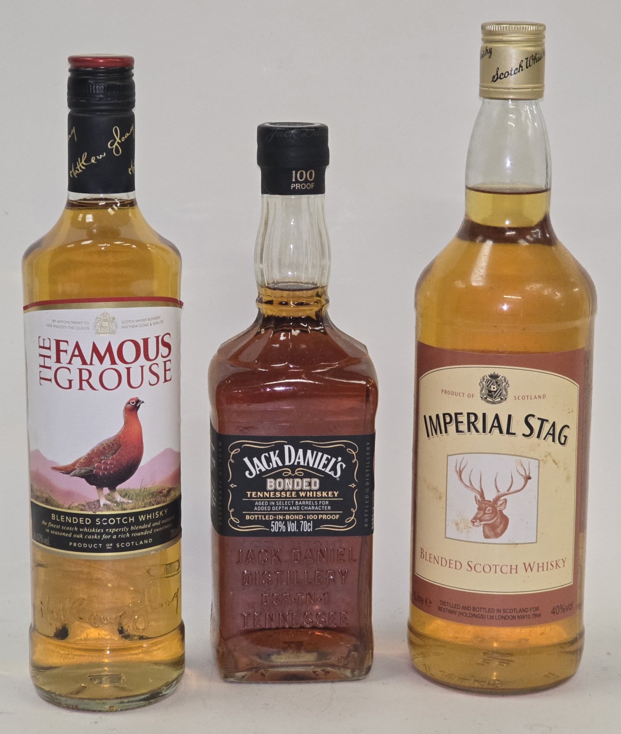 3 x bottles whisky to include Jack Daniel's Bonded 100 proof Tennessee Whiskey 70cl, The Famous Grouse Blended Scotch Whisky 70cl and Imperial Stag Blended Scotch Whisky 1L (REF P97, P82).
