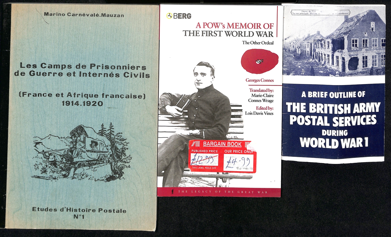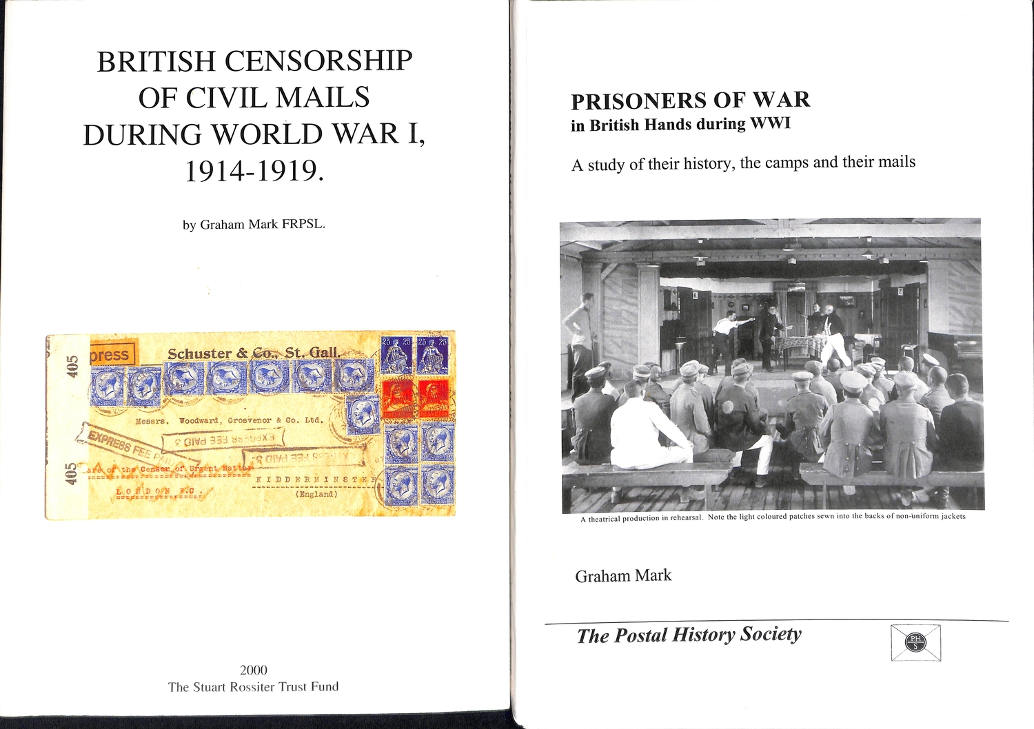 Philatelic Literature. "The Postal History of Bristol", volumes 1-4; "British Censorship of Civil Mails during WW1, 1914-1919" and "Prisoners of War in British Hands during WW1" both by Graham Mark; various Forces Postal History Society publications (5), etc. (17). Also a few non philatelic books. (22).