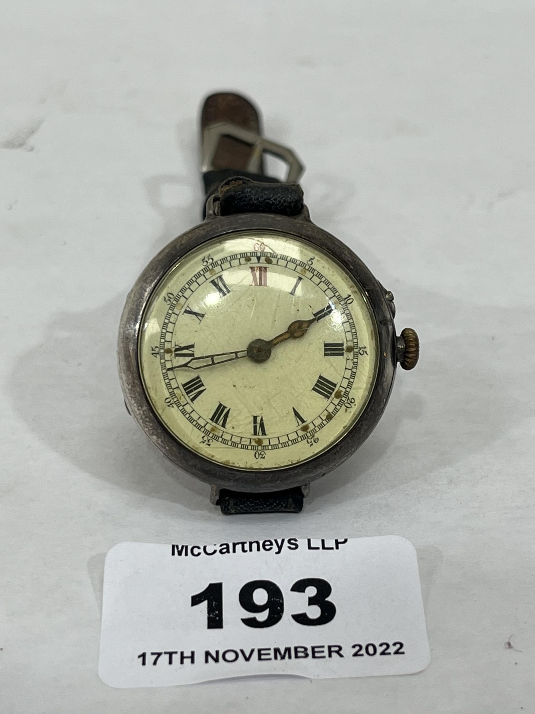 A WWI period silver trench wristwatch with Swiss movement. Dust cover engraved and dated March 27th 1914. 37mm diam over crown