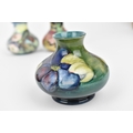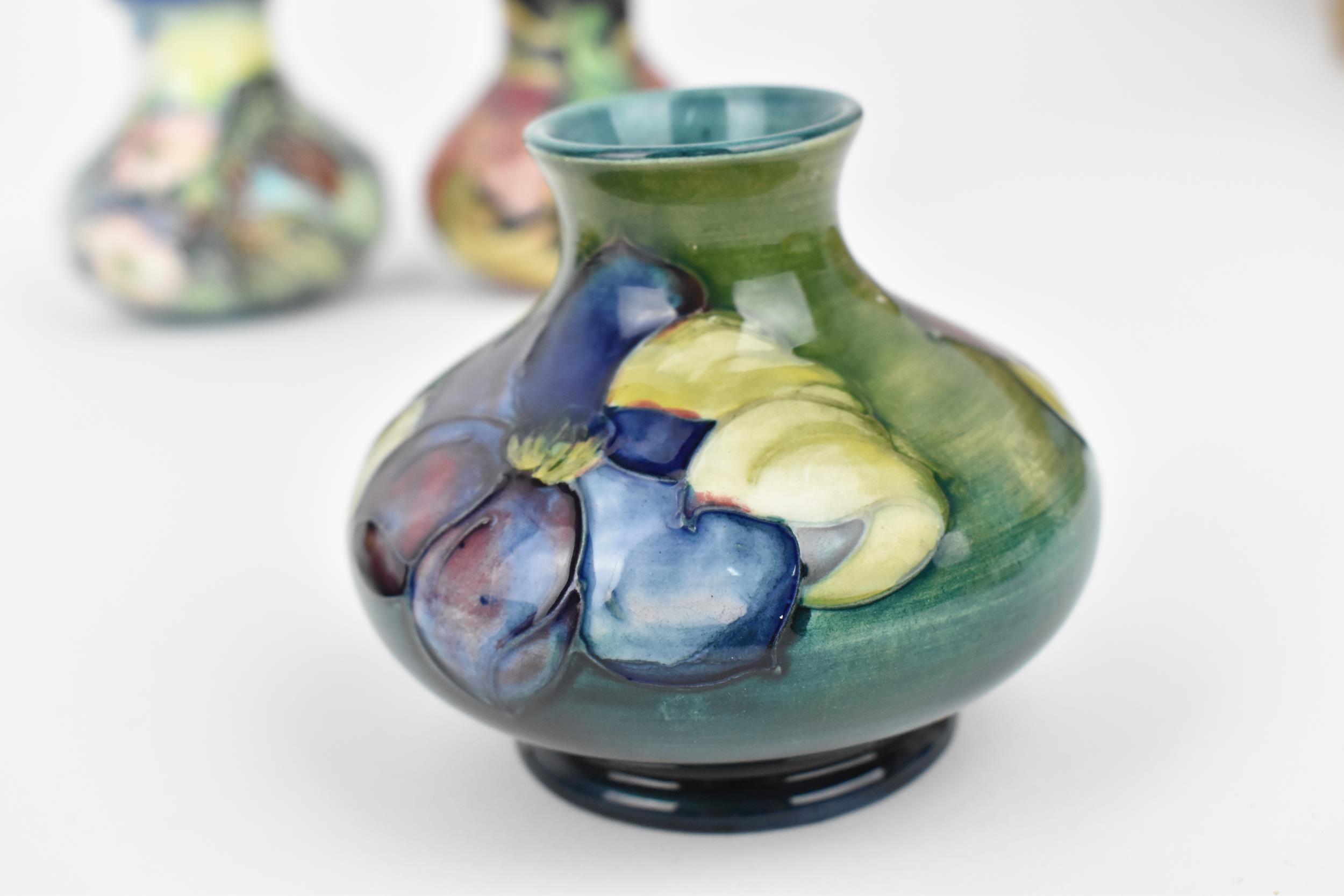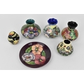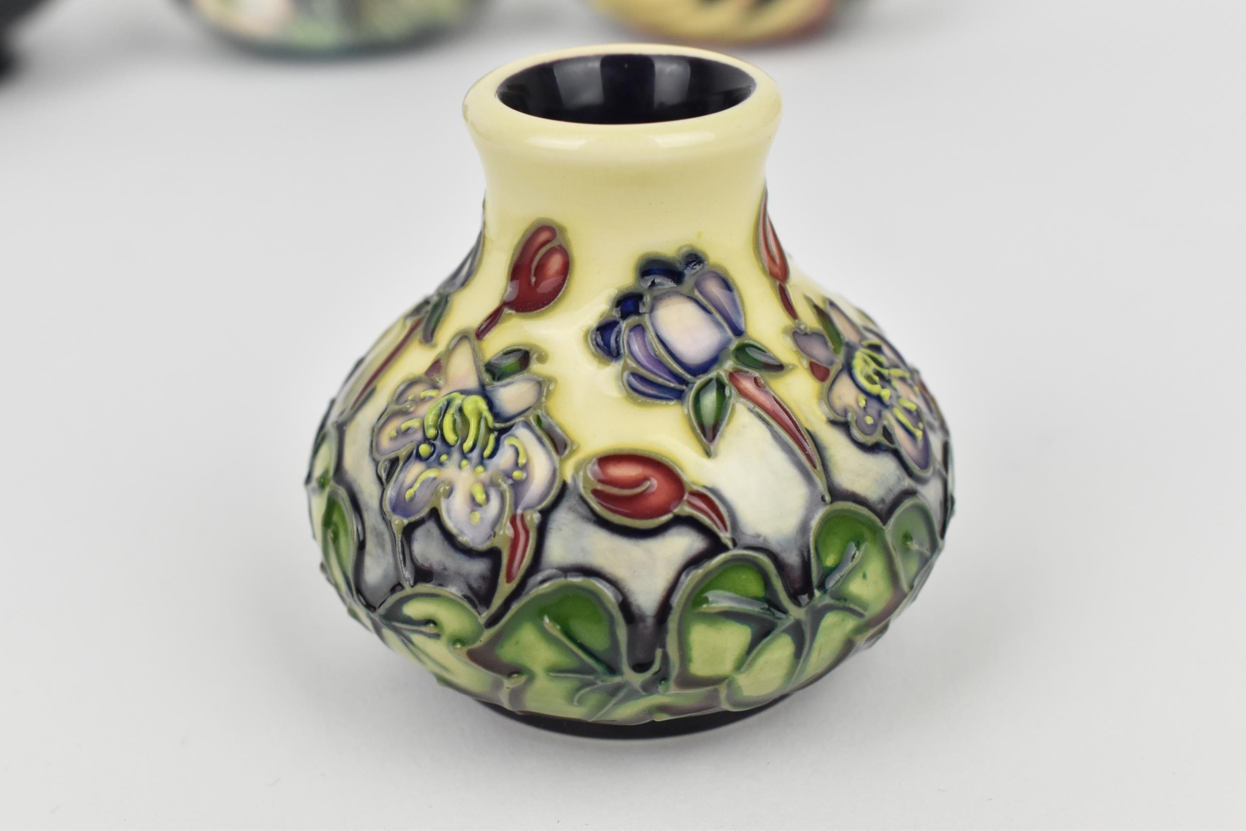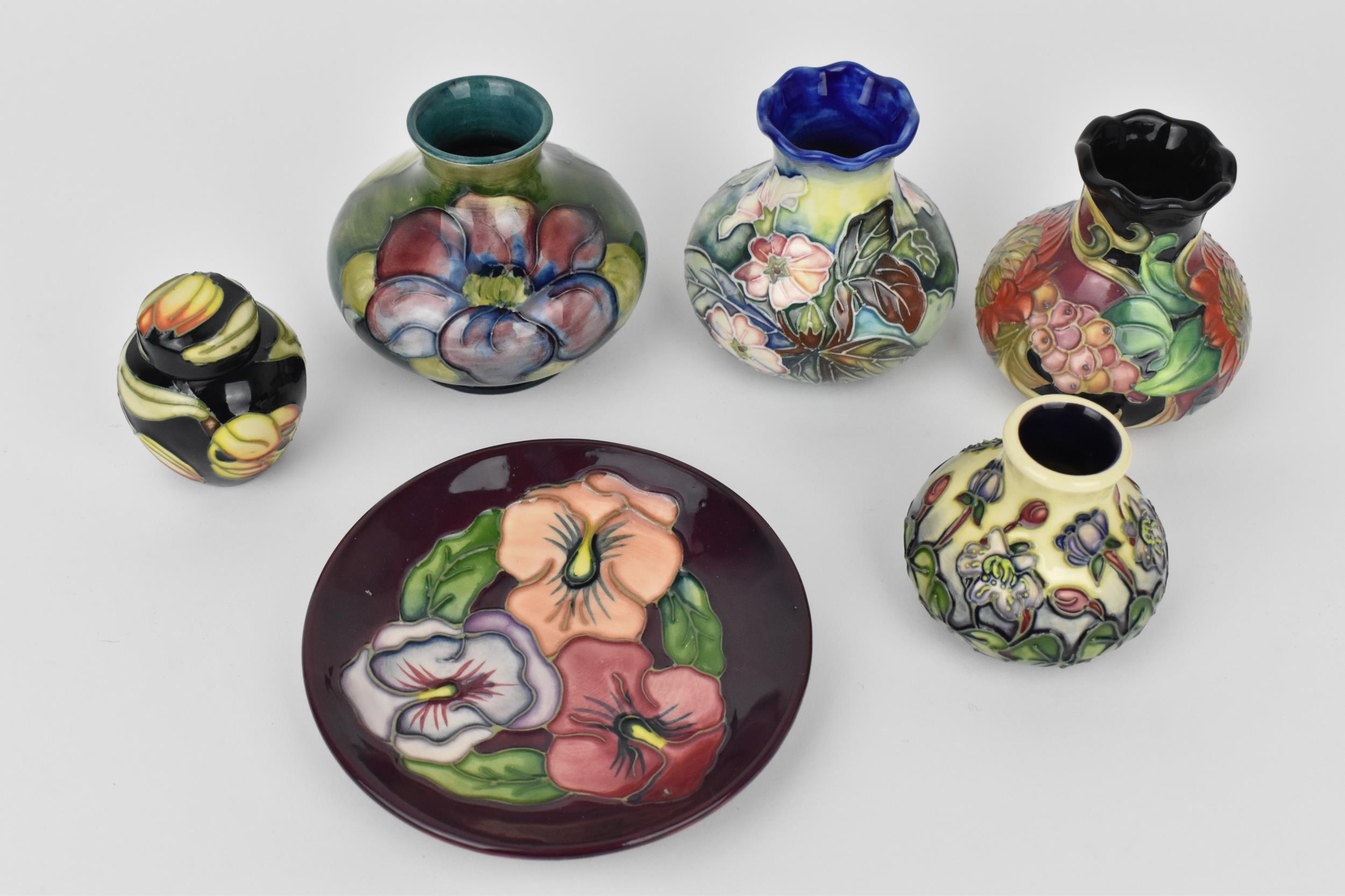 A small collection of Moorcroft ceramics, to include a squat vase in the 'Clematis' pattern on green ground, 7.5 cm high, a 1990s 'pansy' pattern saucer, a miniature vase by Emma Bossons in the 'Hepatica' pattern 1999, 6 cm high, a miniature lidded jar, 5.5 cm high, together with two Tupton ware vases with waved rim