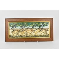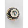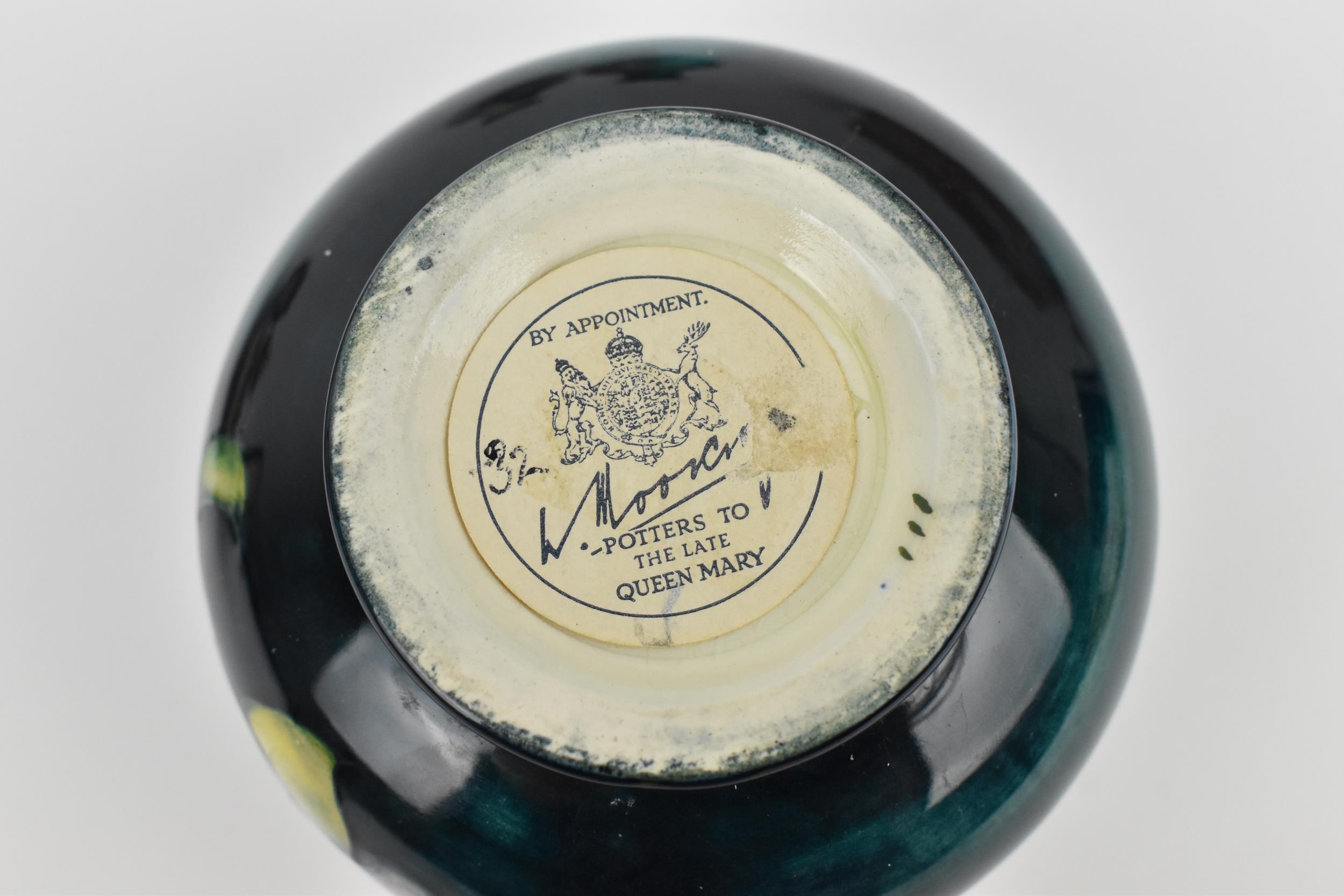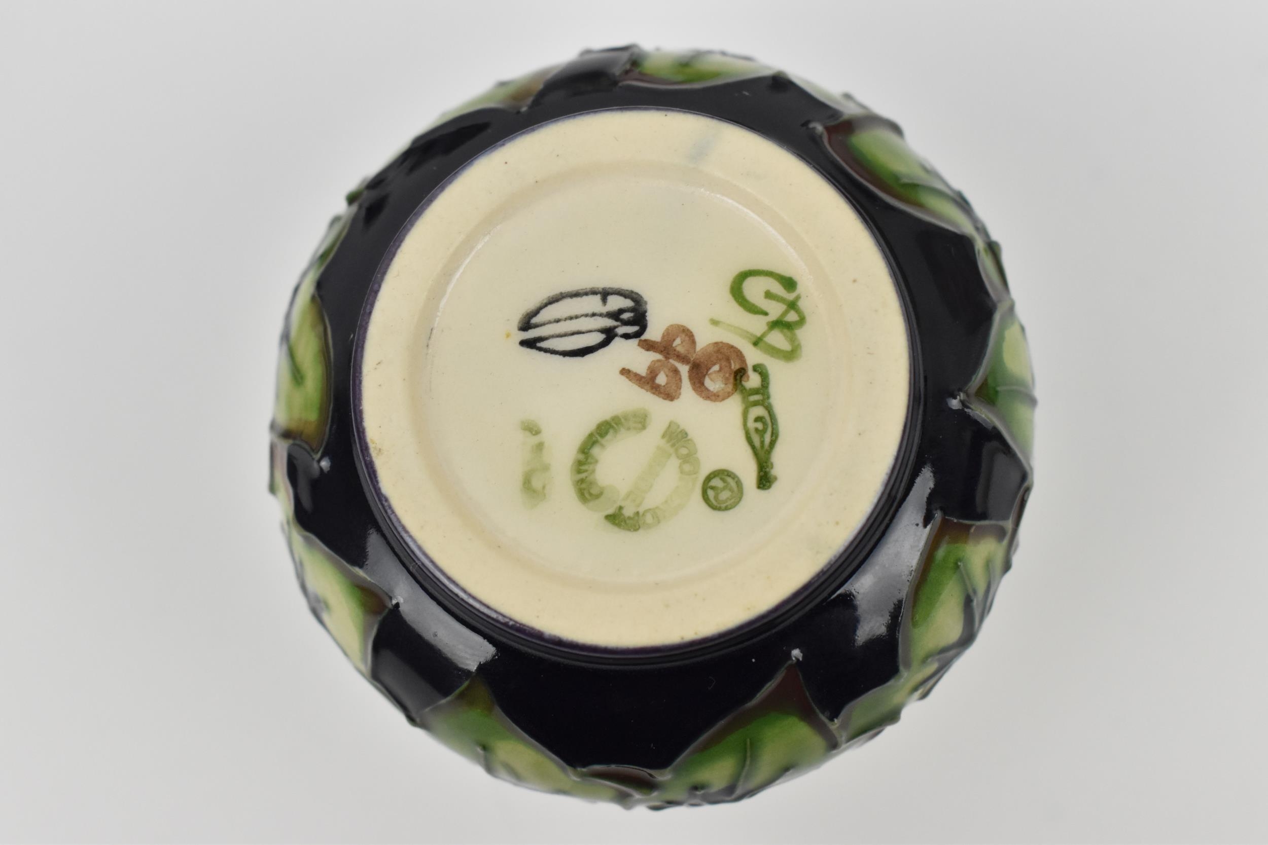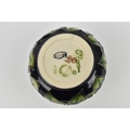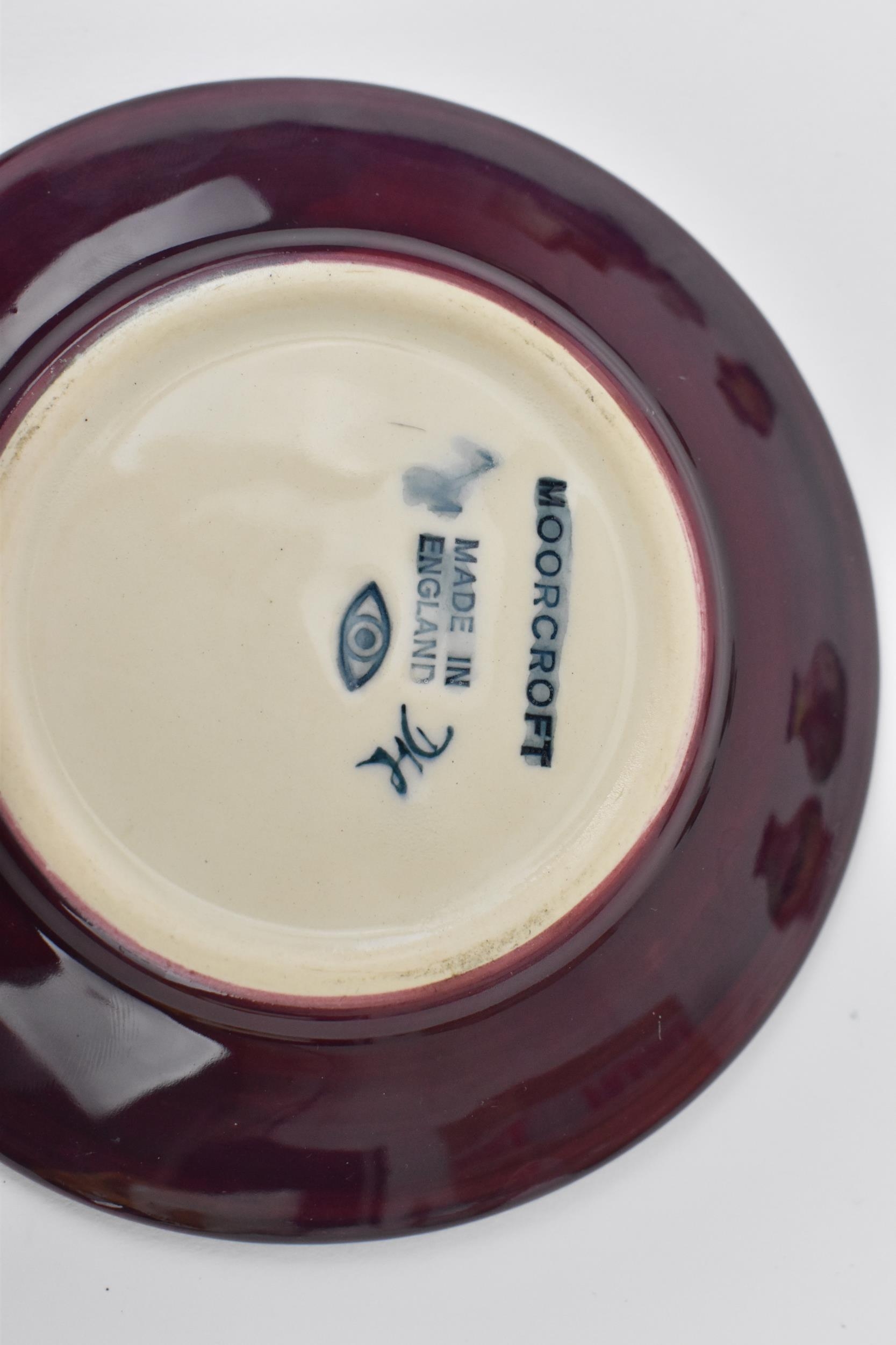 A small collection of Moorcroft ceramics, to include a squat vase in the 'Clematis' pattern on green ground, 7.5 cm high, a 1990s 'pansy' pattern saucer, a miniature vase by Emma Bossons in the 'Hepatica' pattern 1999, 6 cm high, a miniature lidded jar, 5.5 cm high, together with two Tupton ware vases with waved rim