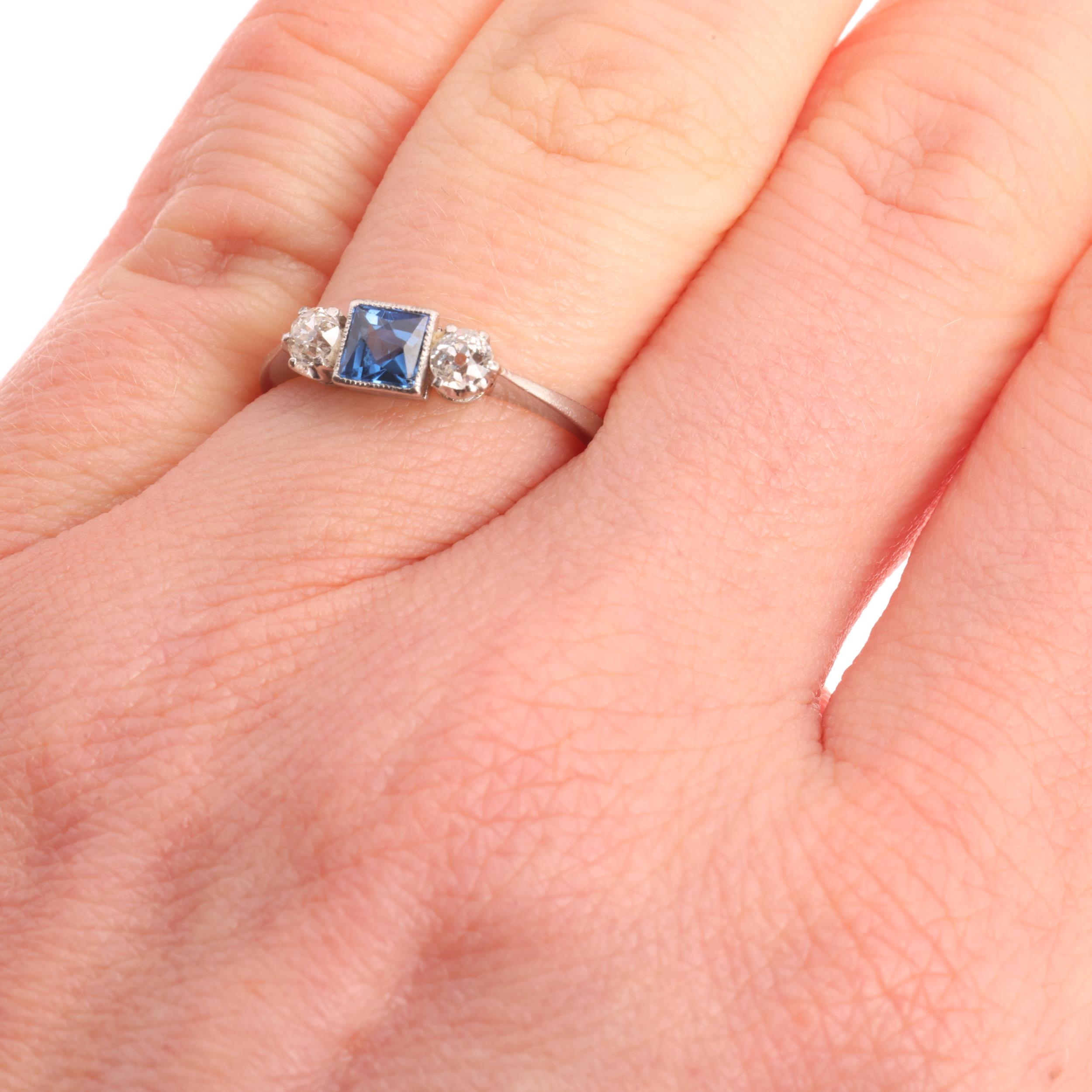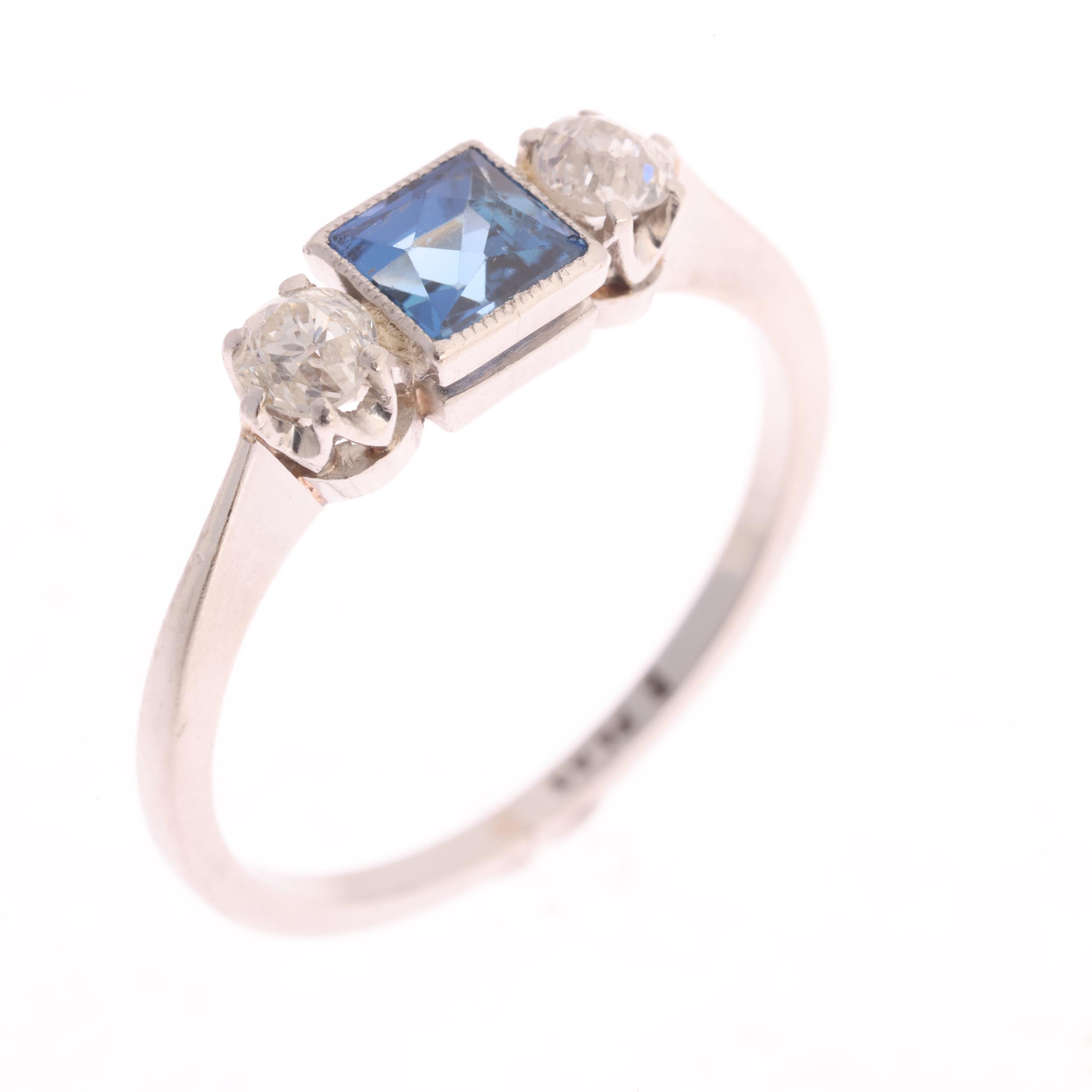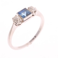 A platinum three stone sapphire and diamond ring, millegrain set with 0.20ct square scissor-cut sapphire flanked by old European-cut diamonds, total diamond content approx 0.20ct, setting height 4.6mm, size J, 2.6g