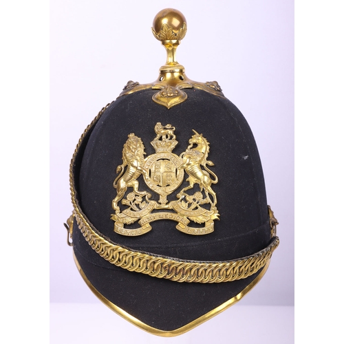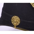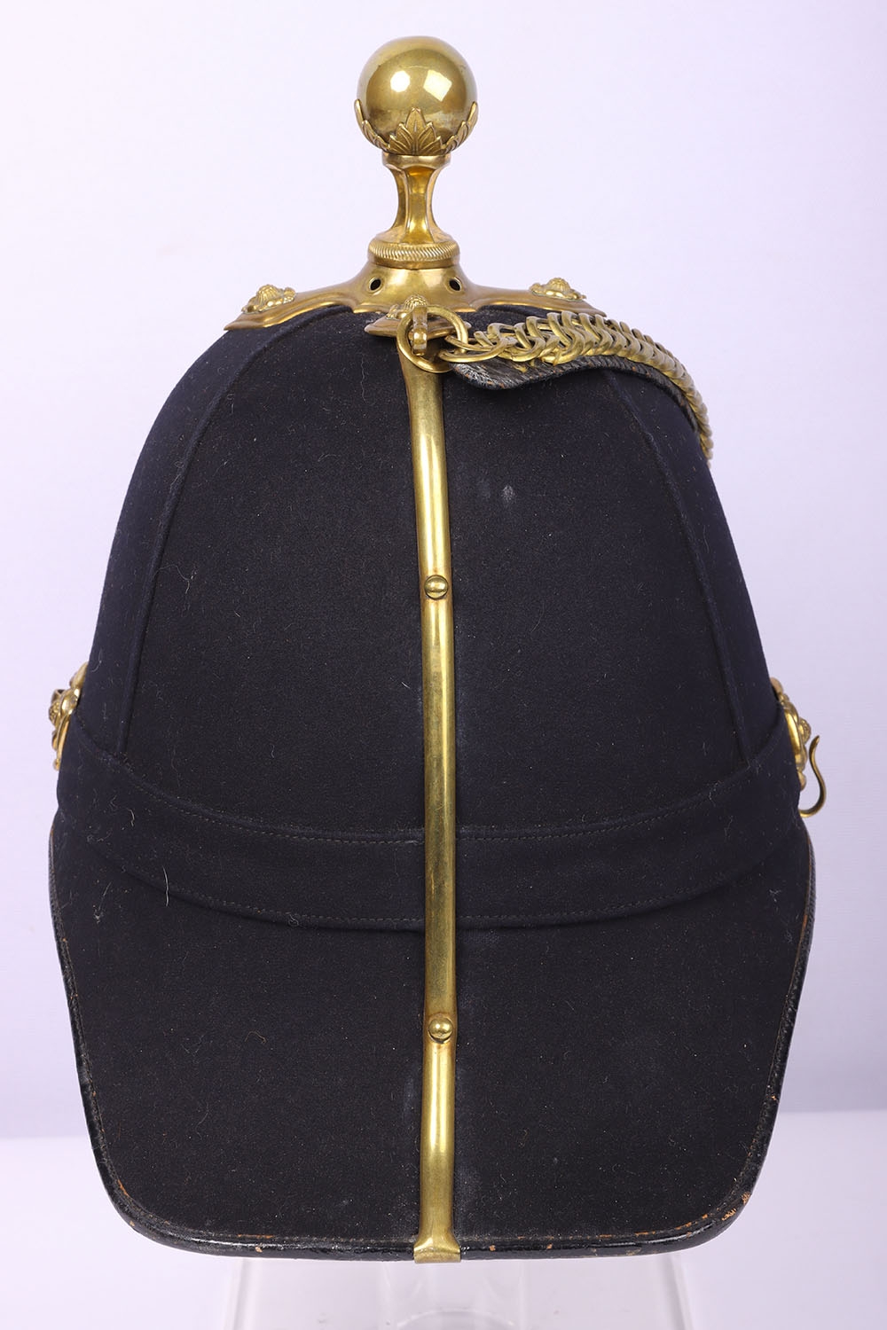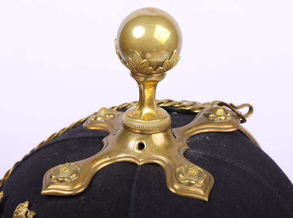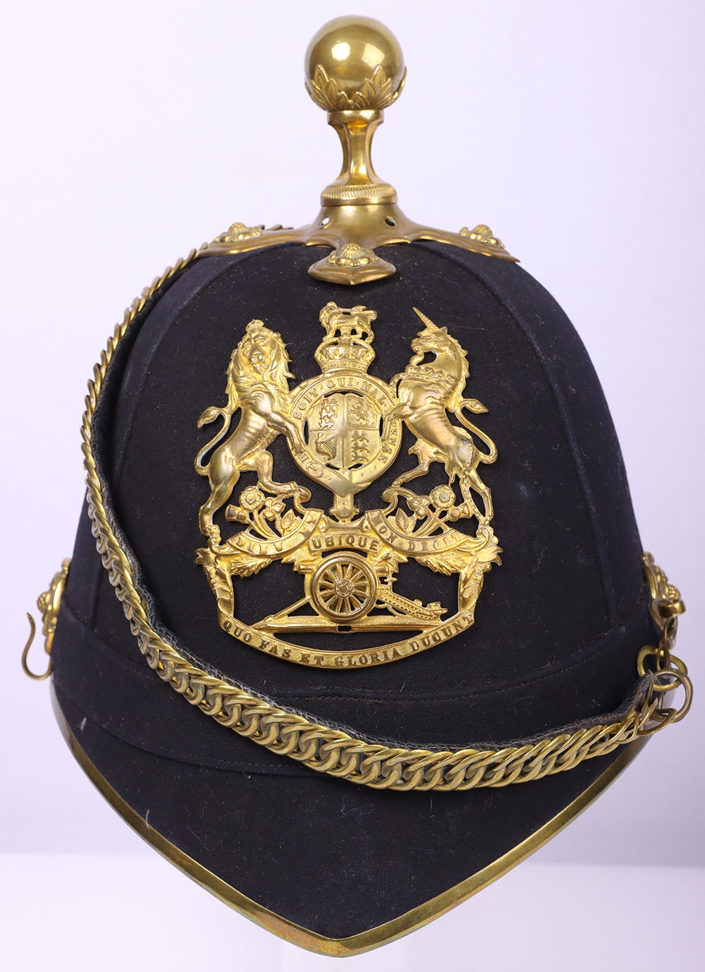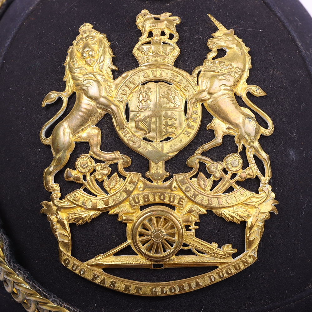 Post 1902 Royal Artillery Officers Home Service Helmet, good example of a blue cloth officers home service helmet with gilt metal kings crown Royal Artillery helmet plate to the centre. Rosette side bosses with linked chin chain. Cruciform spike base and ball top. Tan leather sweatband to the interior but no lining.