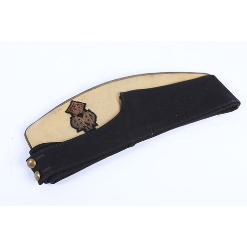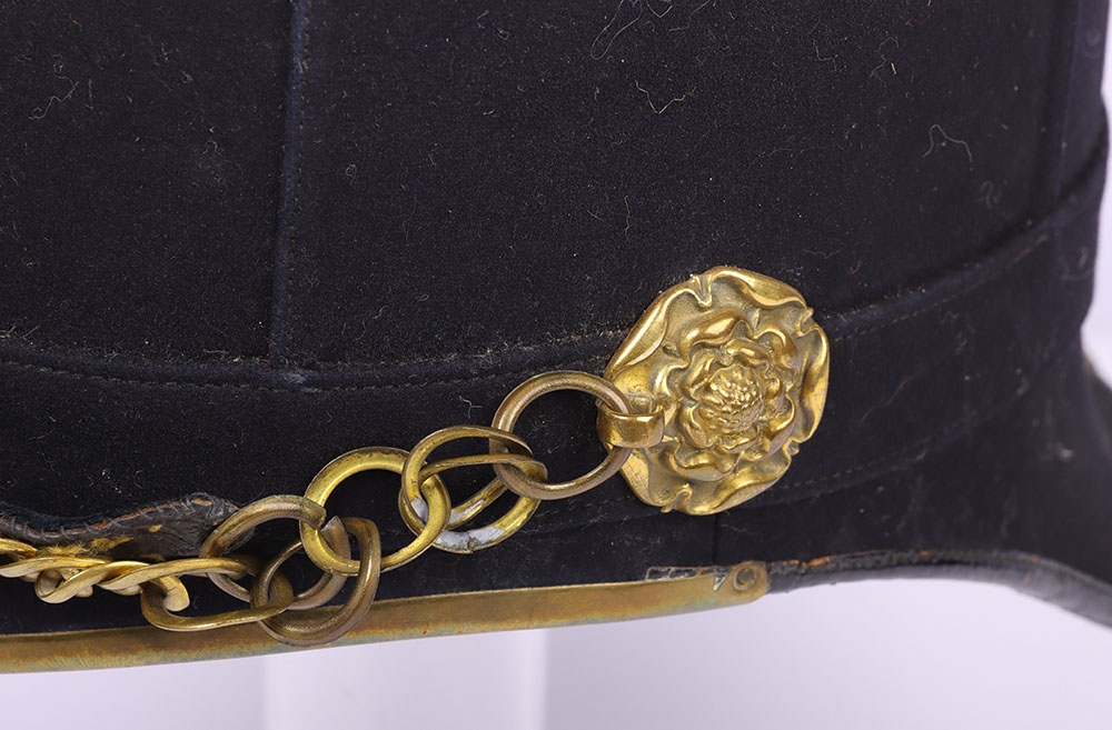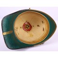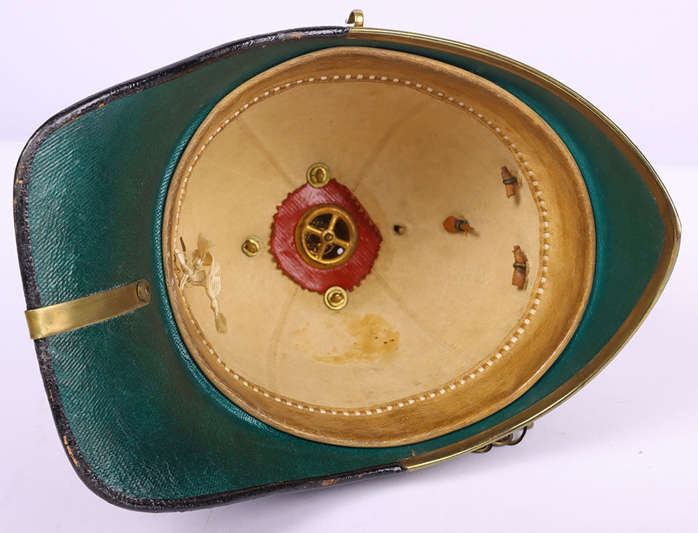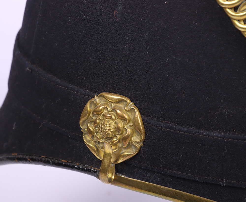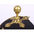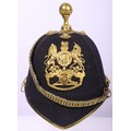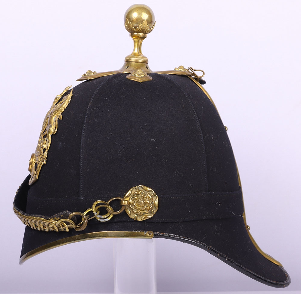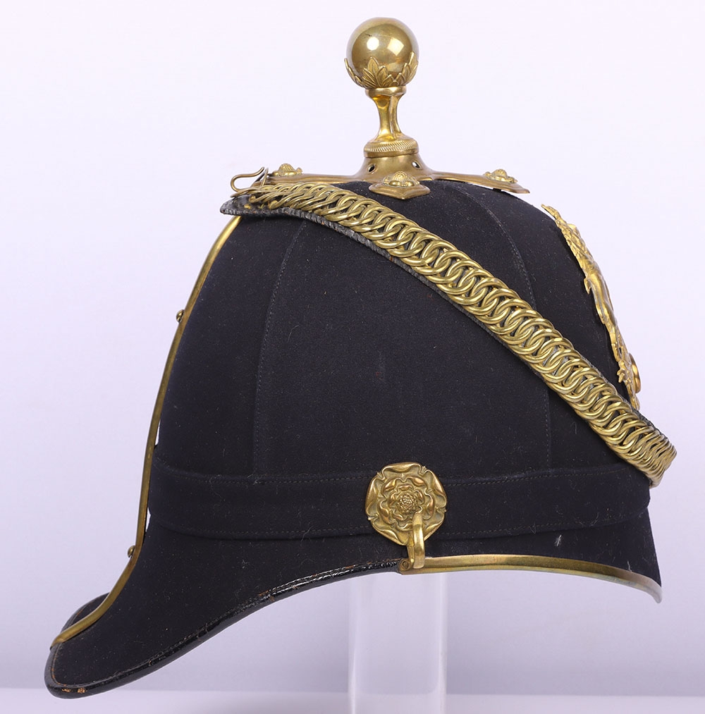 Post 1902 Royal Artillery Officers Home Service Helmet, good example of a blue cloth officers home service helmet with gilt metal kings crown Royal Artillery helmet plate to the centre. Rosette side bosses with linked chin chain. Cruciform spike base and ball top. Tan leather sweatband to the interior but no lining.