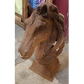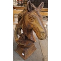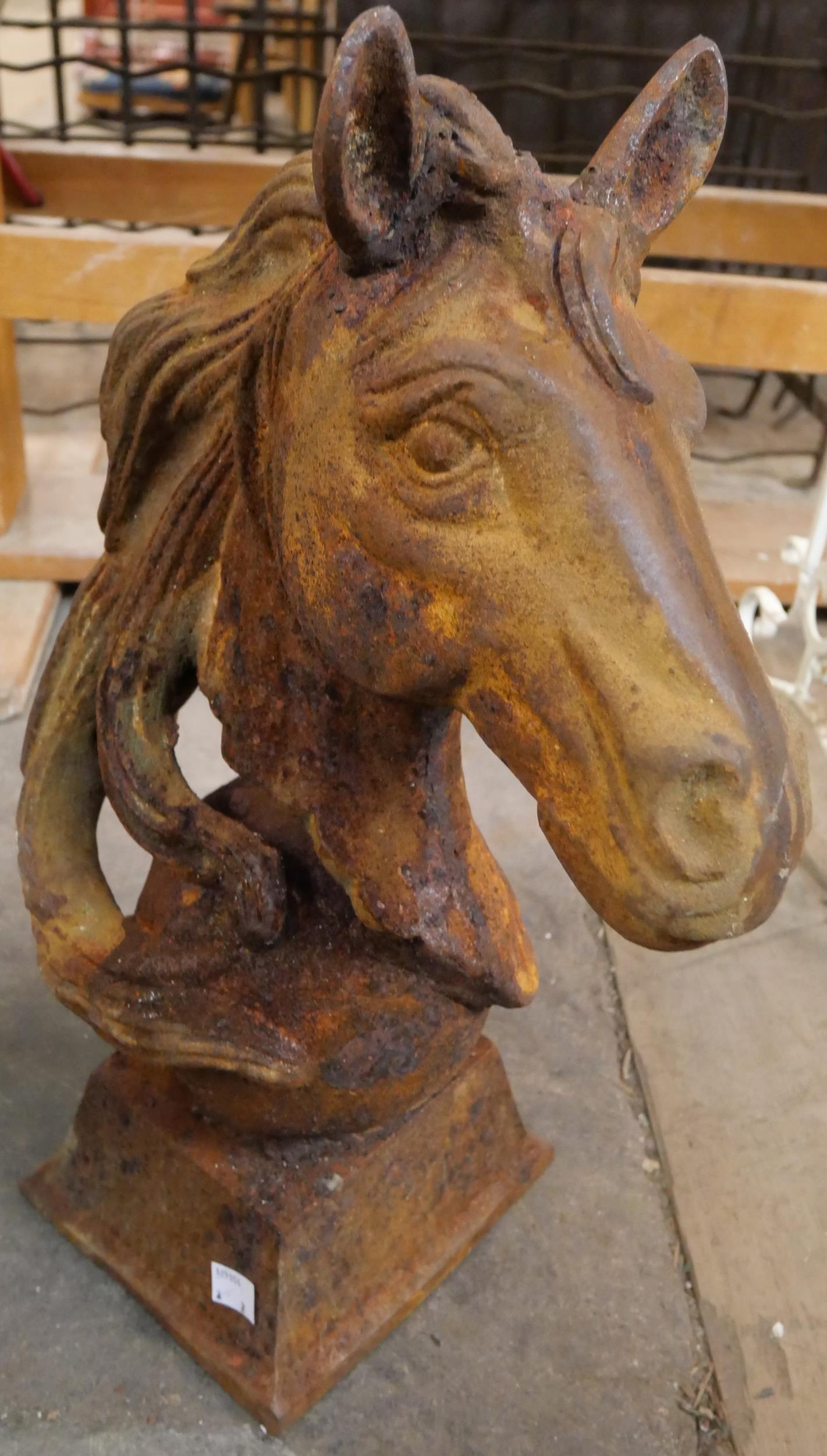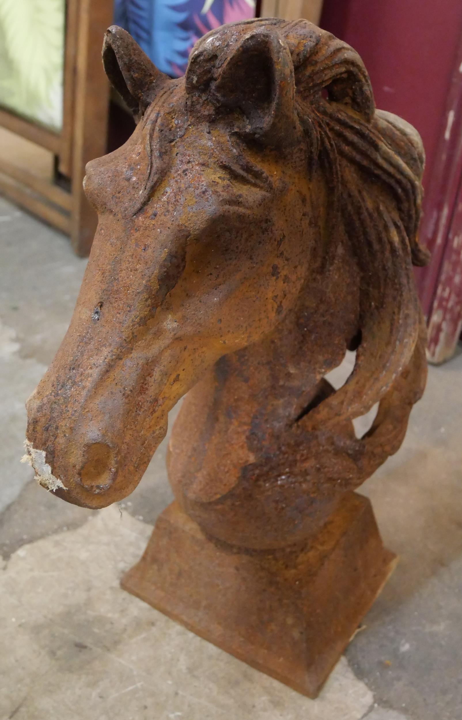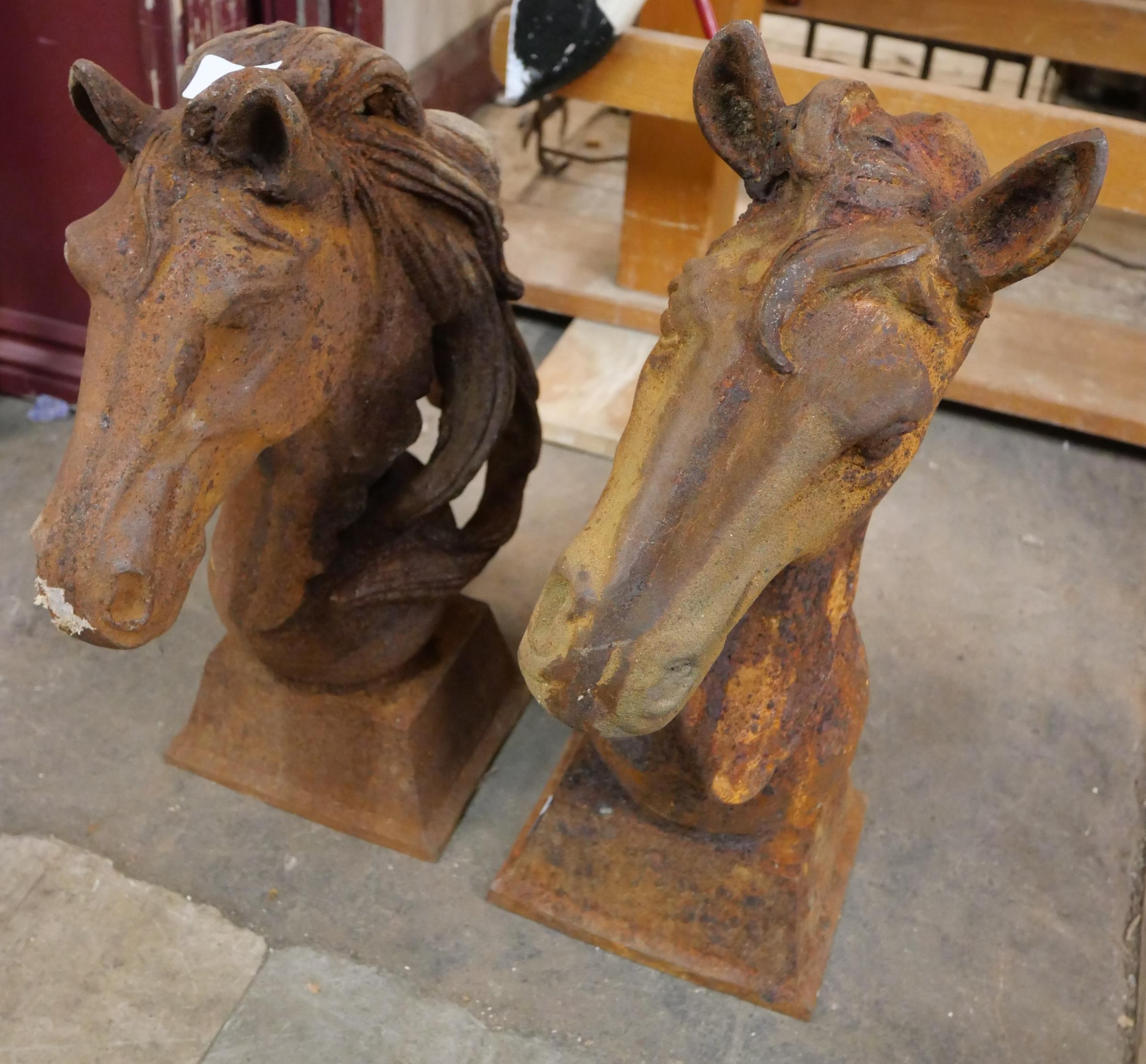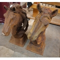 A pair of cast iron horse's head garden ornaments