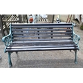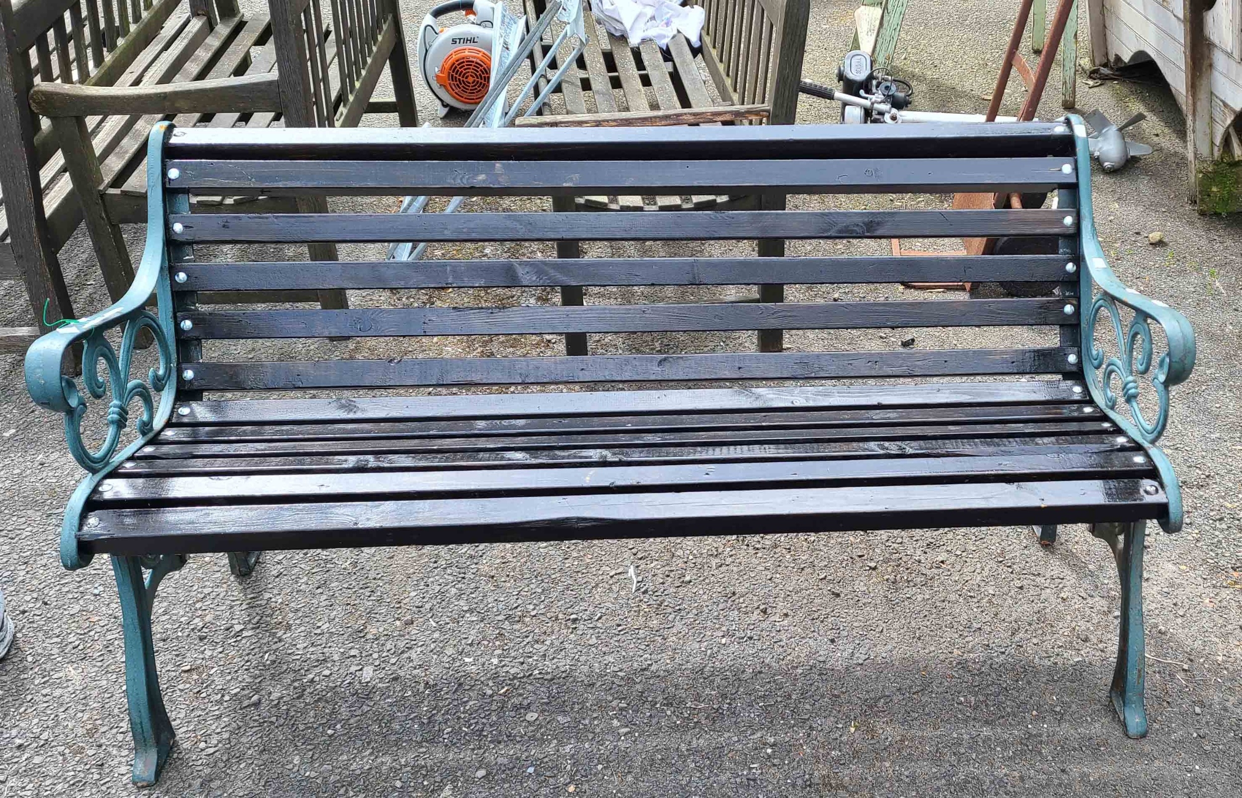 A Victorian garden bench with decorative cast iron ends and slatted wood seat and backrest
