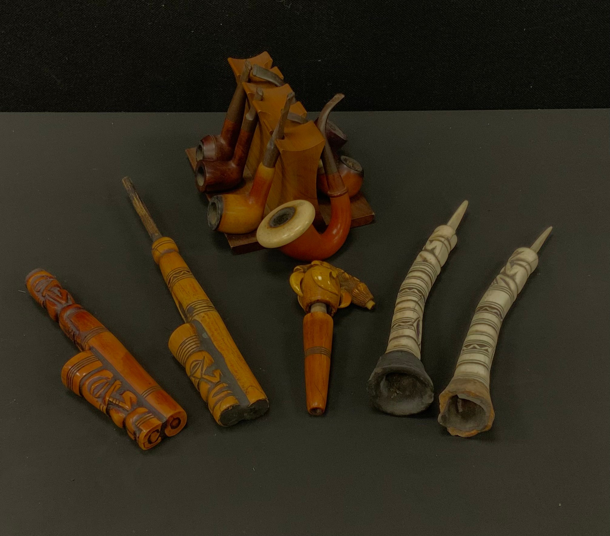 Pipes & Smoking interest - a meerschaum pipe the bowls as an Eagles claw, others Harrison & Simmonds, Wilcox's Sharrow, briar, etc, eight section pipe rack, carved bone tribal pipes etc