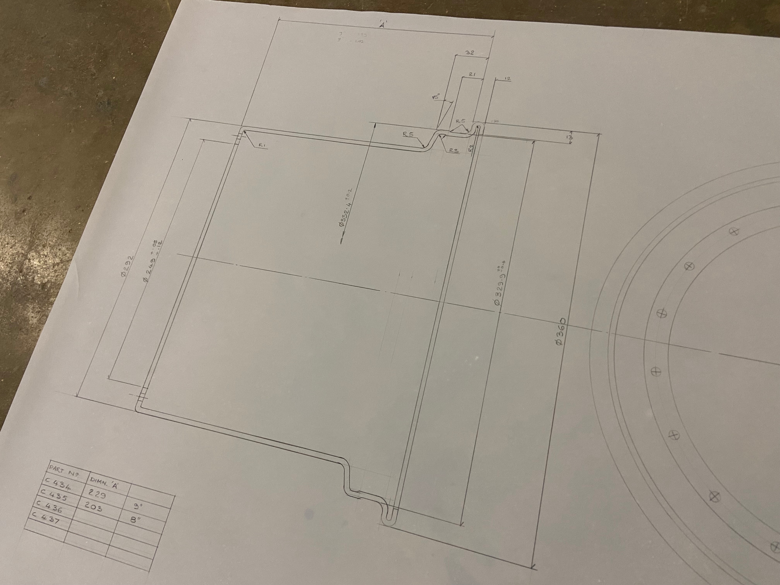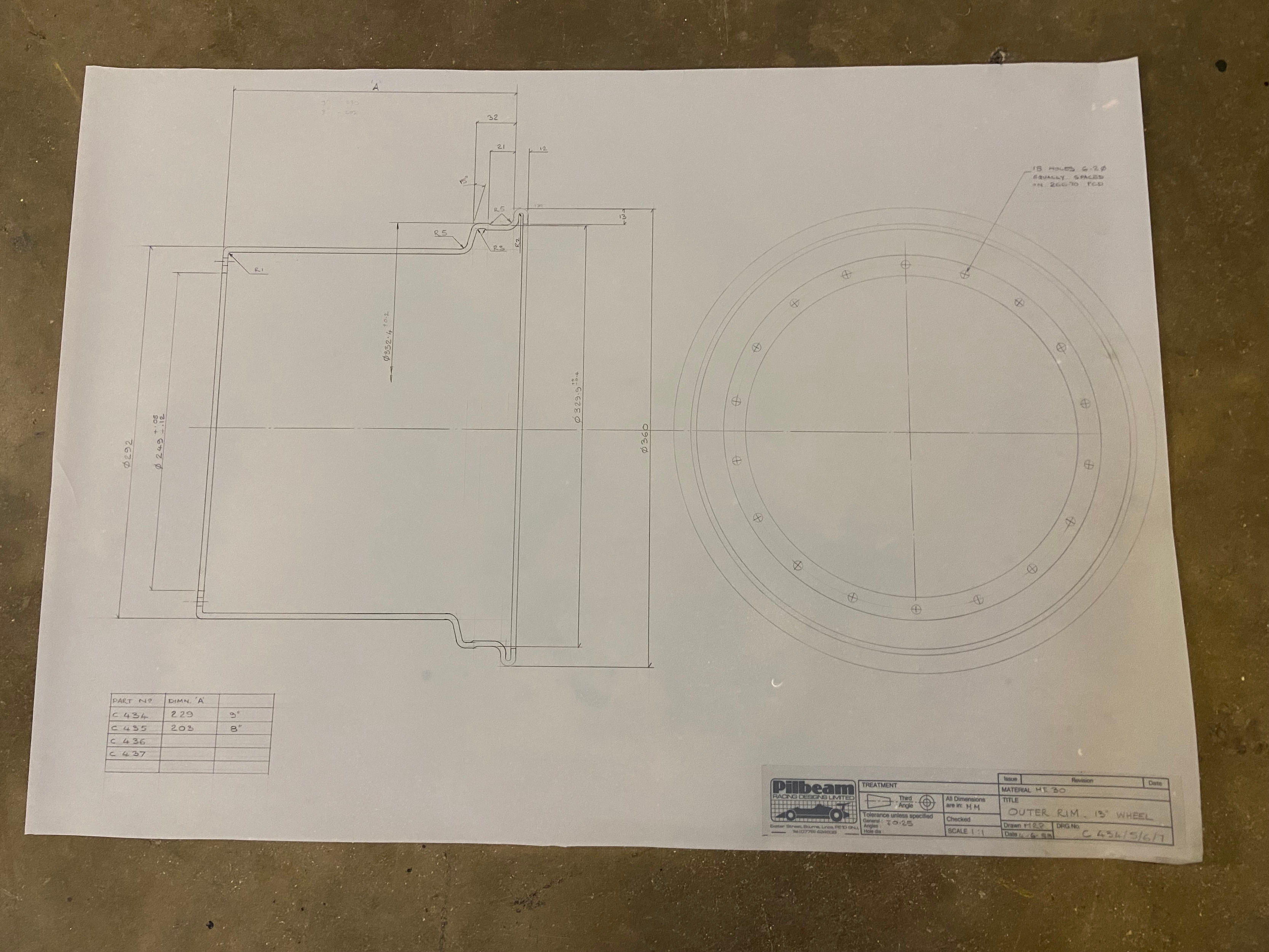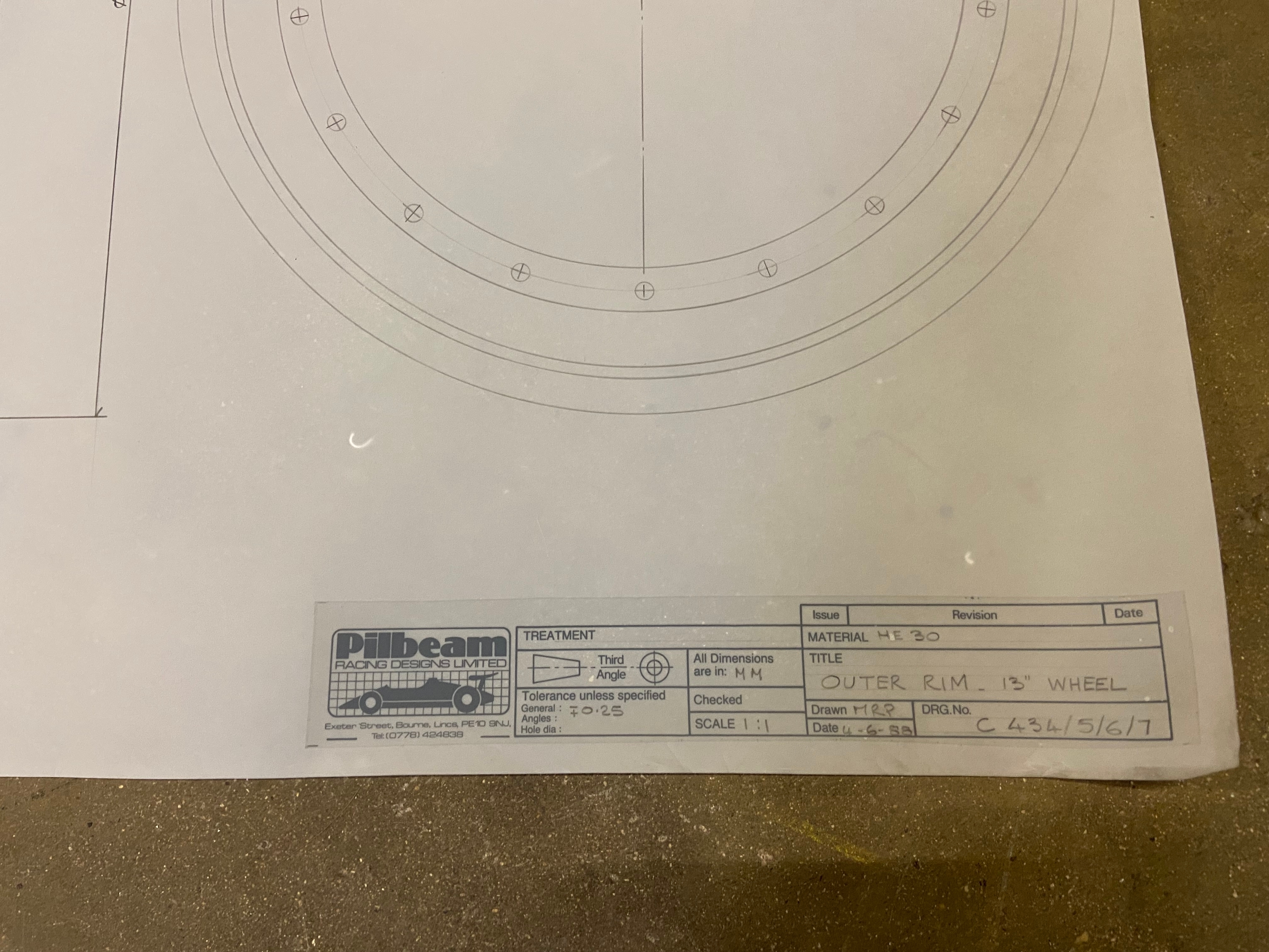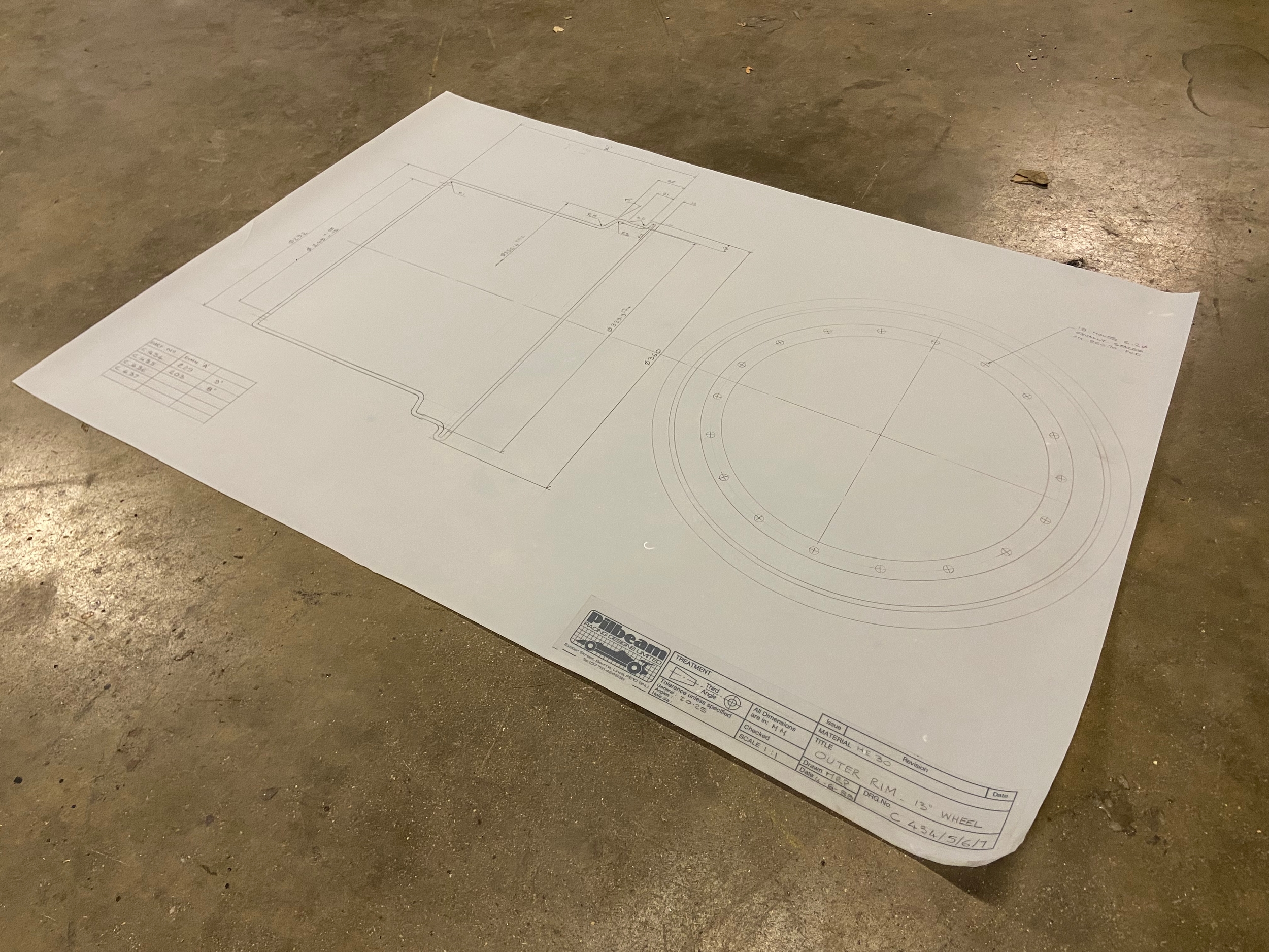 Original Mike Pilbeam technical drawing for the outer rim of the Pilbeam 13” racing wheel. 1.1 scale, C size (84cm x 60cm). Dated June ‘88.