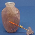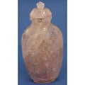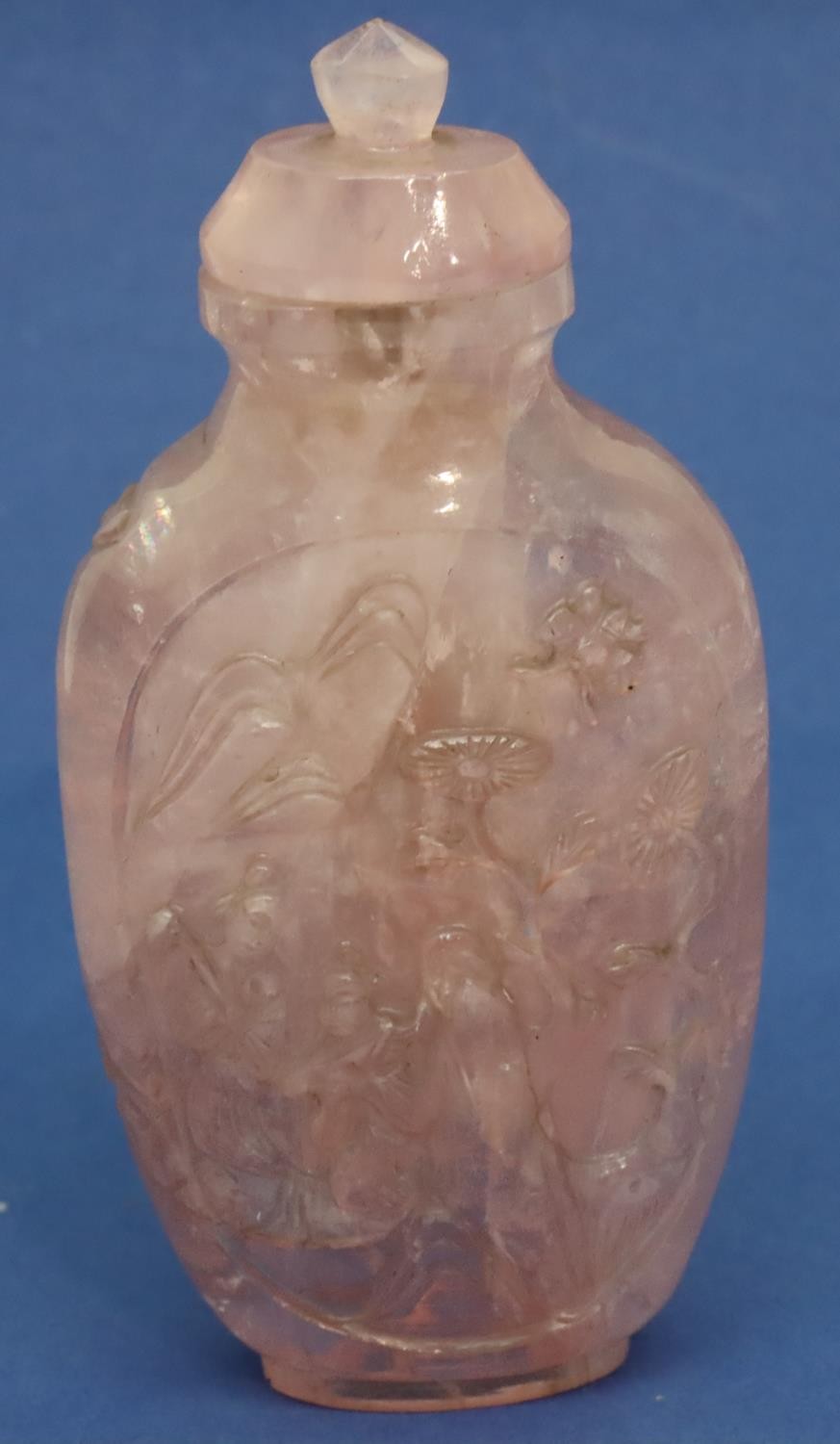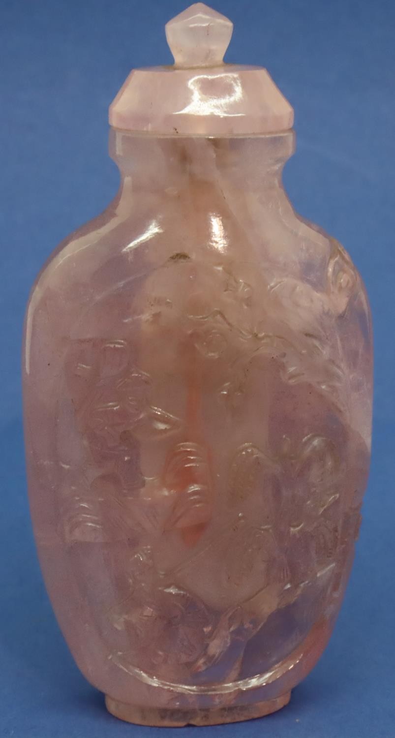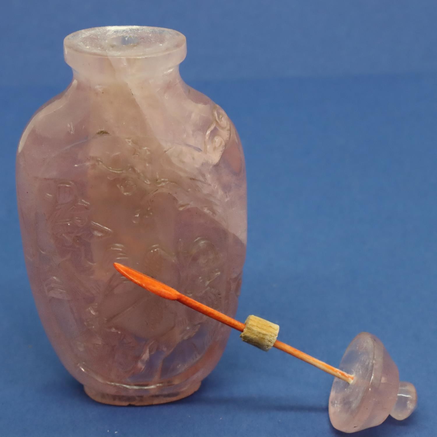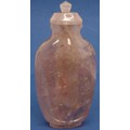 Rose quartz Chinese snuff bottle with dipper, carved with foliage and flowers, H: 93 mm. P&P Group 1 (£14+VAT for the first lot and £1+VAT for subsequent lots)