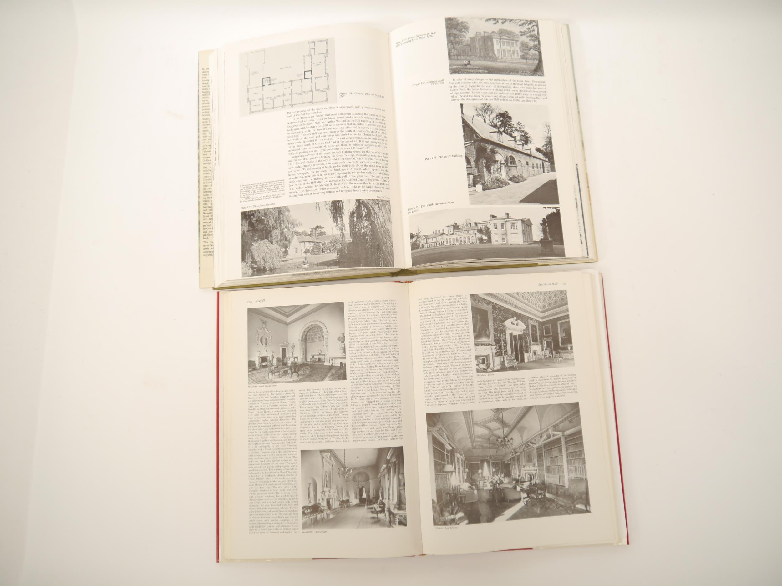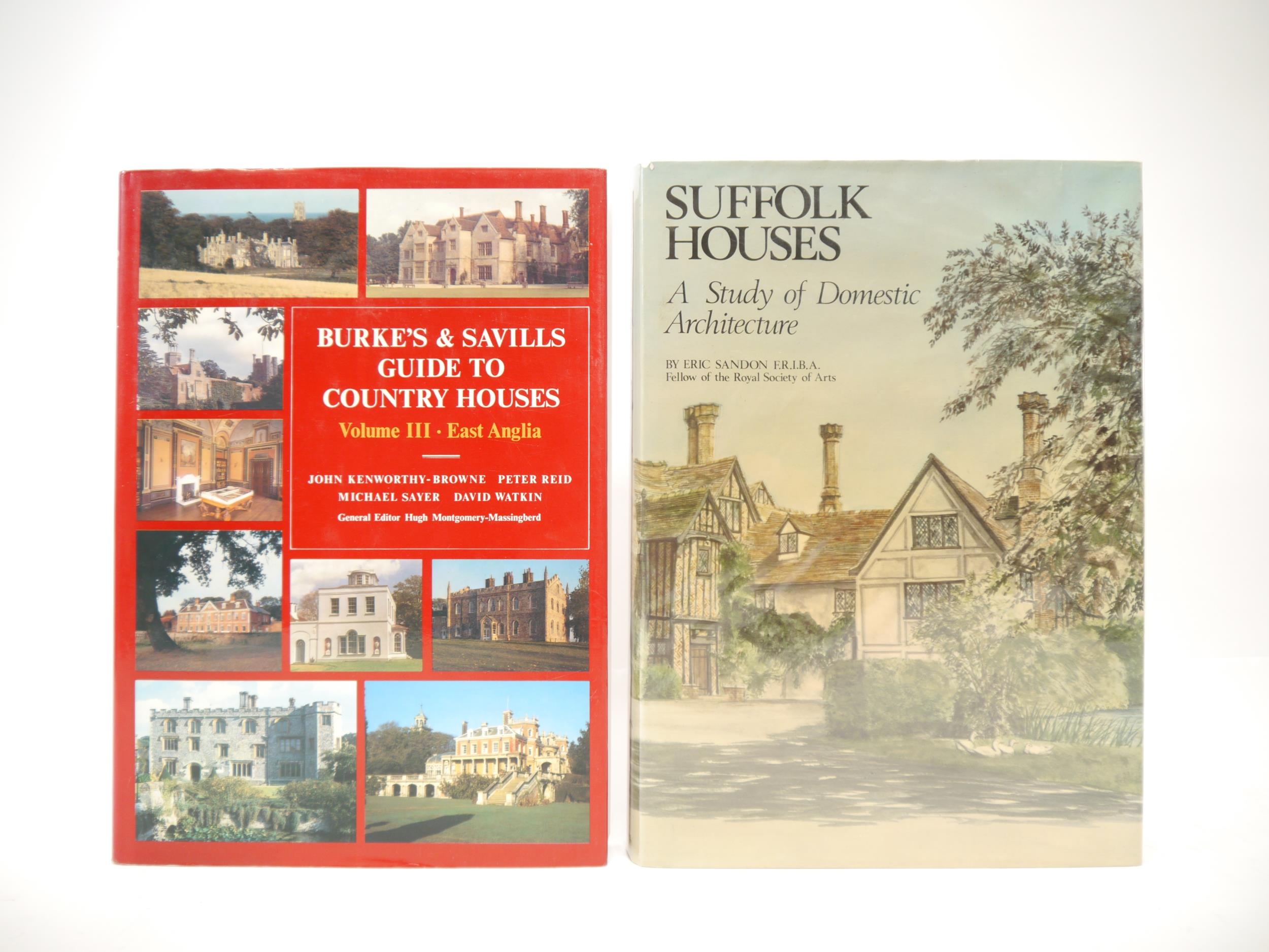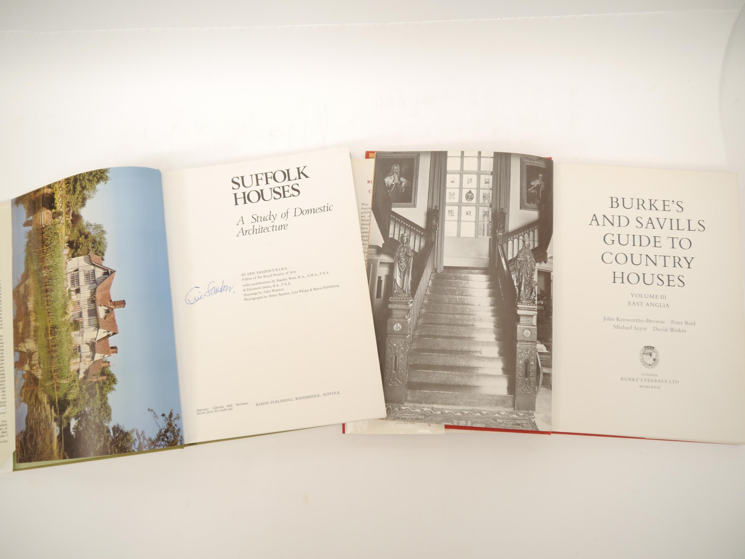 Eric Sandon: 'Suffolk Houses. A Study of Domestic Architecture', Woodbridge, 1984, signed by author to title page, colour & b/w photographic ills. and diagrams throughout, original cloth gilt, dust wrapper; J. Kenworthy-Brown et al: 'Burke's and Savills Guide to Country Houses. Volume III East Anglia', L, Burke's Peerage, 1981, 1st edition, b/w photographic ills. throughout, original cloth gilt, dust wrapper, some relevant material loosely inserted, from the library of Norman Scarfe, with his blindstamp to FFEP (2)