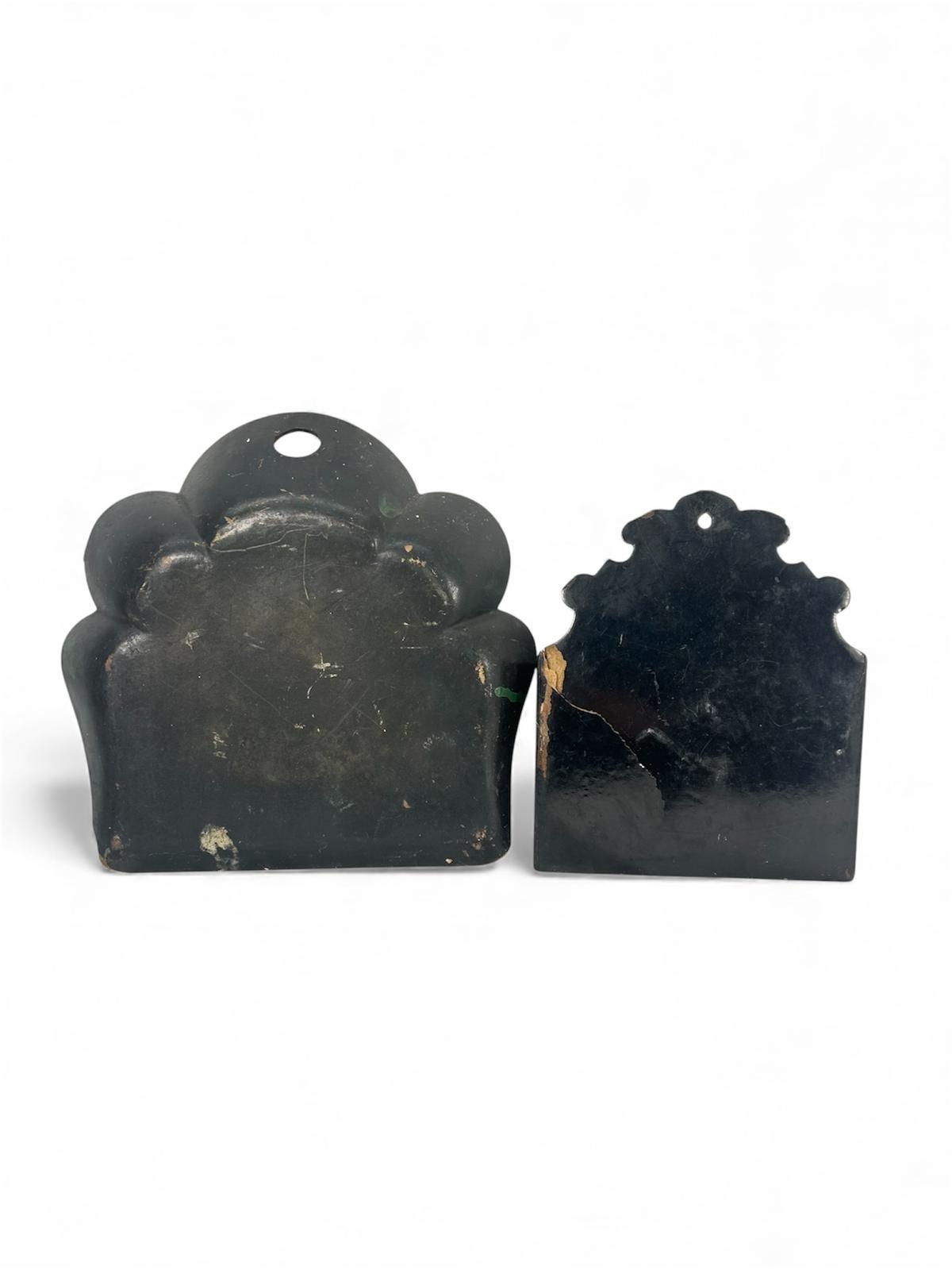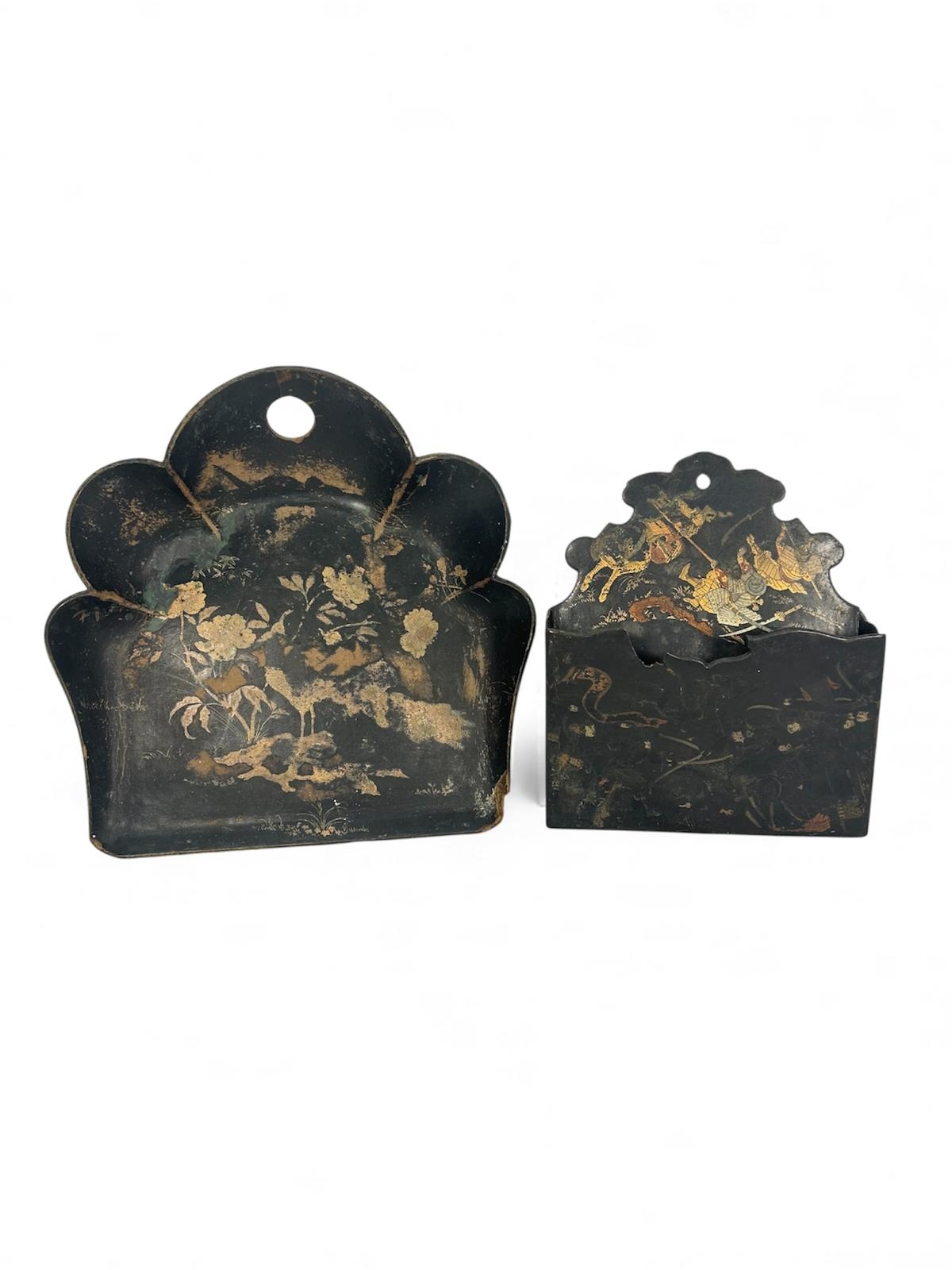 Antique black lacquered wooden crumb tray and matching letter holder with gilt Chinoiserie decoration. Late Victorian pieces with attractive aged wear and traditional hand-painted detail.