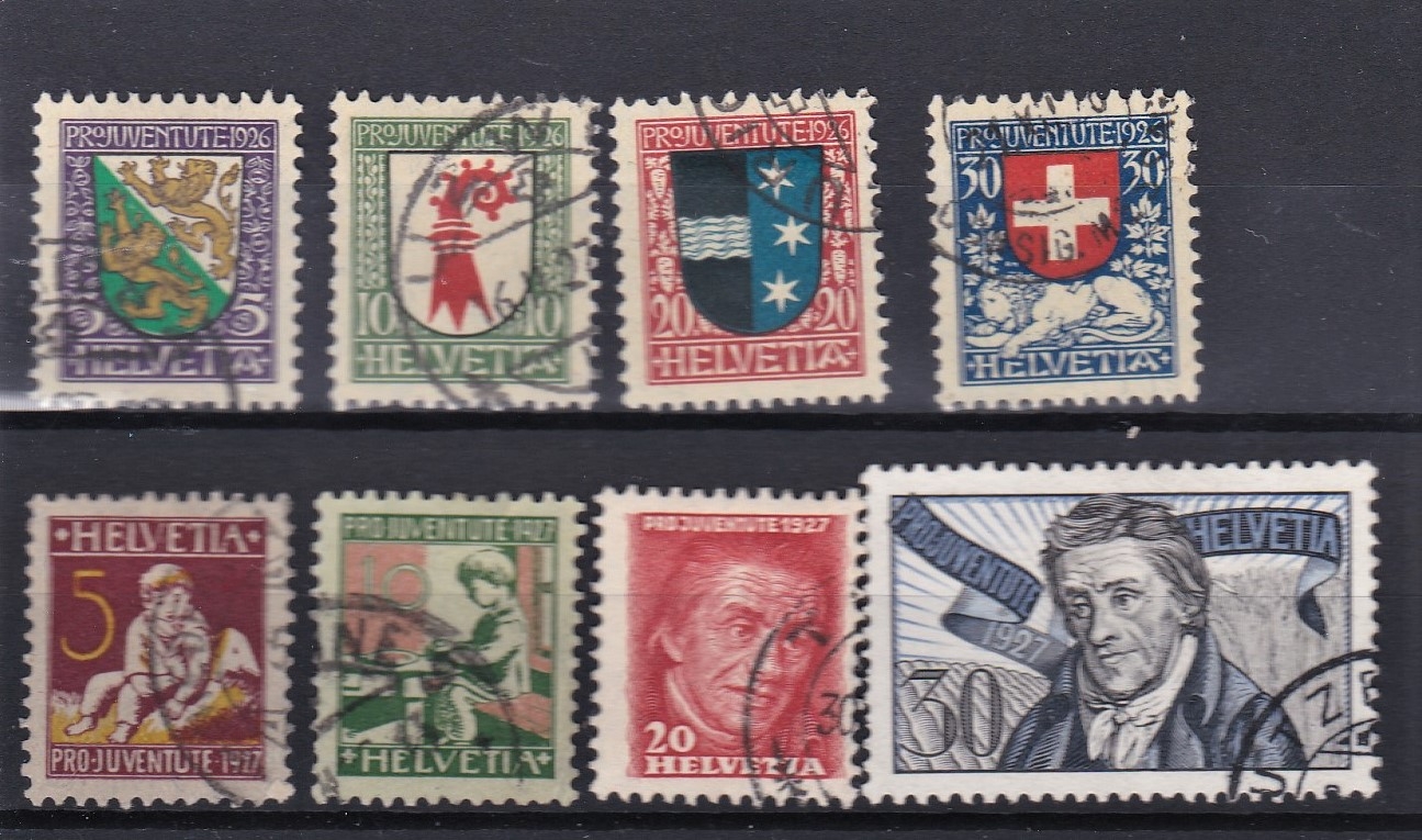 Switzerland 1926 Pro-Juventute Children's Fund SG J36-J39 used set Michel 218-221 Cat £25 and 1927 Pro-Juventute Children's Fund SG J40-J43 used set Michel 222-225 Cat £18