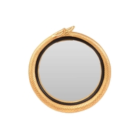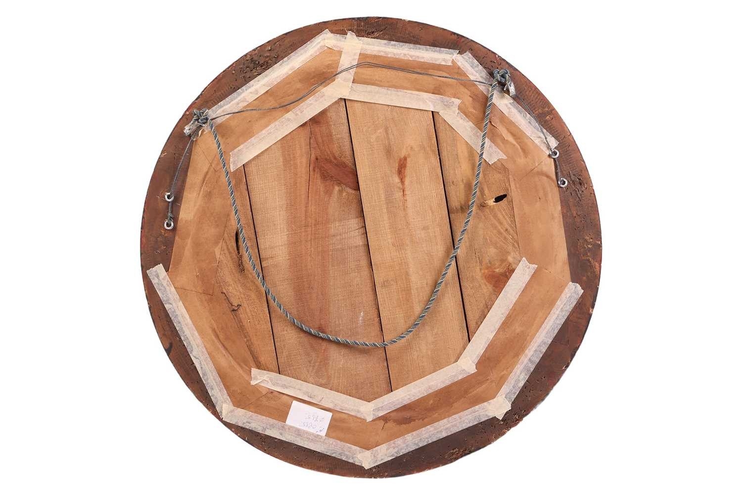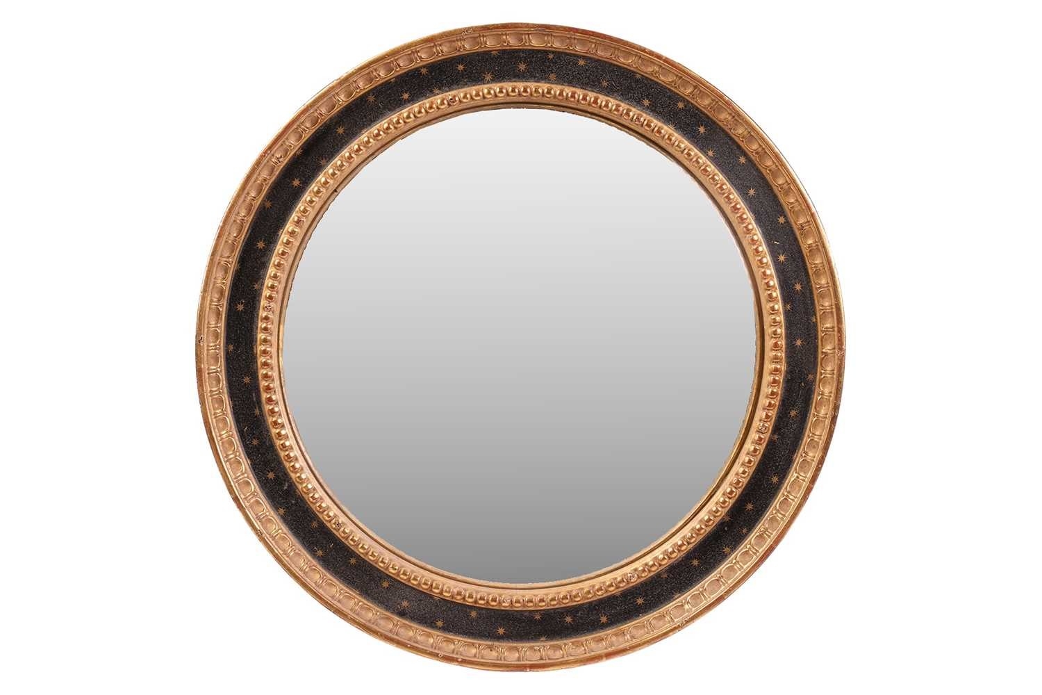 A large gilt circular convex wall mirror, the surround with white stars on an ebonised ground. 72 cm diameter.
