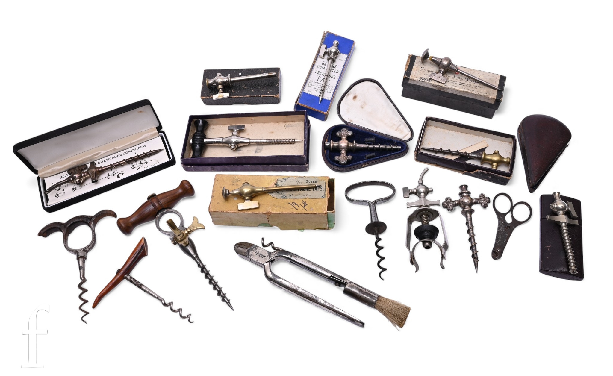 Ten various early 20th Century cased champagne and soda water taps various models, two others, four corkscrews, a bottle opener and a combination corkscrew, brush and clippers. (16)