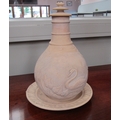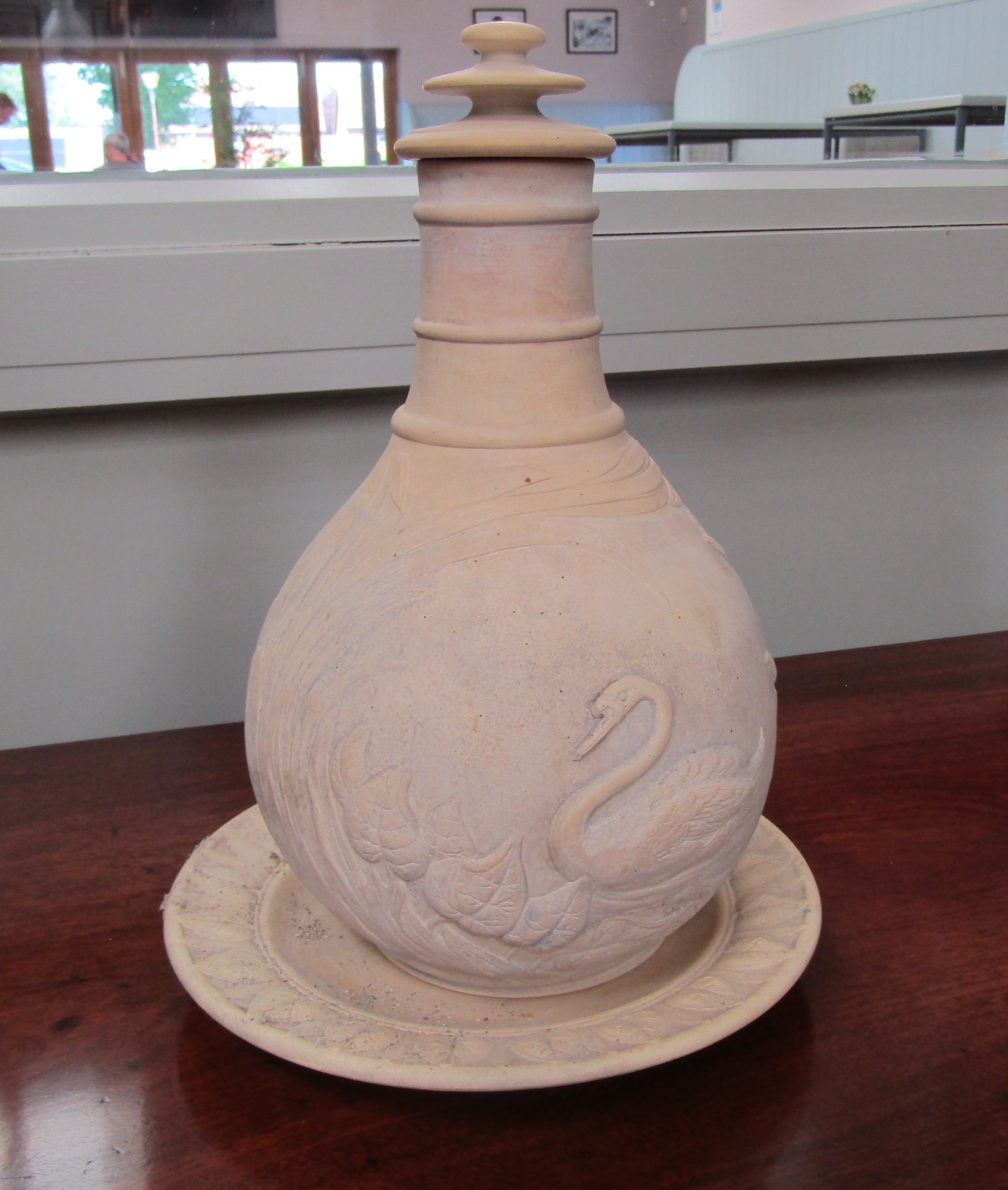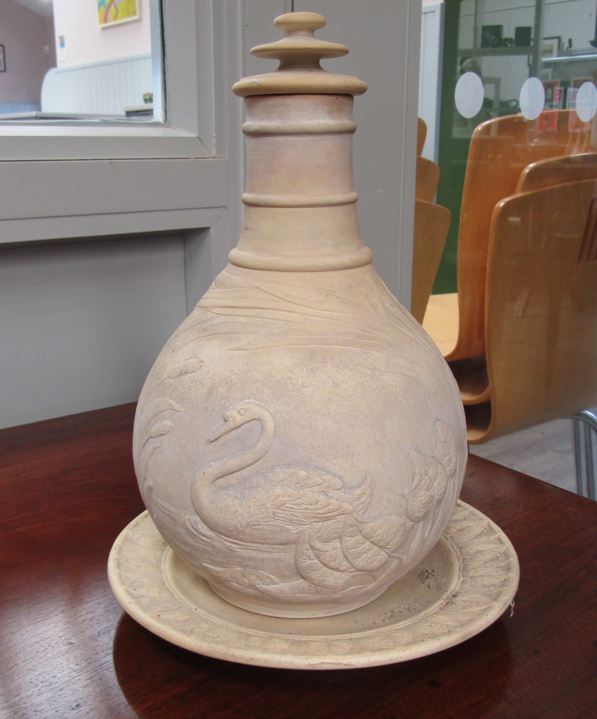 A cream pottery lidded vessel decorated with raised images of Swans in bulrushes and a saucer, 26.5cm tall (E) £30-40