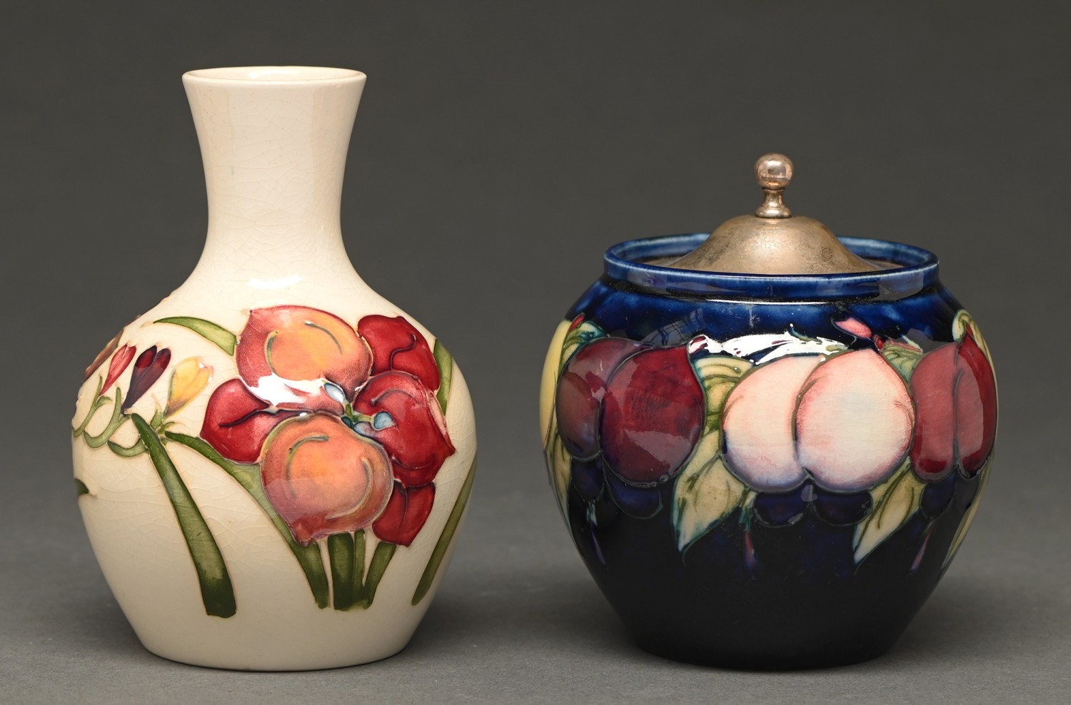 A Moorcroft Wisteria preserve pot and plated cover and a Moorcroft Africa Lily on white vase, c1925 and c1960, 88mm and 12.5cm, impressed and painted marks
