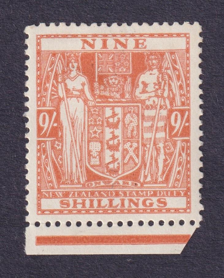 1931 Postal Fiscal 9/- brown-orange lower marginal mint, Cat £375, SG F176