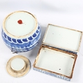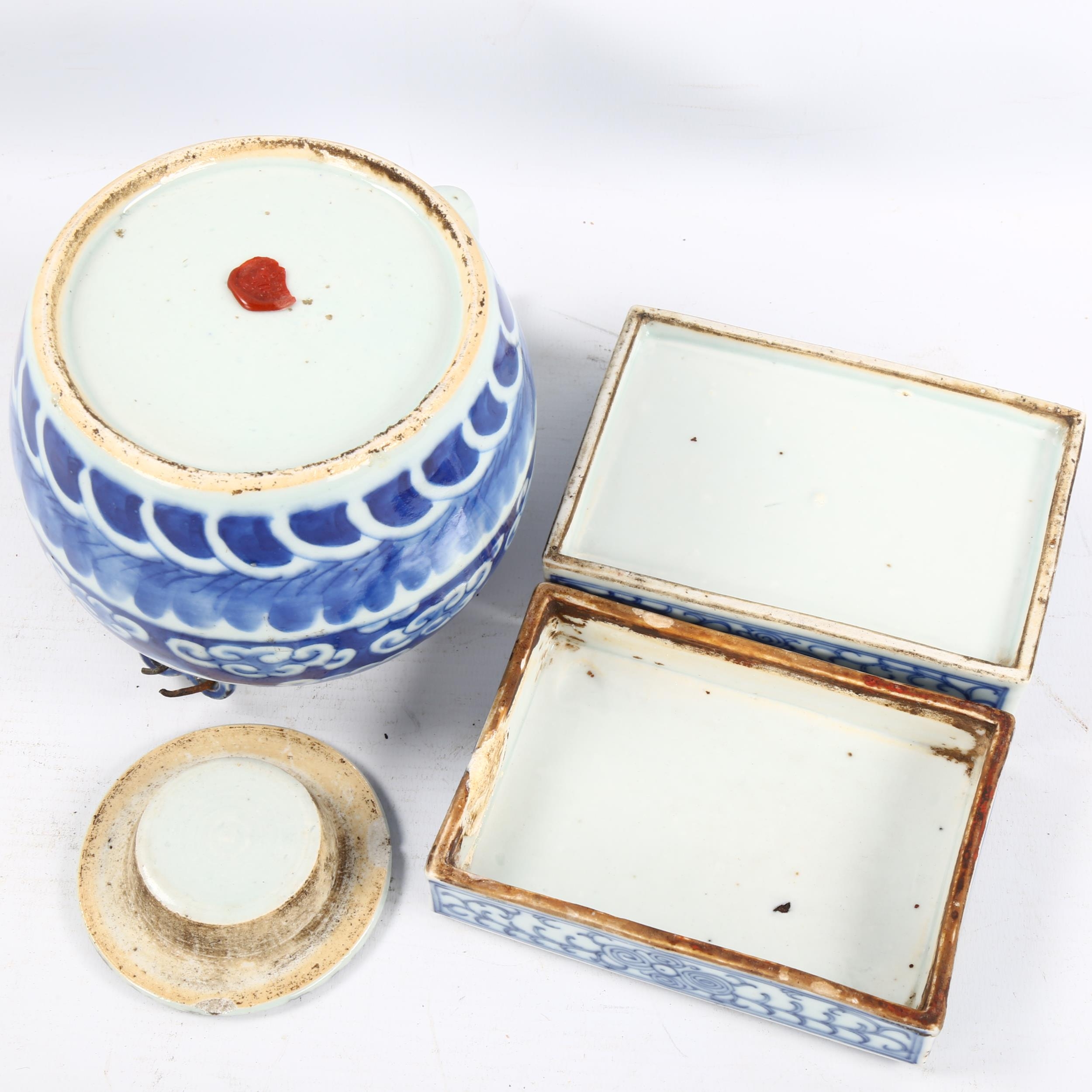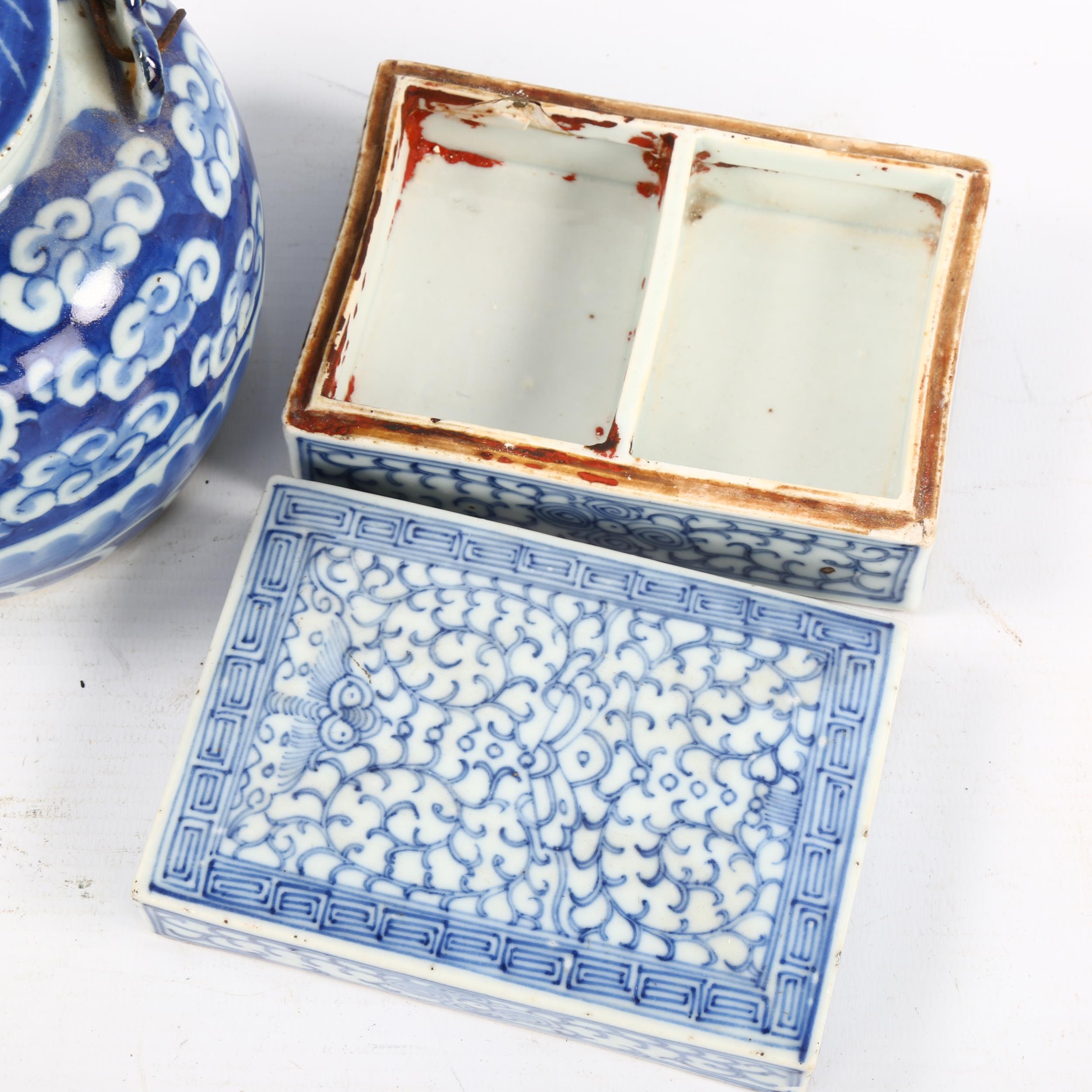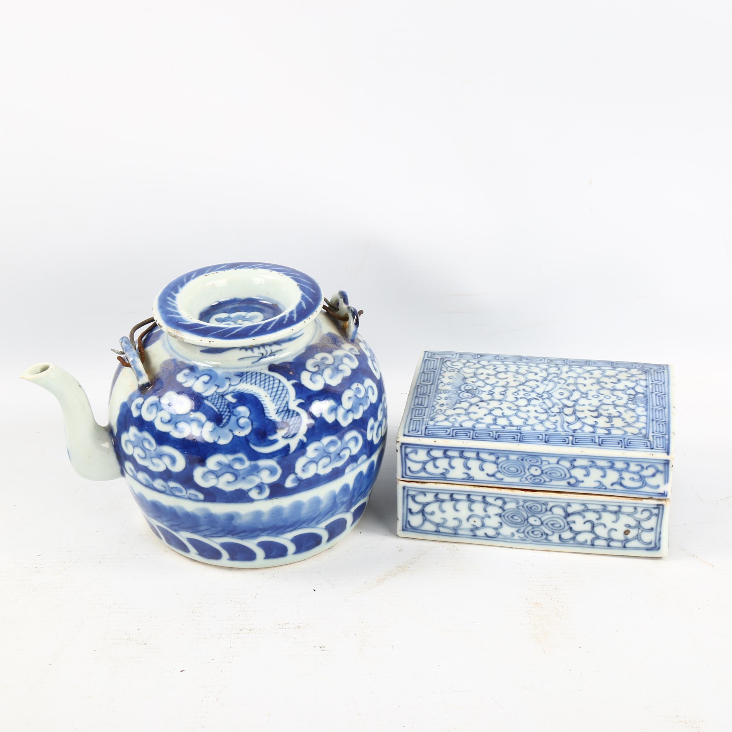A Chinese blue and white porcelain dragon teapot, height 12cm, and a blue and white porcelain rectangular box