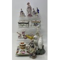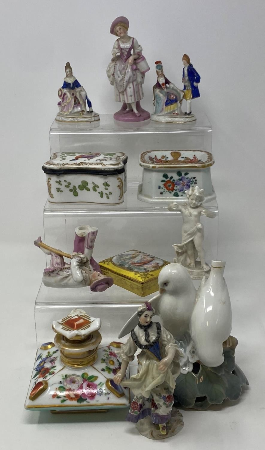 A Continental porcelain perfume bottle, decorated flowers, 8 cm wide, a porcelain box, 8 cm wide and various other ceramics (box)